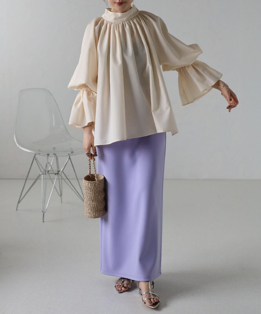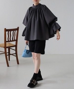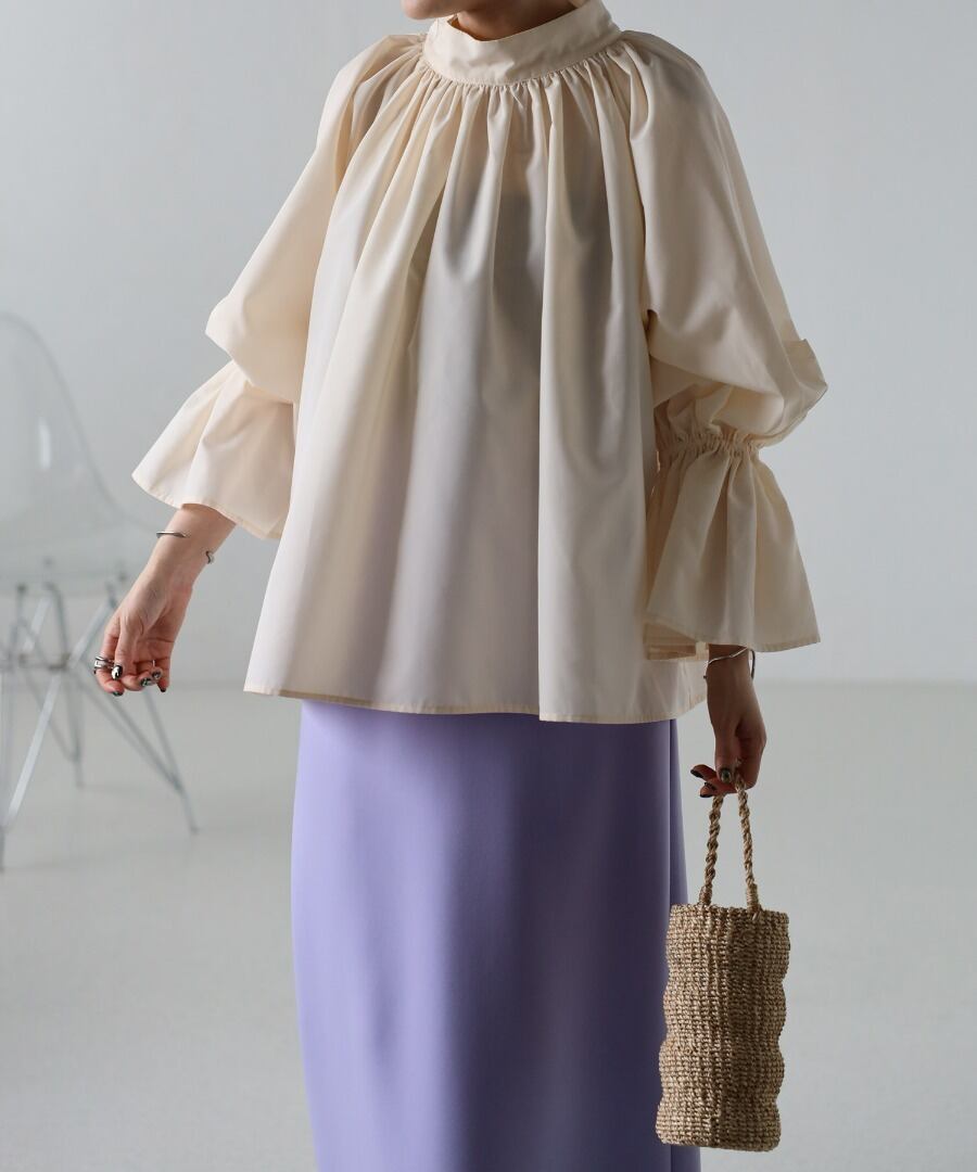 ネックギャザーから裾に広がるボリュームシルエットが華やかなギャザーブラウス。