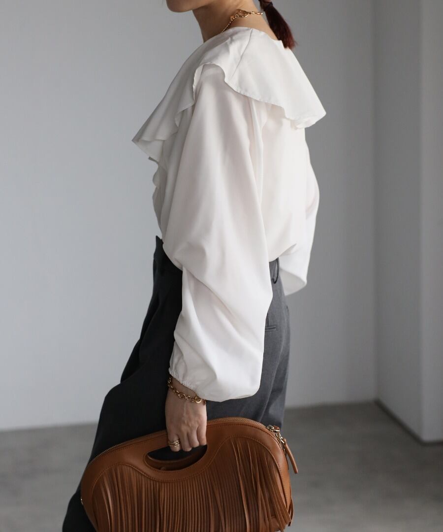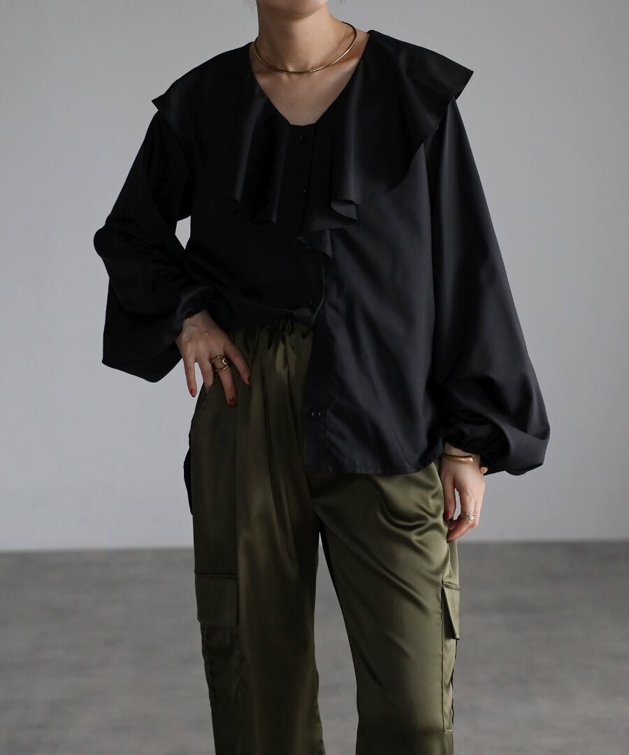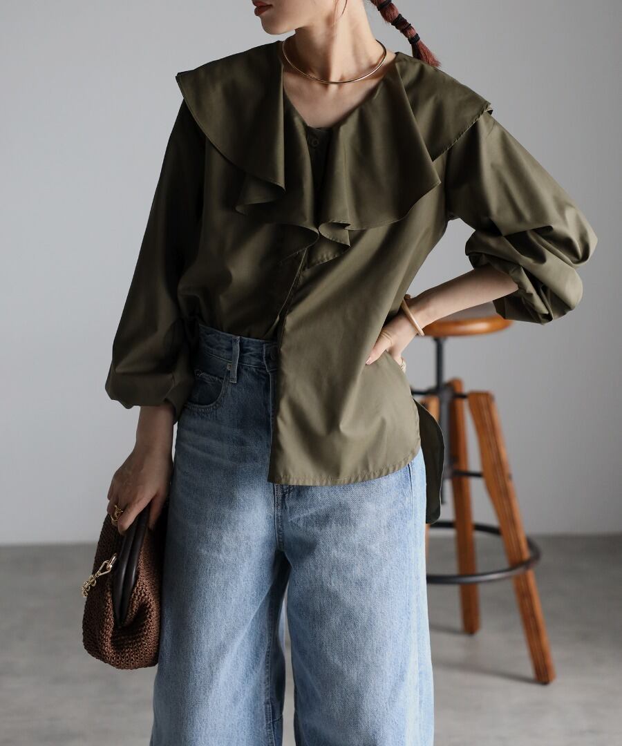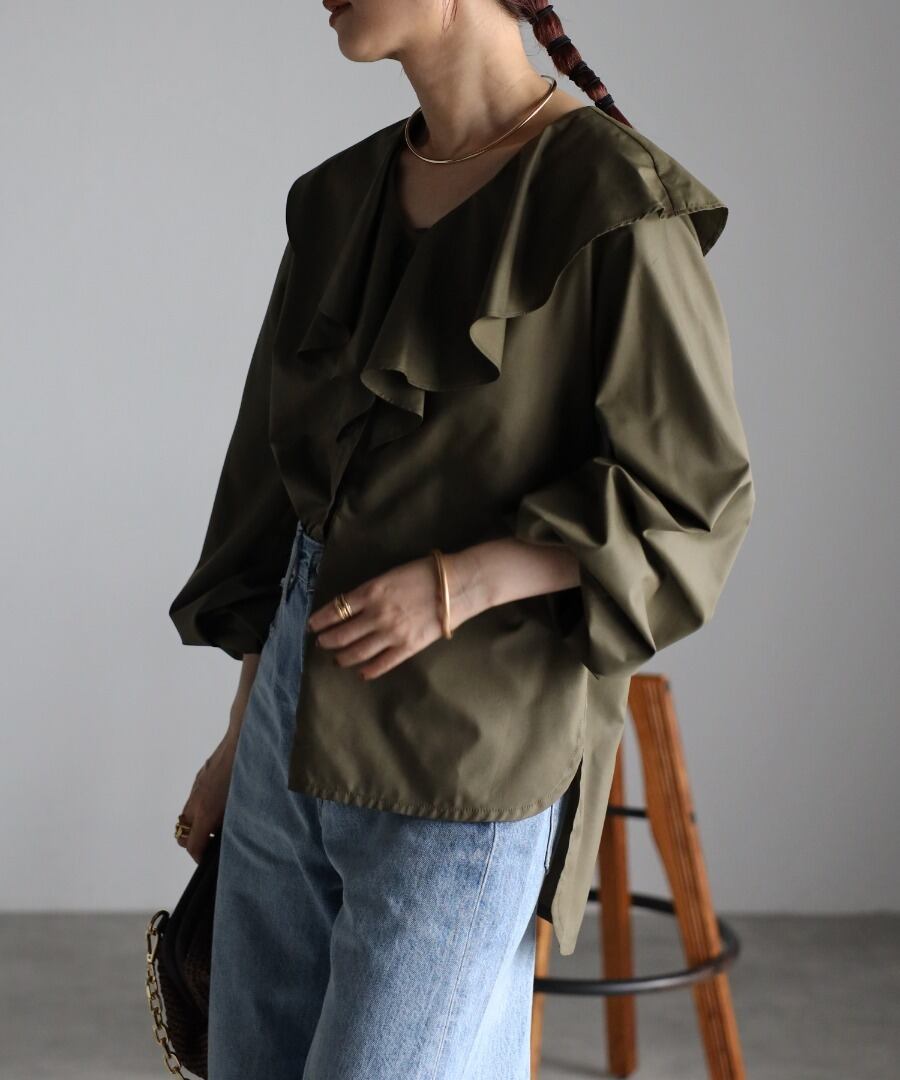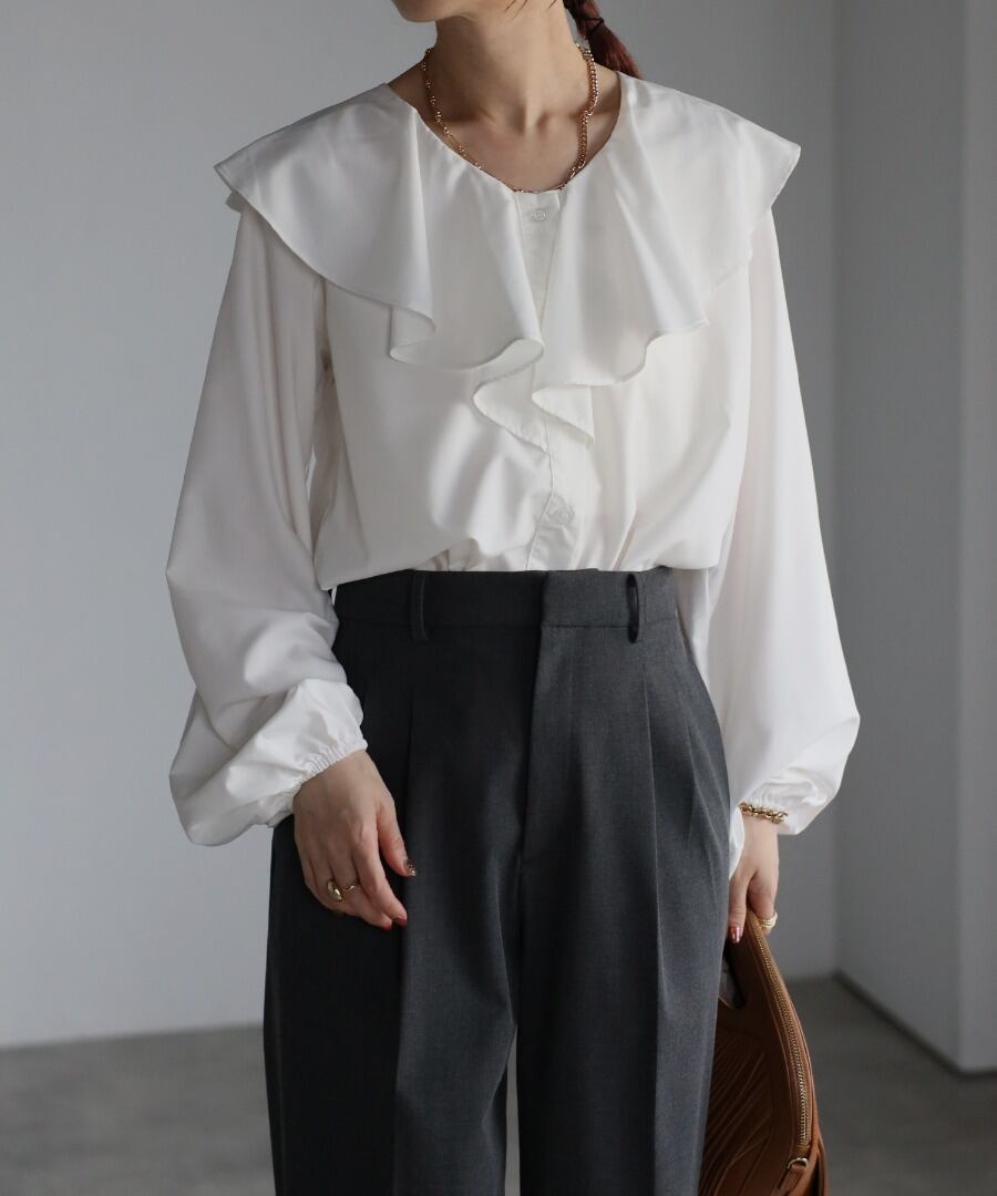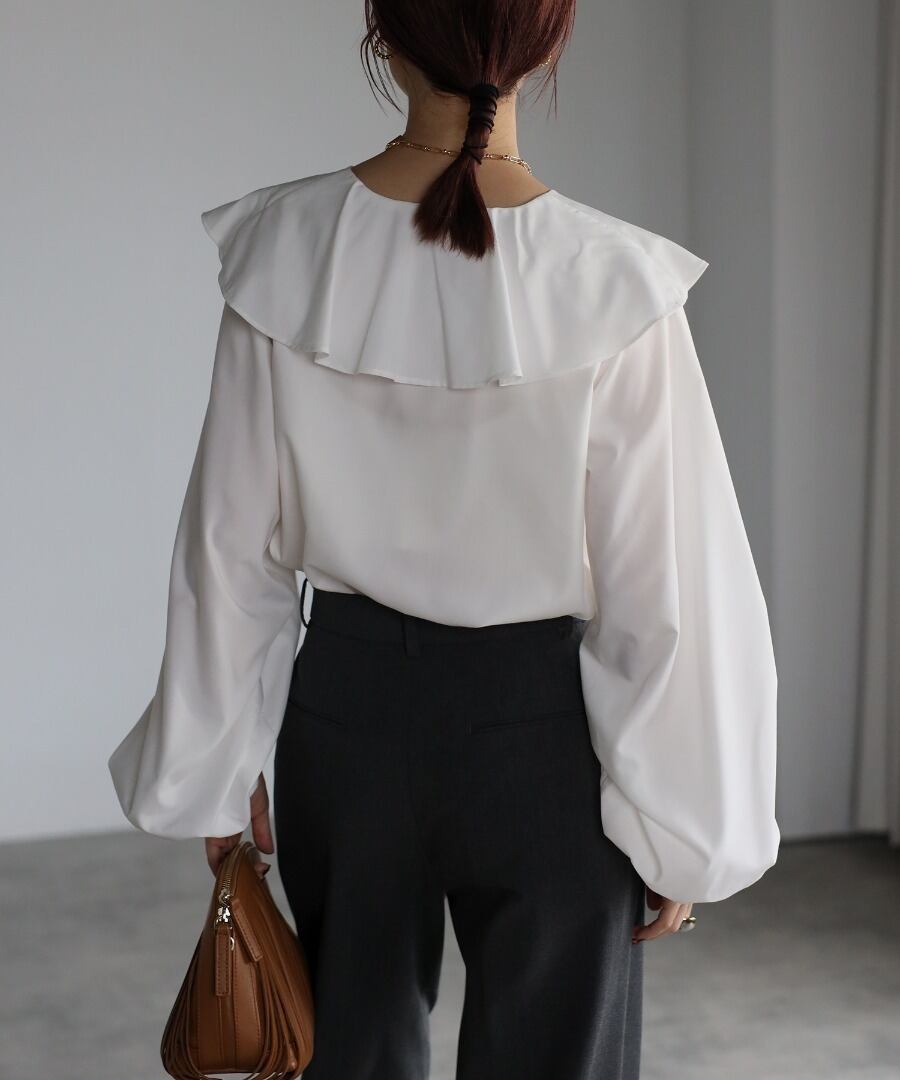 女性らしいふんわりディテールが華やかなフリルカラーブラウス