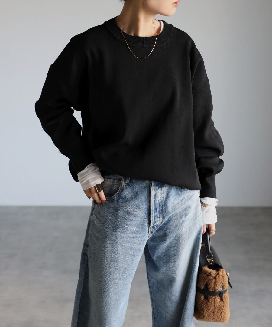 ボリュームがありスウェット見えする生地感で、もっちりとした編み地がカジュアルな一枚です。