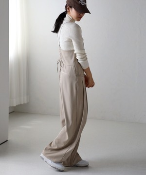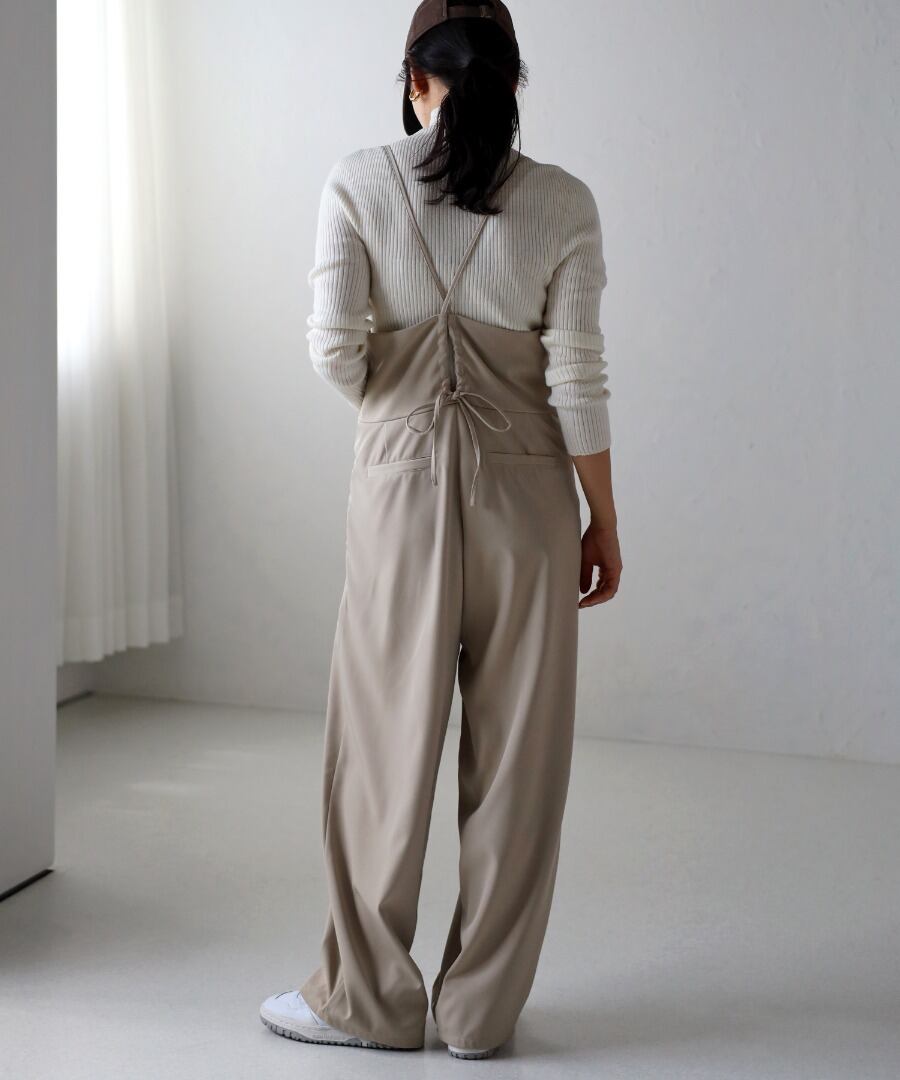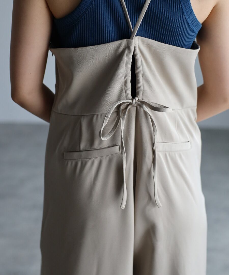 バッククロスの華奢な肩紐に、ドロストカットのディテールも加えたおしゃれなサロペット。