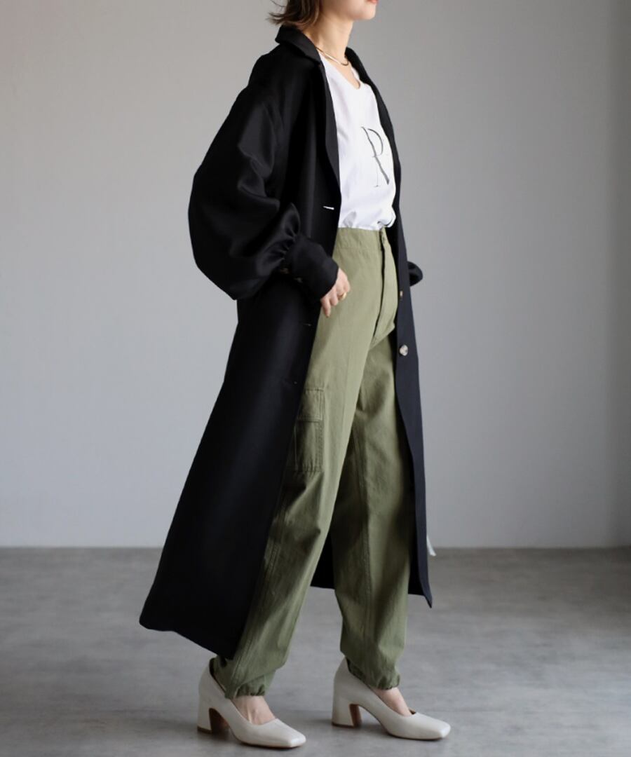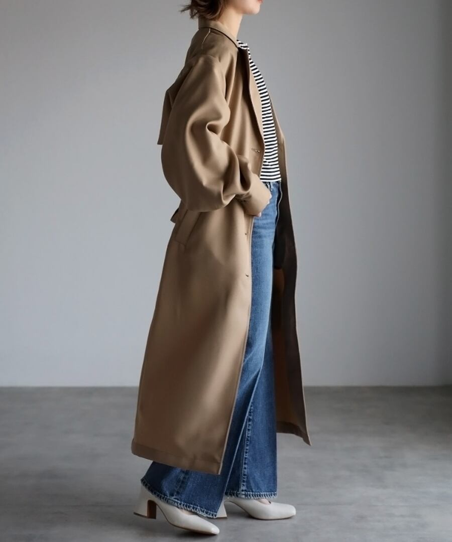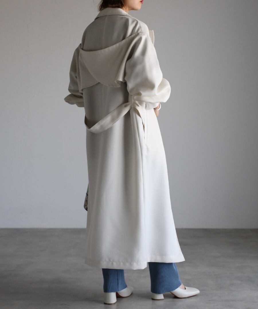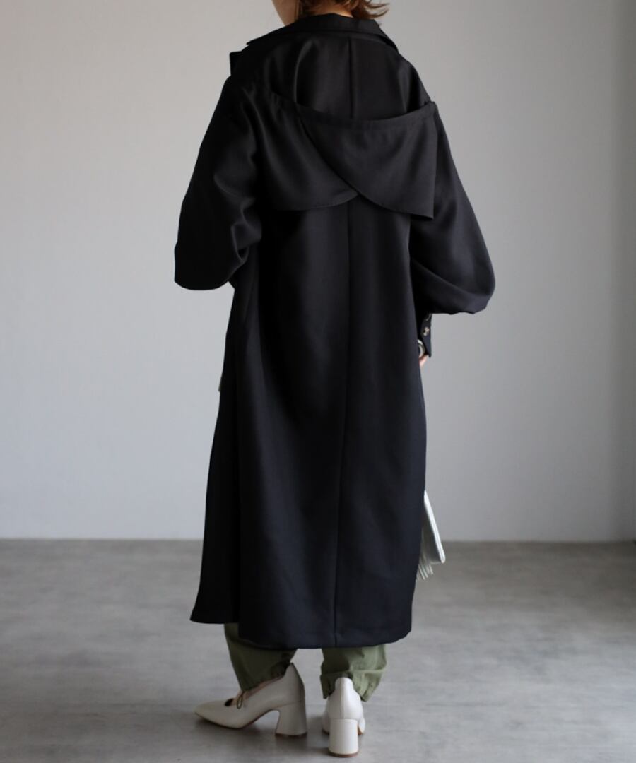 バックのストームフラップがカシュクールデザインになったオシャレなコート。