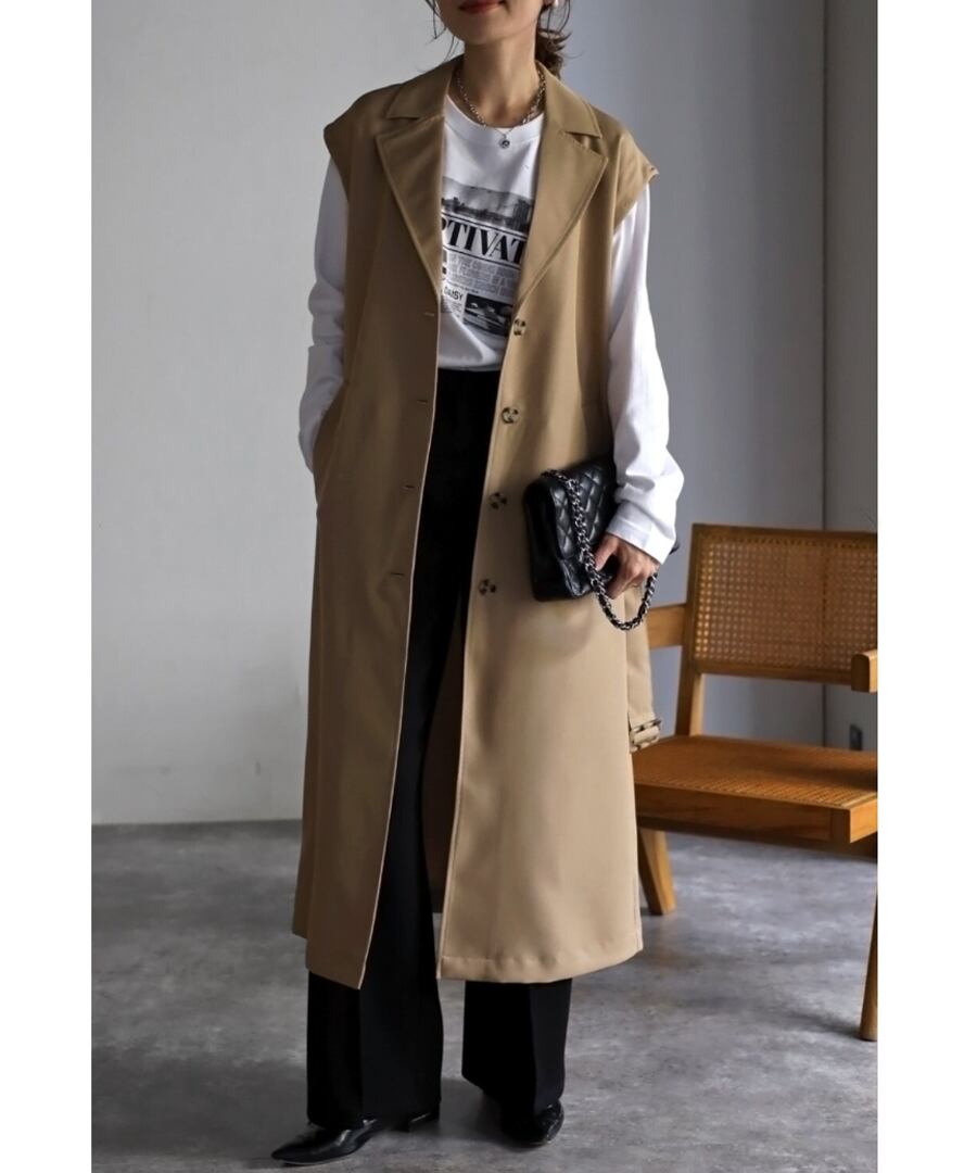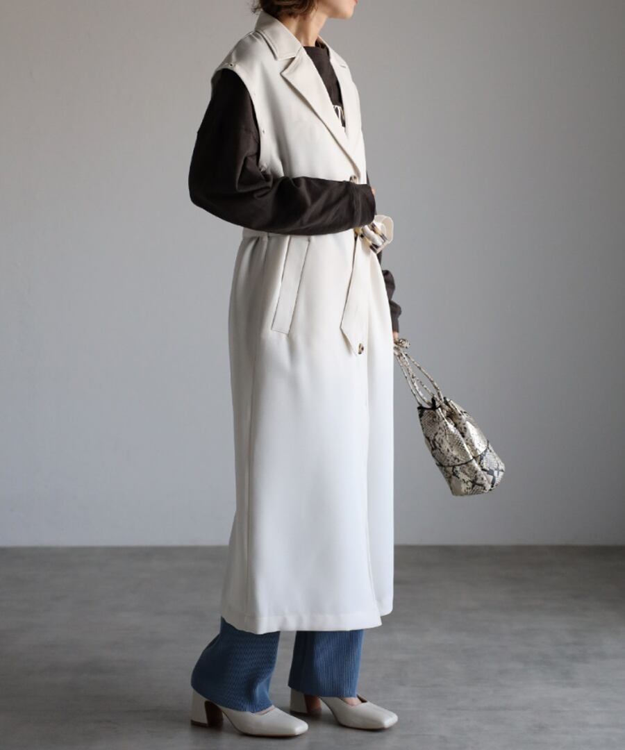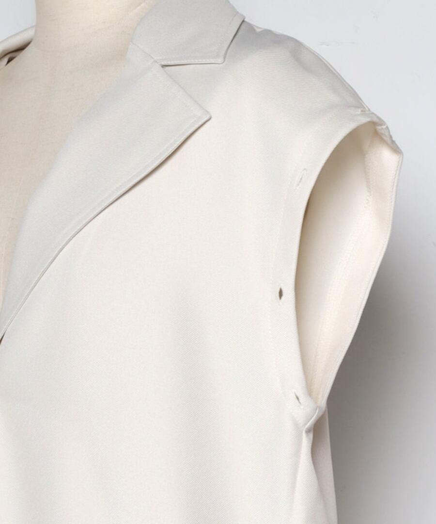 ギャザースリーブの袖とフラップが繋がったデザインで、アームホールのボタンを取り外すとジレとしての着用が可能。