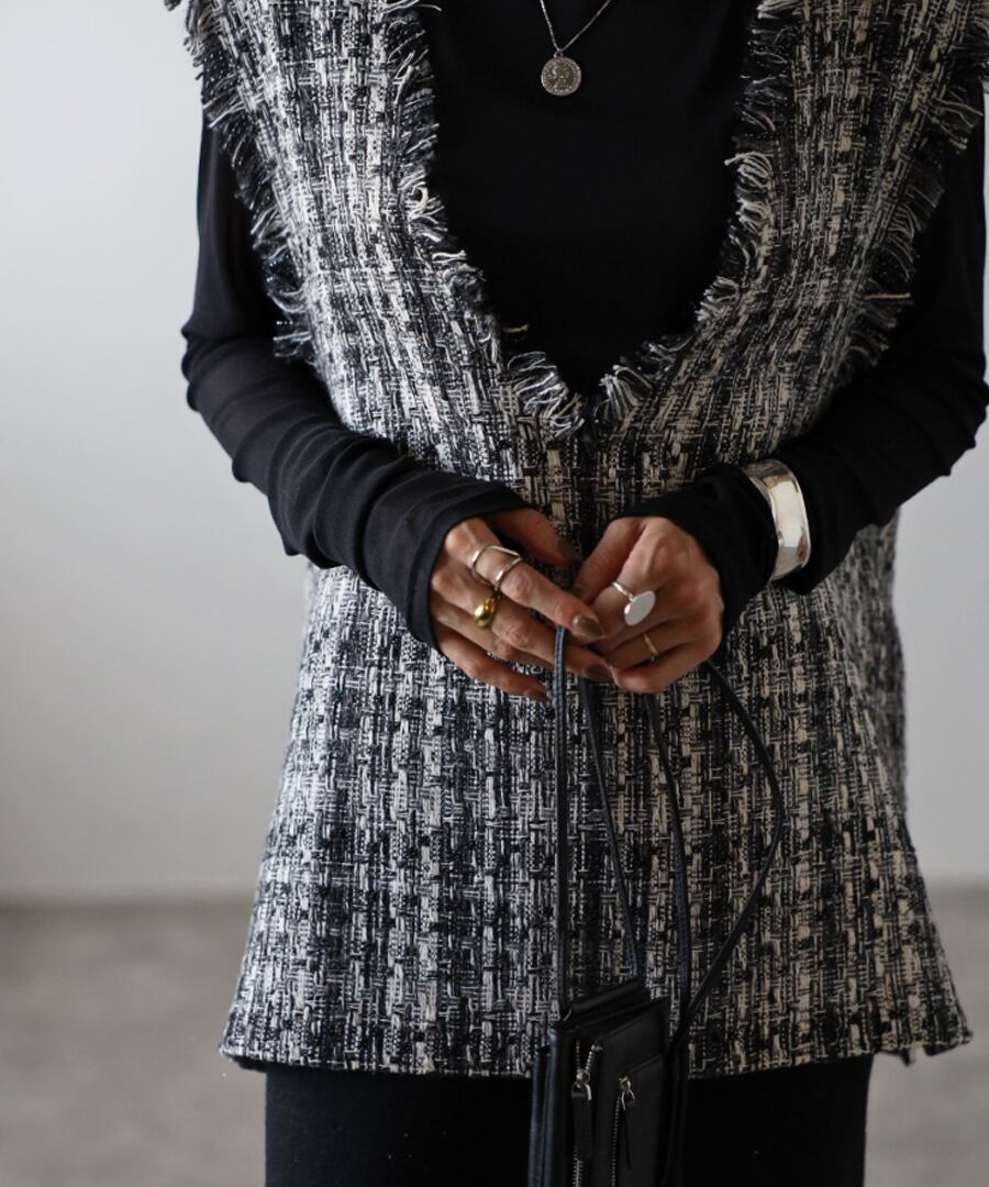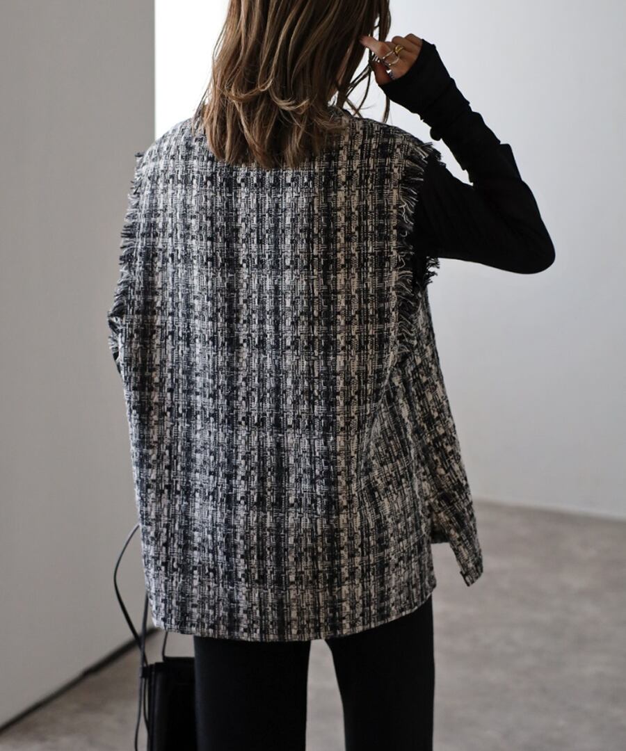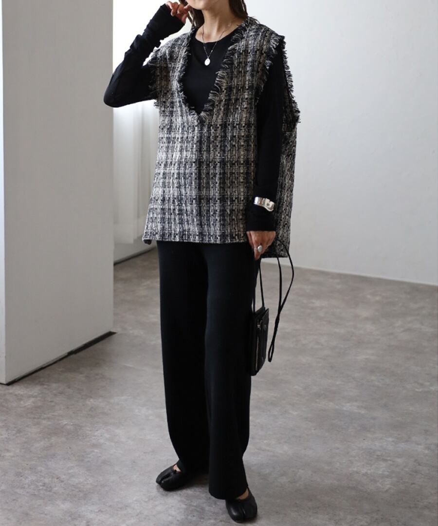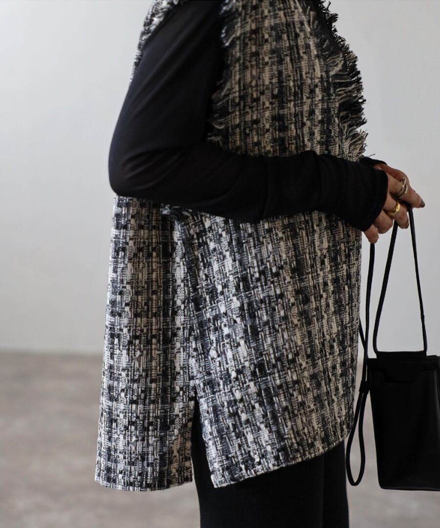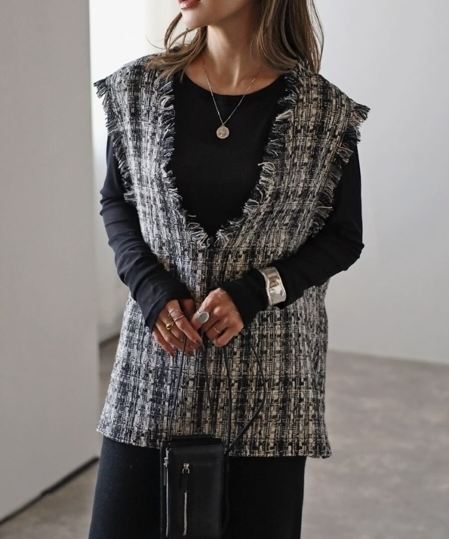 長めのフリンジが存在感抜群。ざっくり深Vツイードベスト
