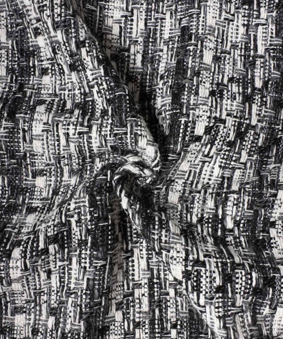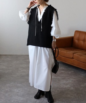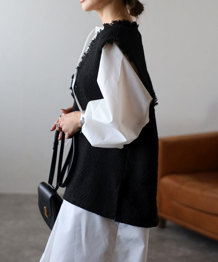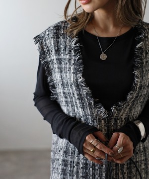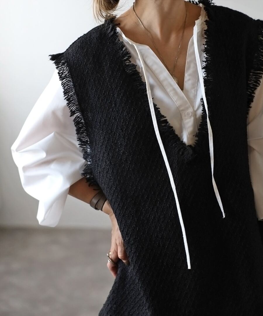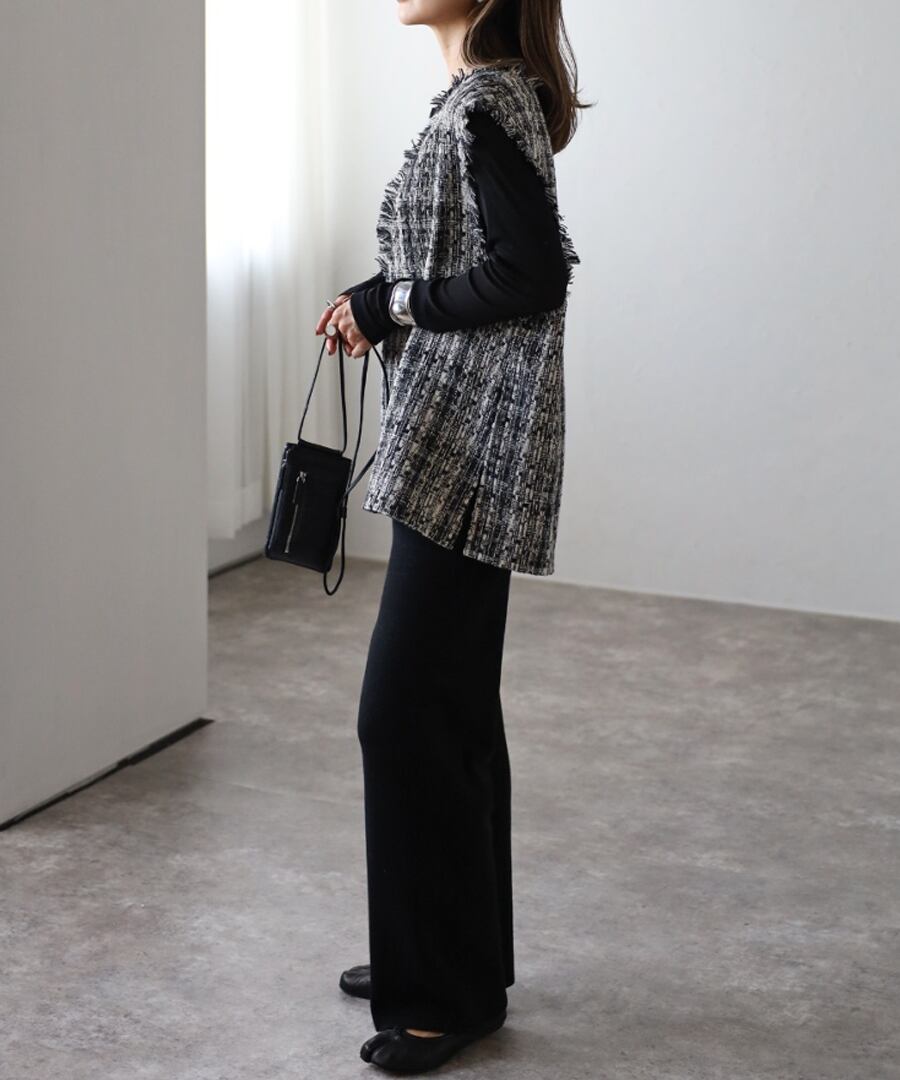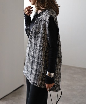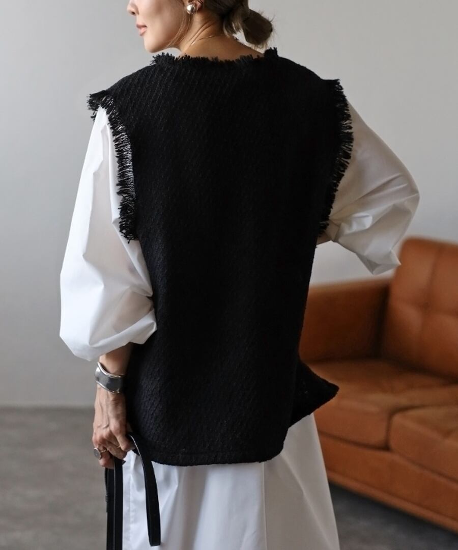 長めのフリンジが存在感抜群。ざっくり深Vツイードベスト