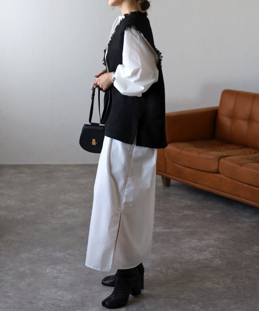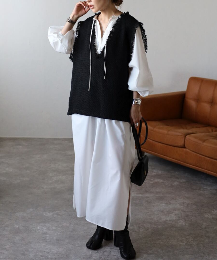長袖のリブニットやブラウスをインナーにしたレイヤードスタイルもおすすめ。