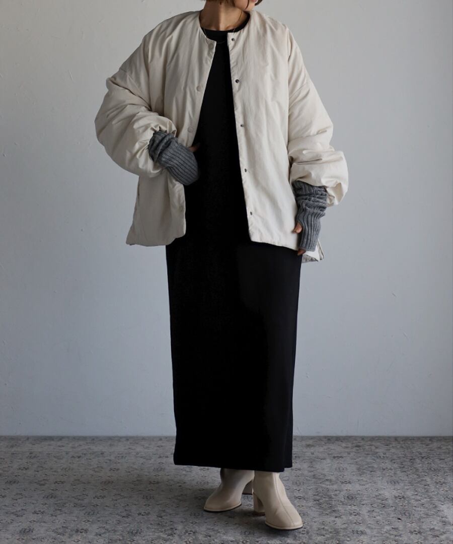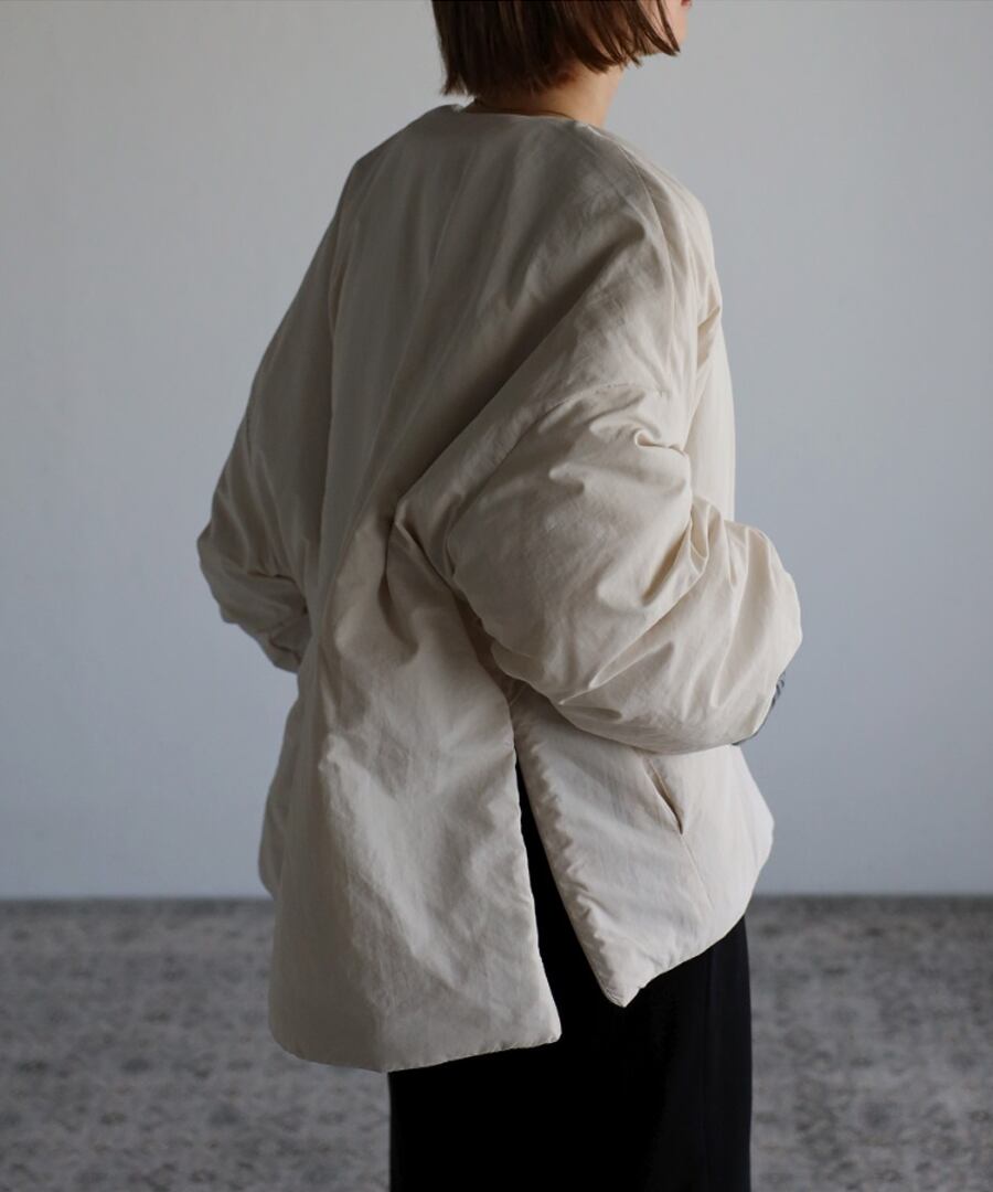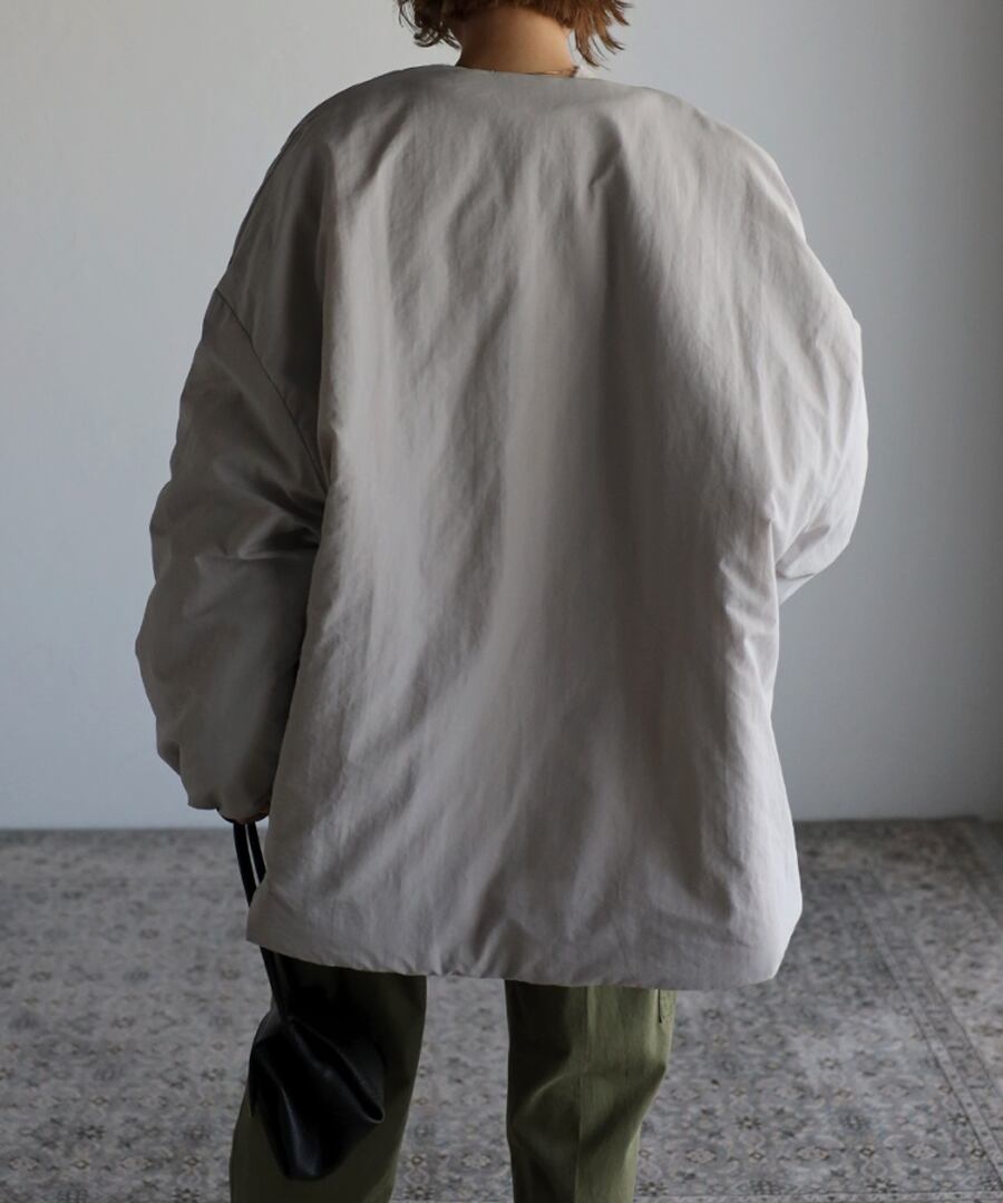 ドロップショルダーのオーバーサイズで、インナーにニットを合わせてもシルエットが響きにくく、軽くて暖かいコクーンボリュームアウターです。