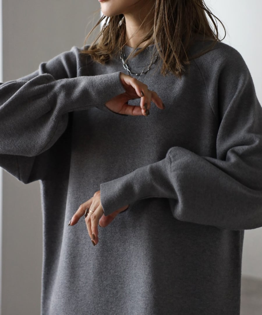 ラグランスリーブは、ネックから肩周りをすっきりと見せ、裾と袖口の編み地を変化させたリブが程よいデザインポイント。