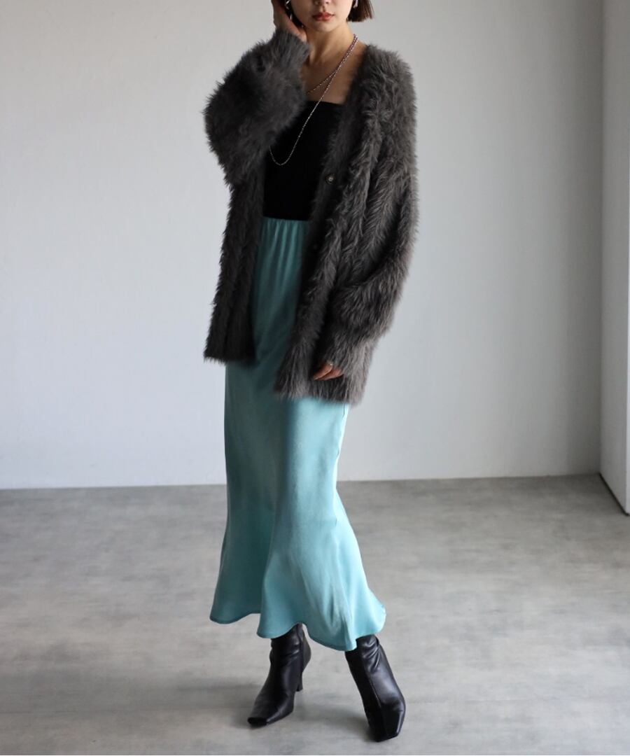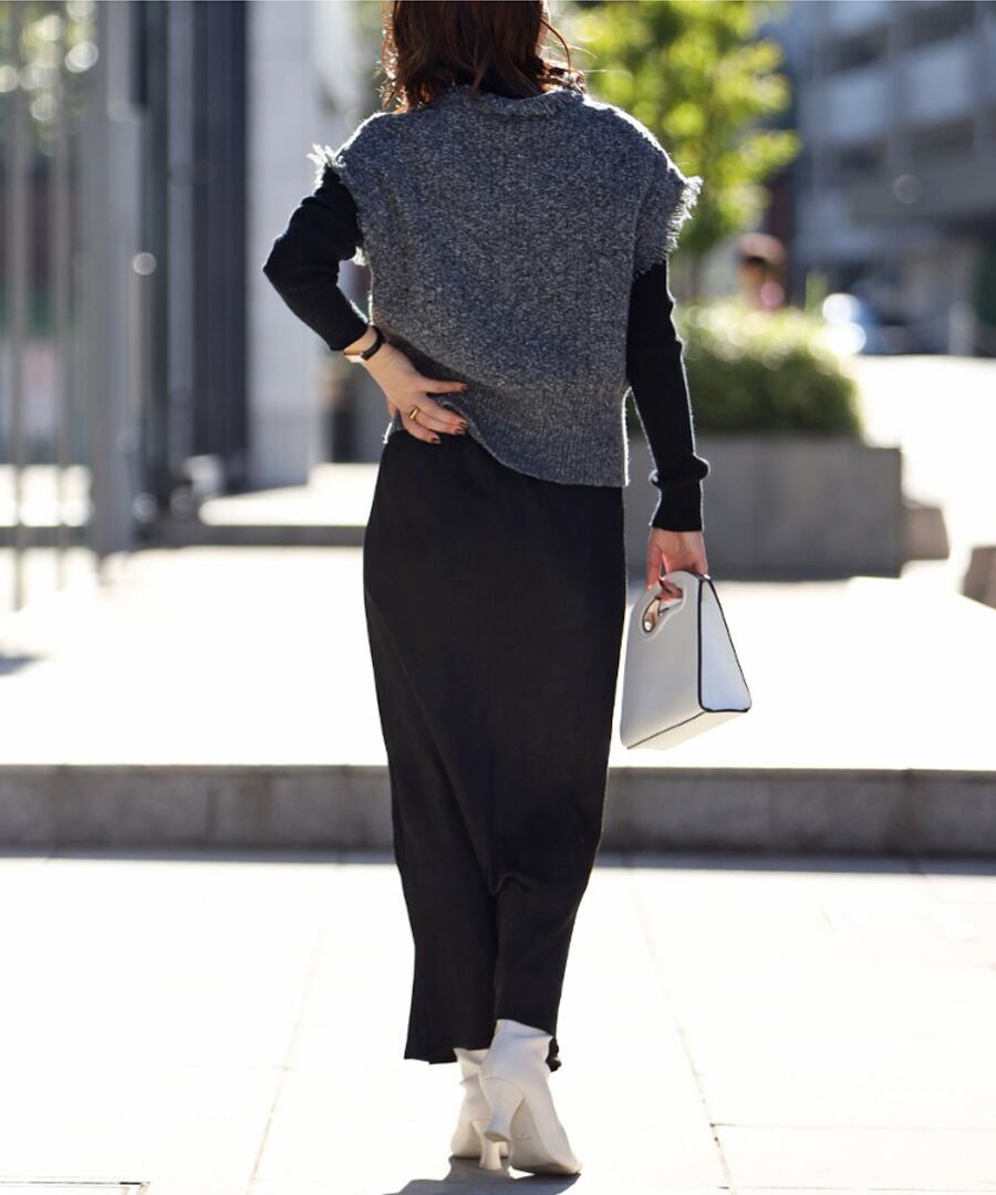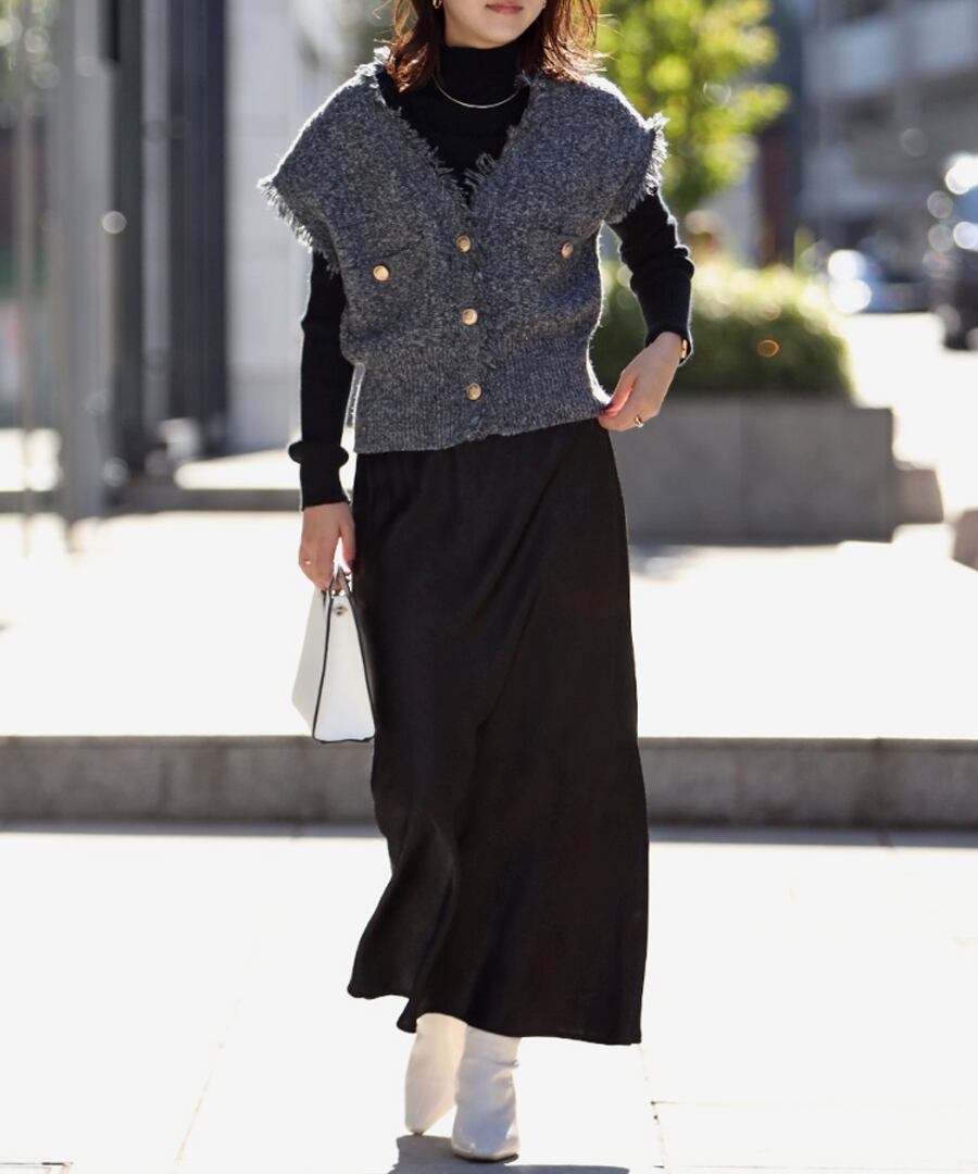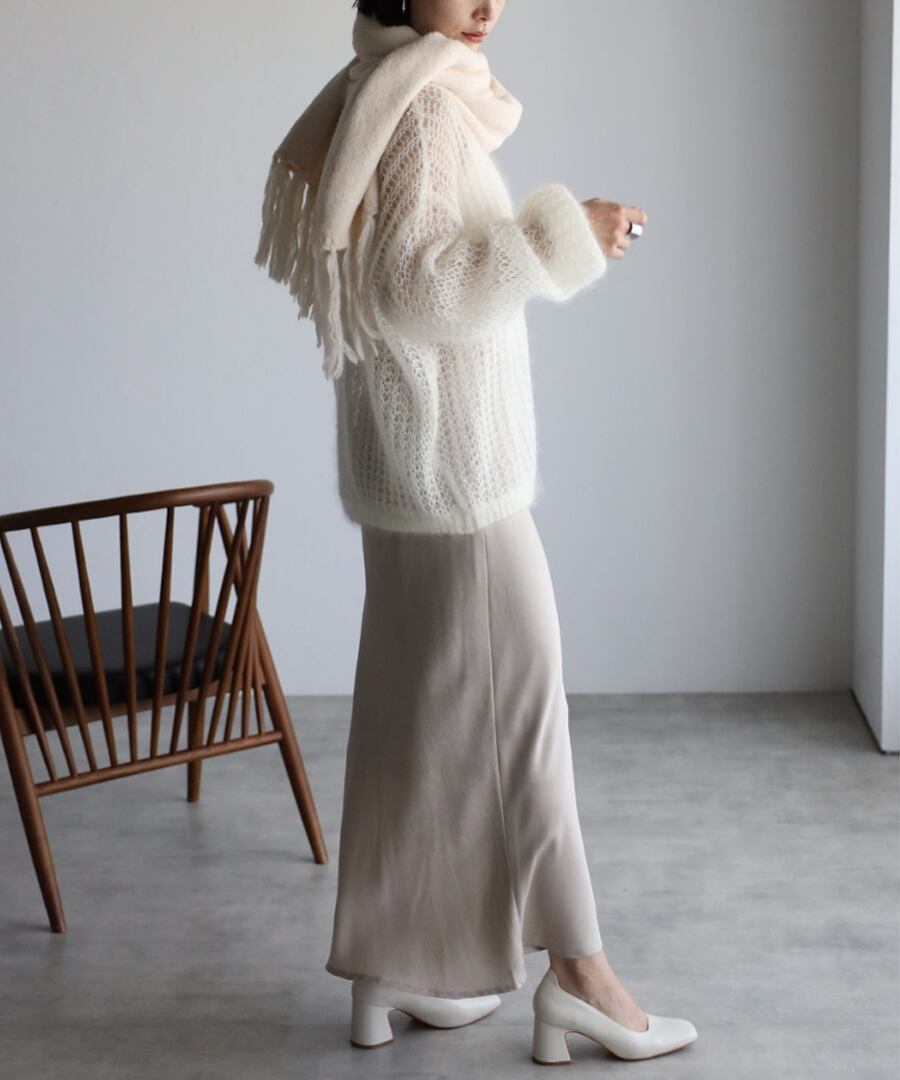 ブラウスや毛足のあるニットに合わせるだけで、華やかさのある女性らしいスタイルを演出してくれます。