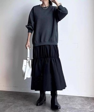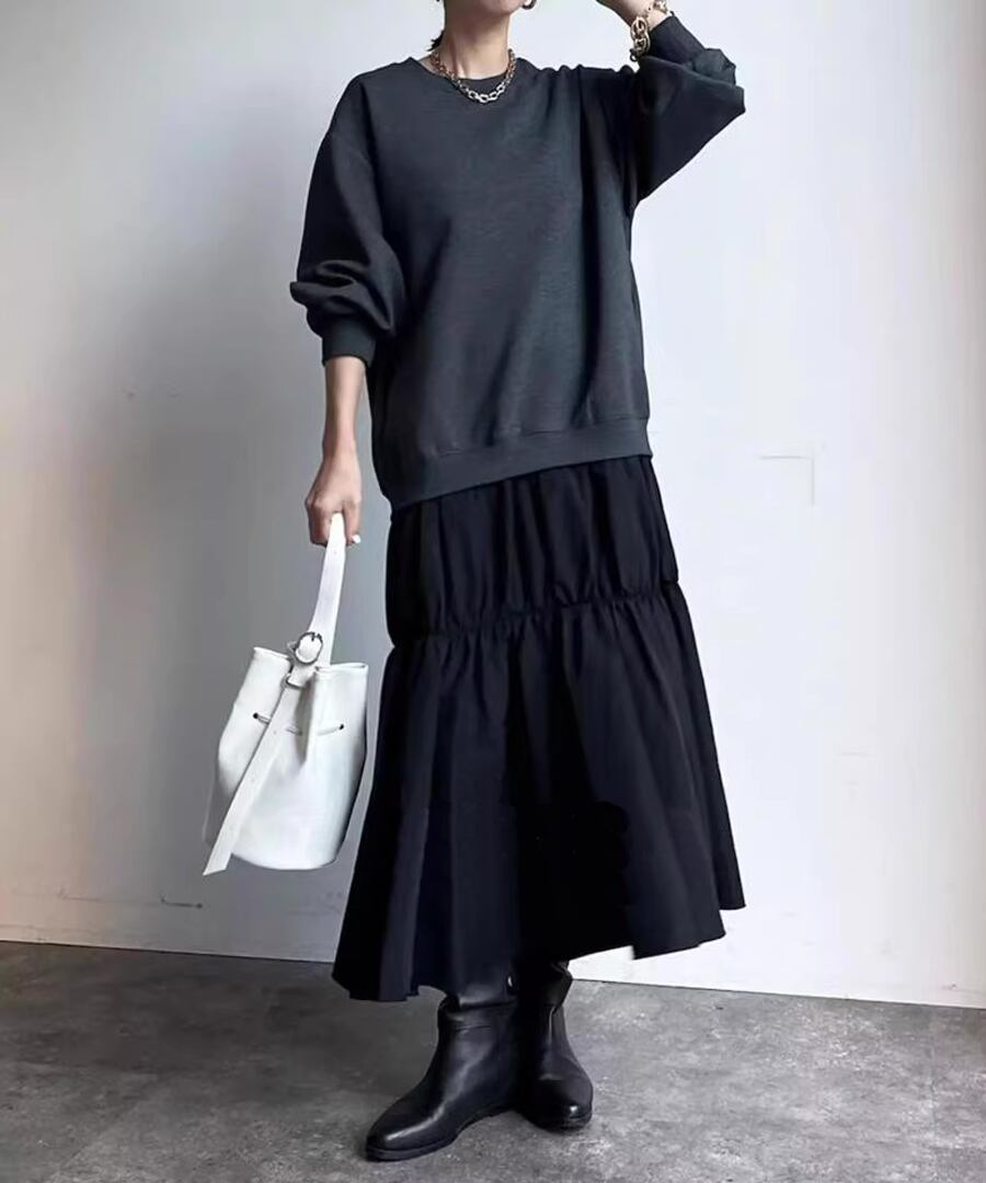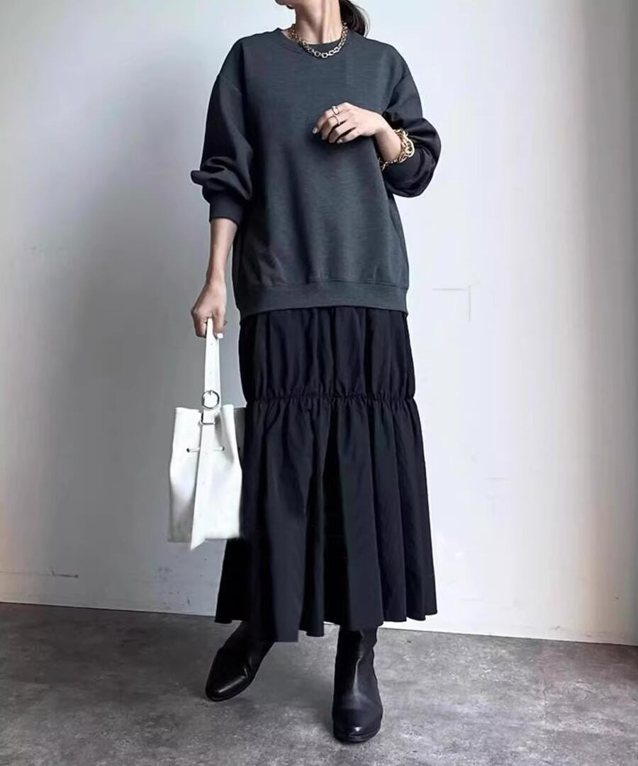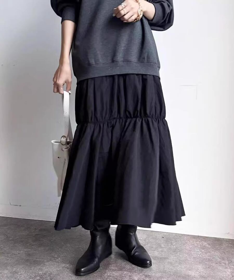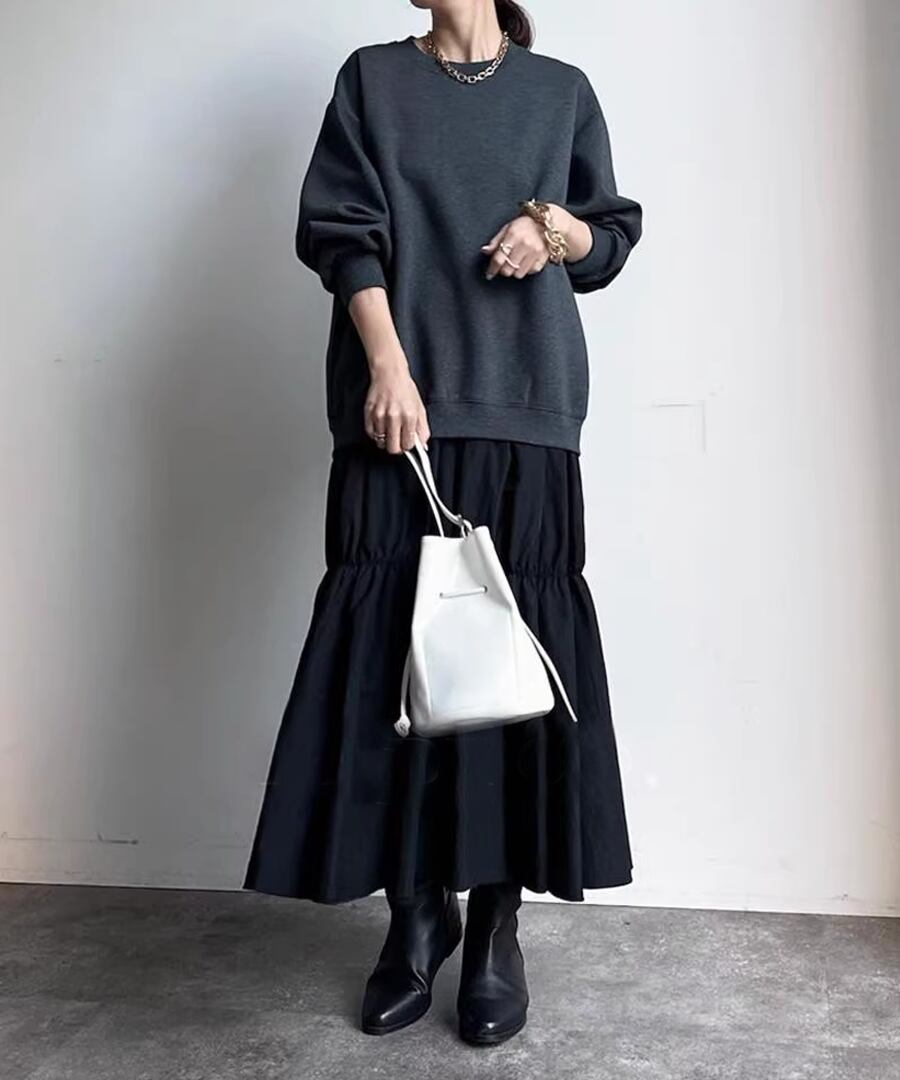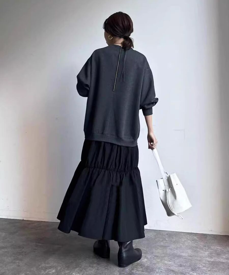 裾に向かって自然に広がるフレアーシルエットがこなれた印象に