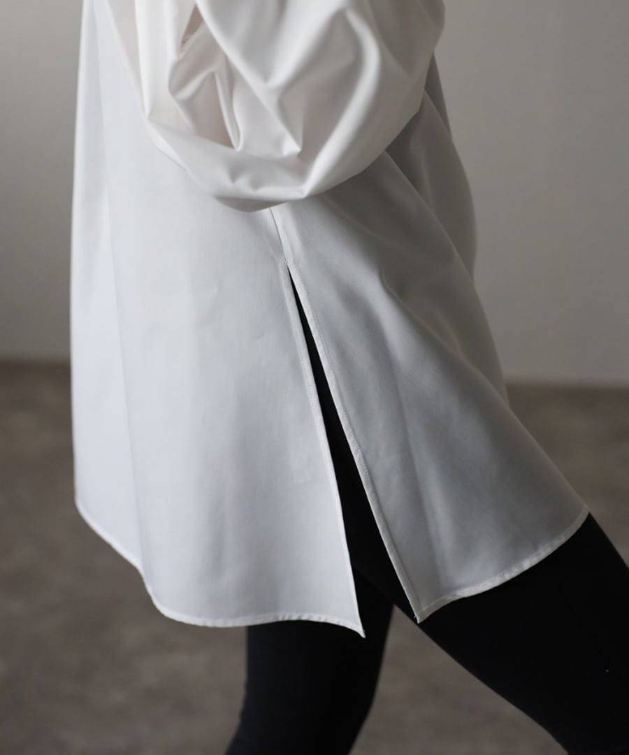 ハリ感のあるブロード素材を使用し、やや長めの着丈&フレアシルエットでバランス良くコーデが決まります。