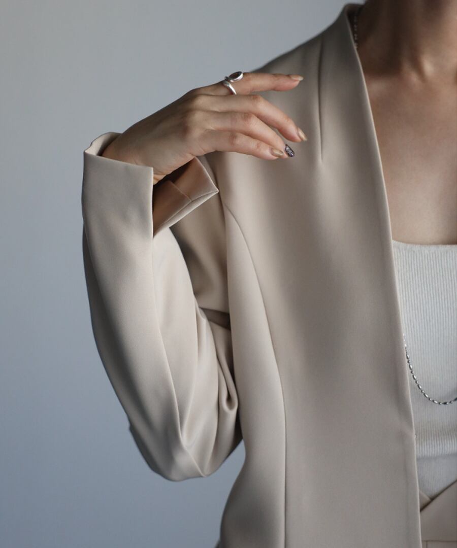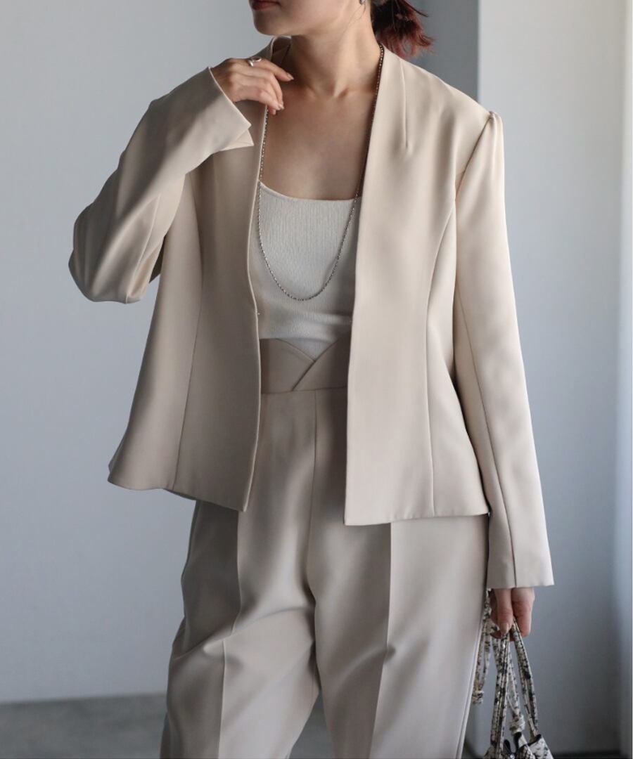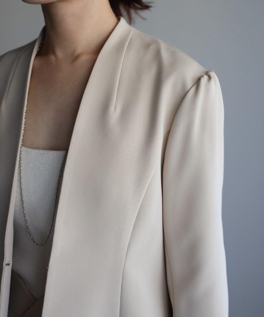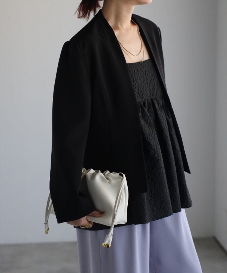 ゆるやかなフレアラインがエレガントで女性らしい。大人フェミニンなノーカラージャケット