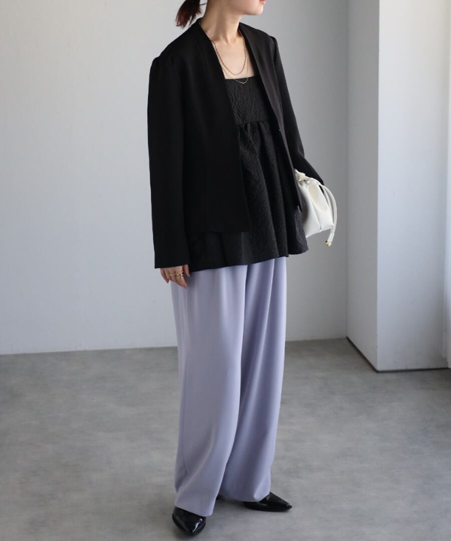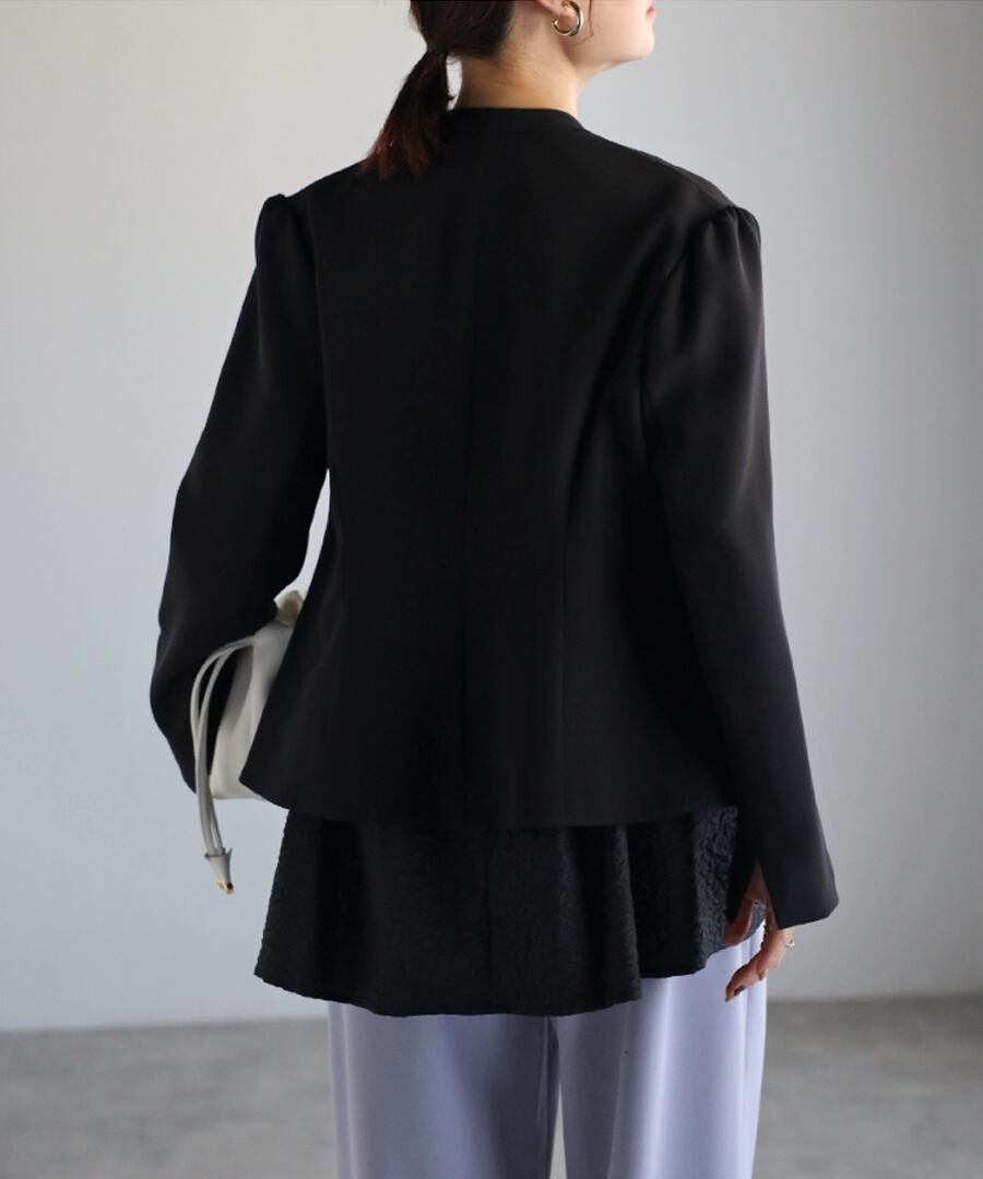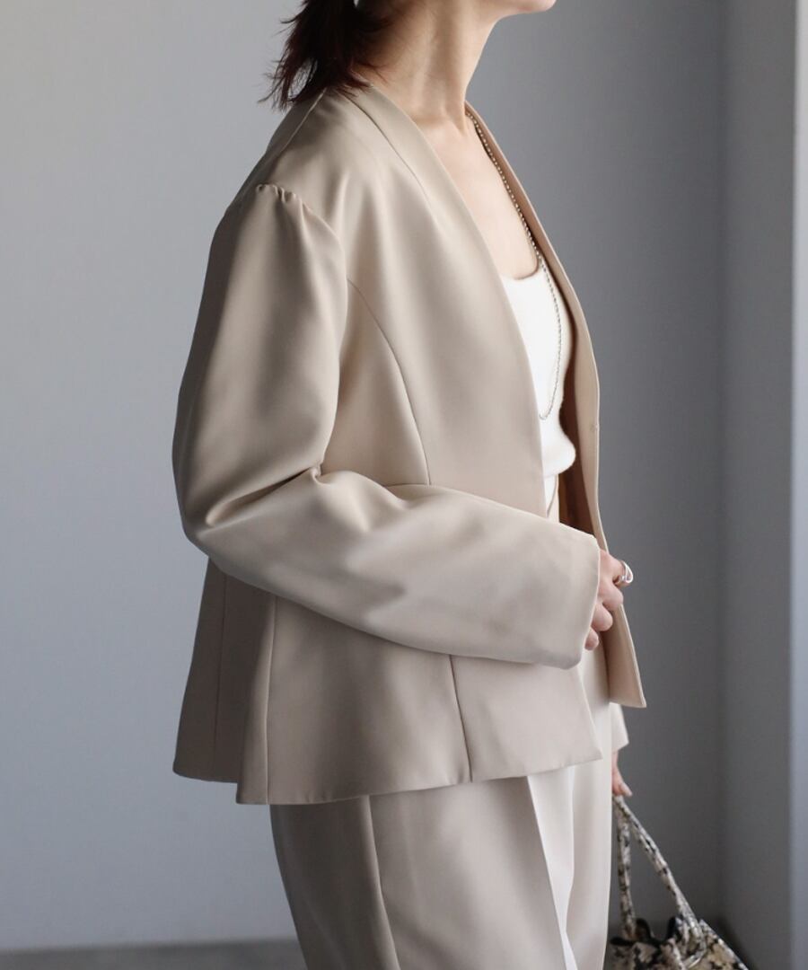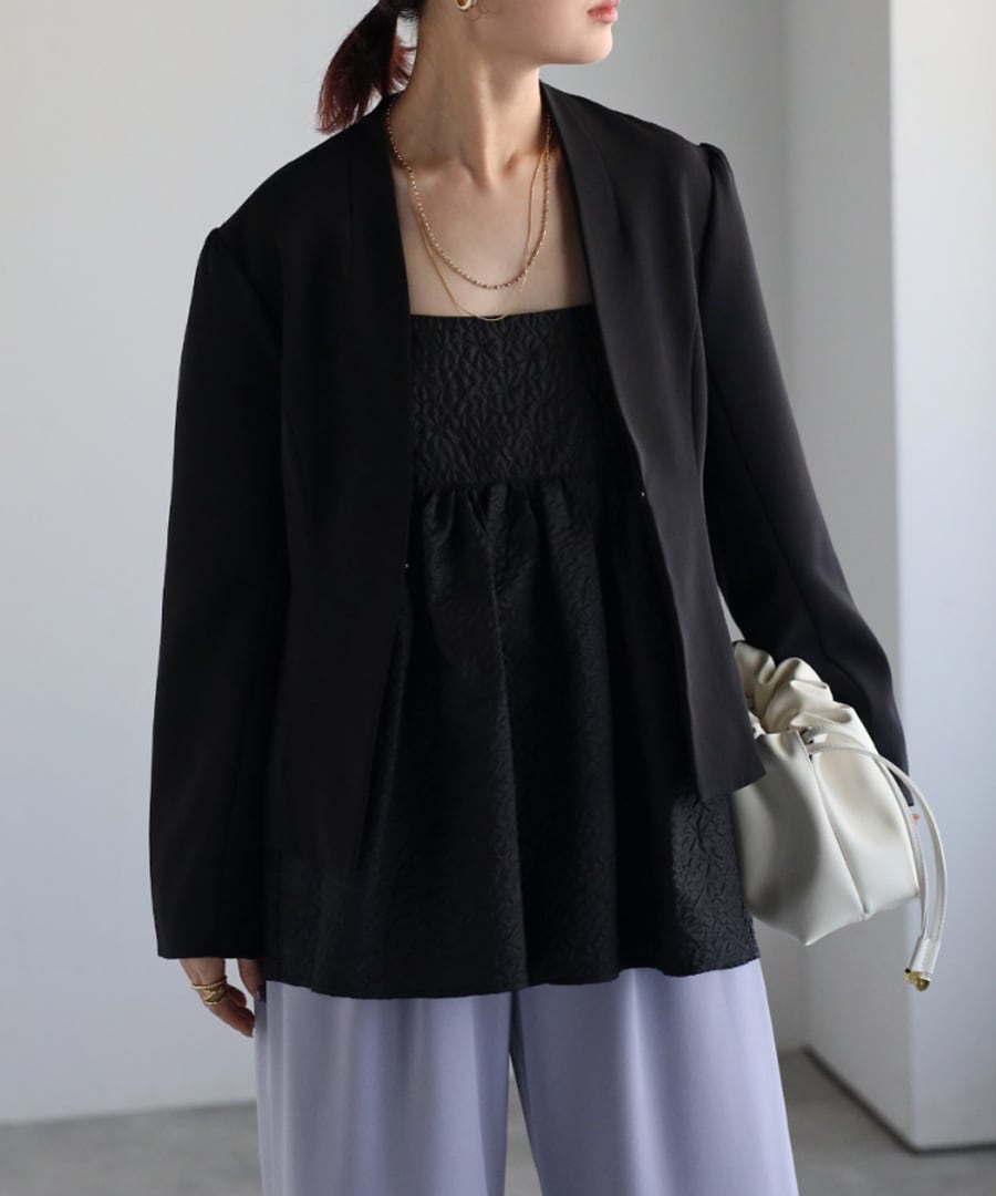 ゆるやかなフレアラインがエレガントで女性らしい。大人フェミニンなノーカラージャケット