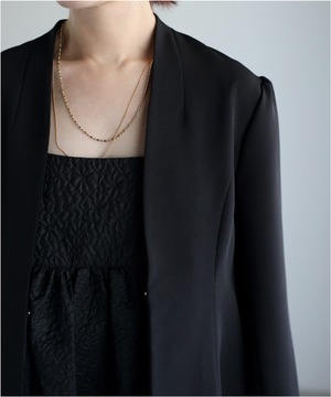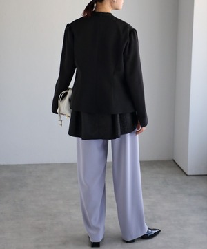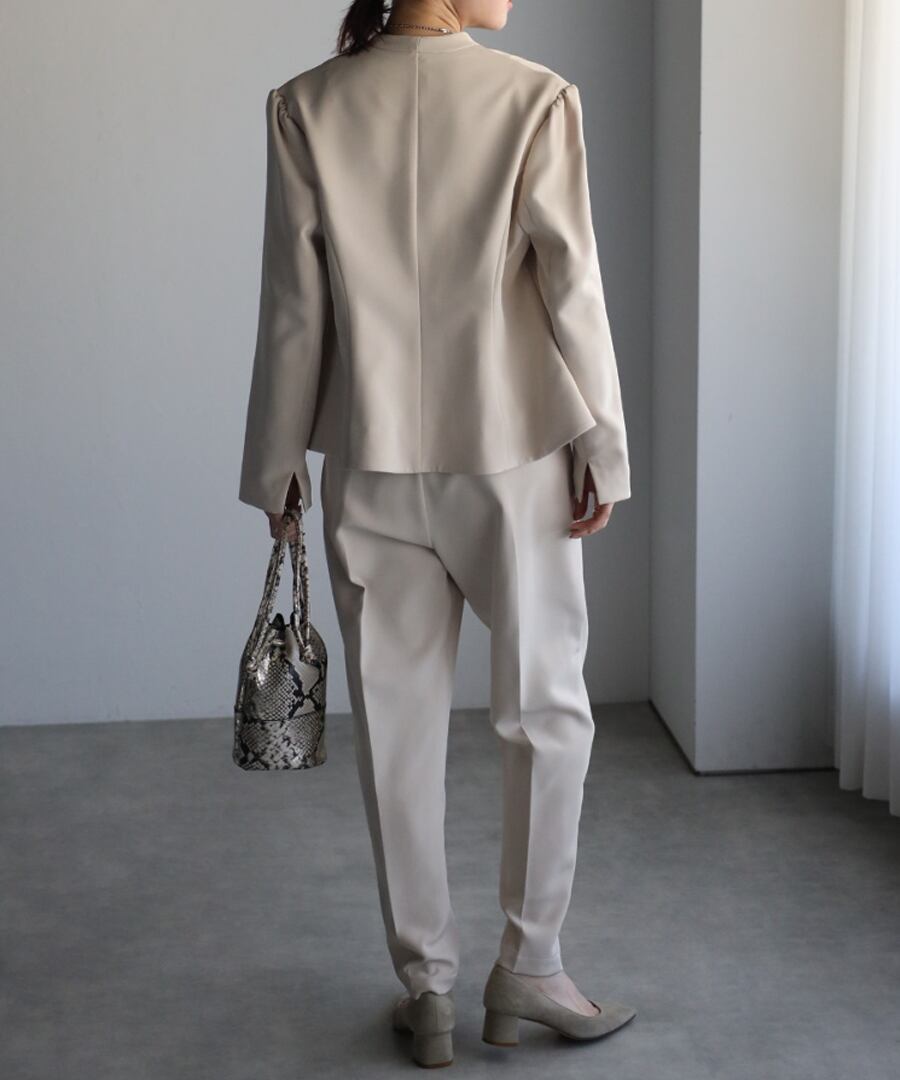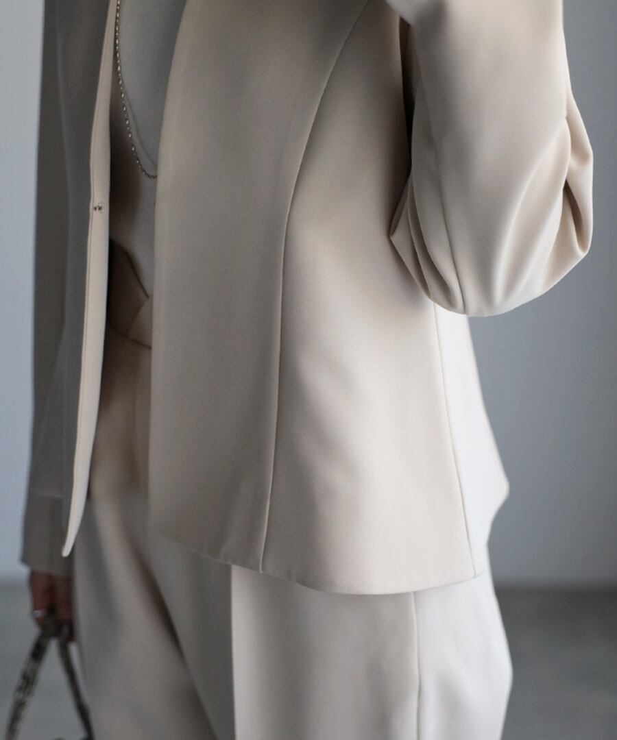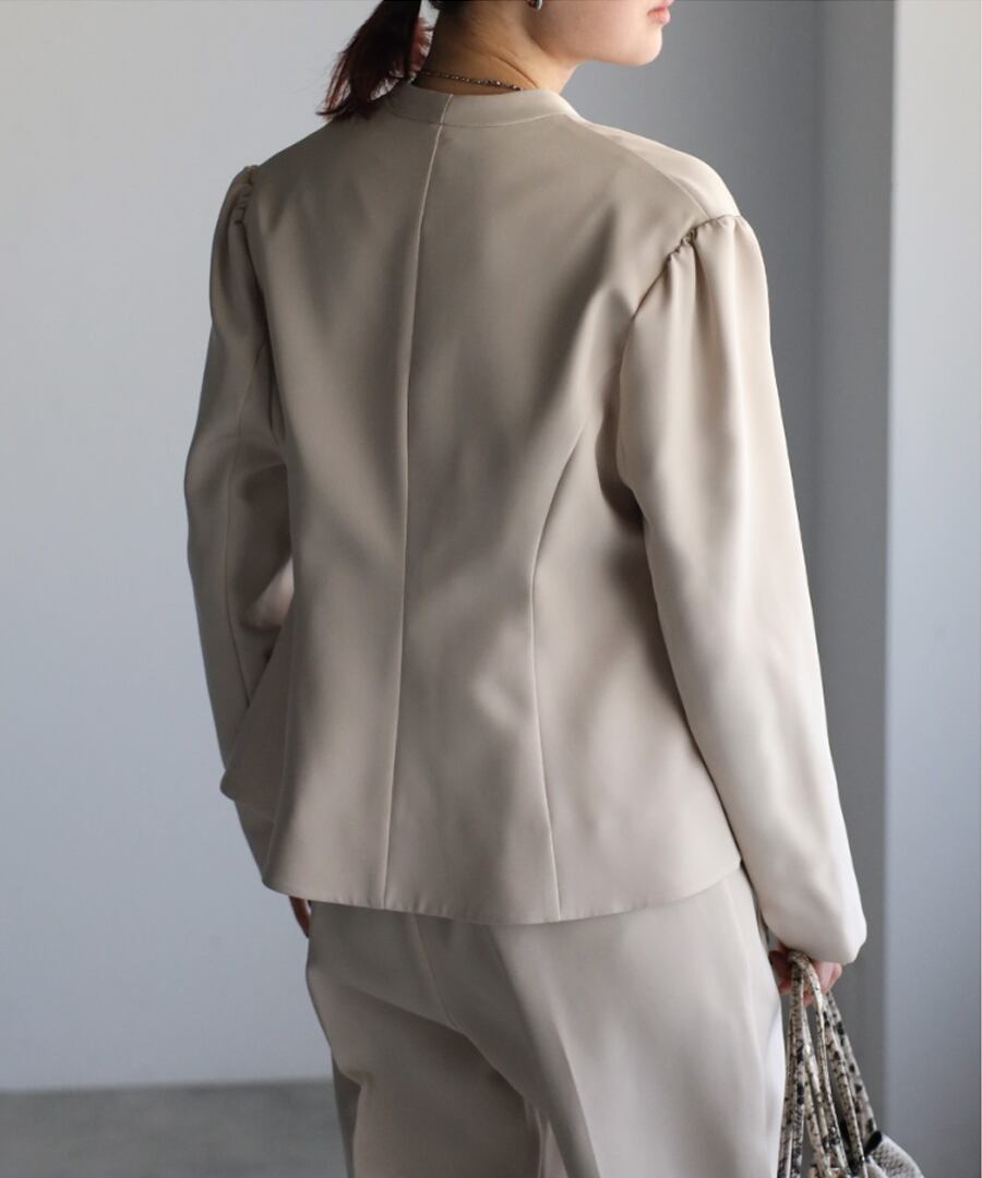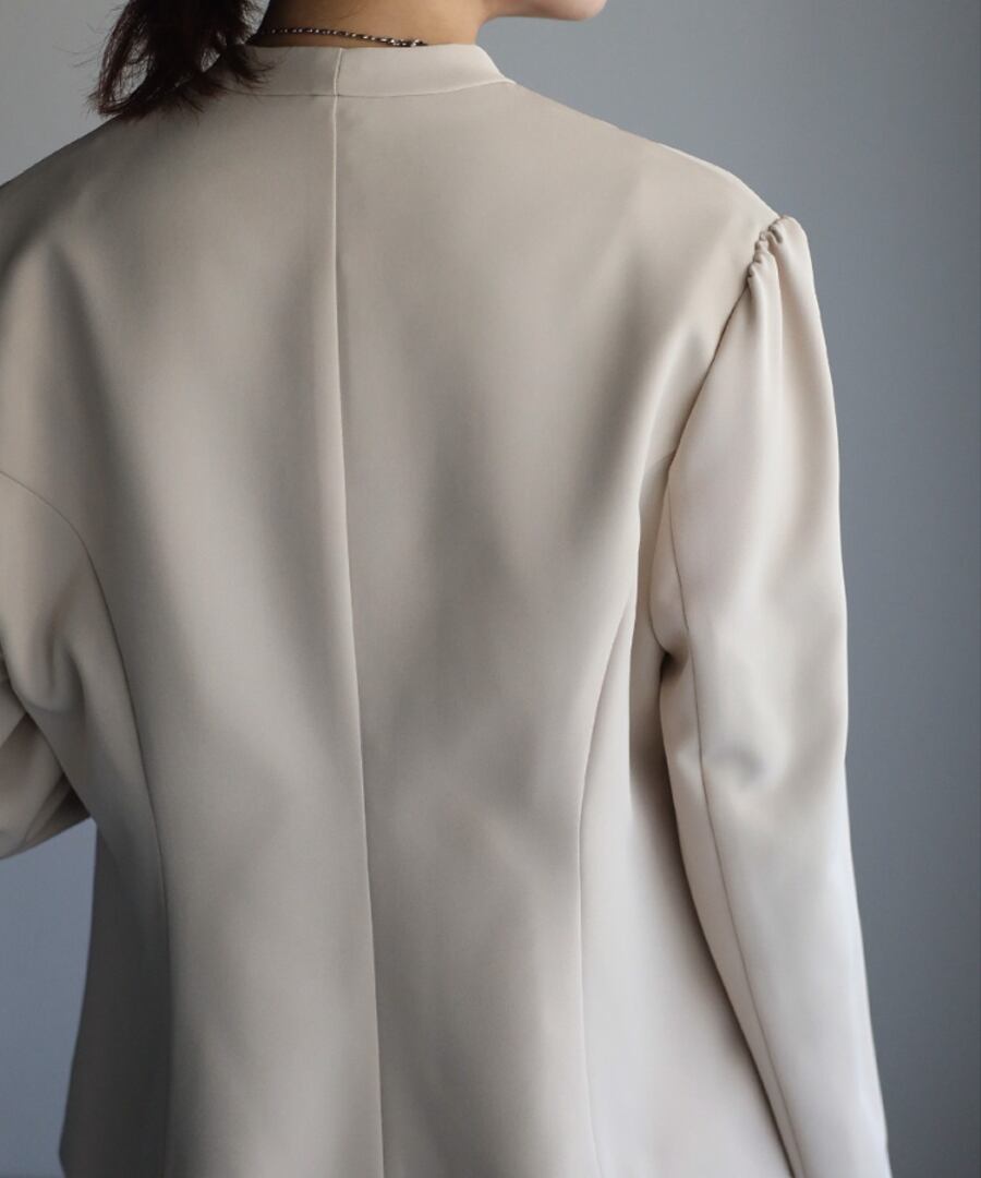 ノーカラーデザインにタックを入れ、モード感もプラスした一枚です。