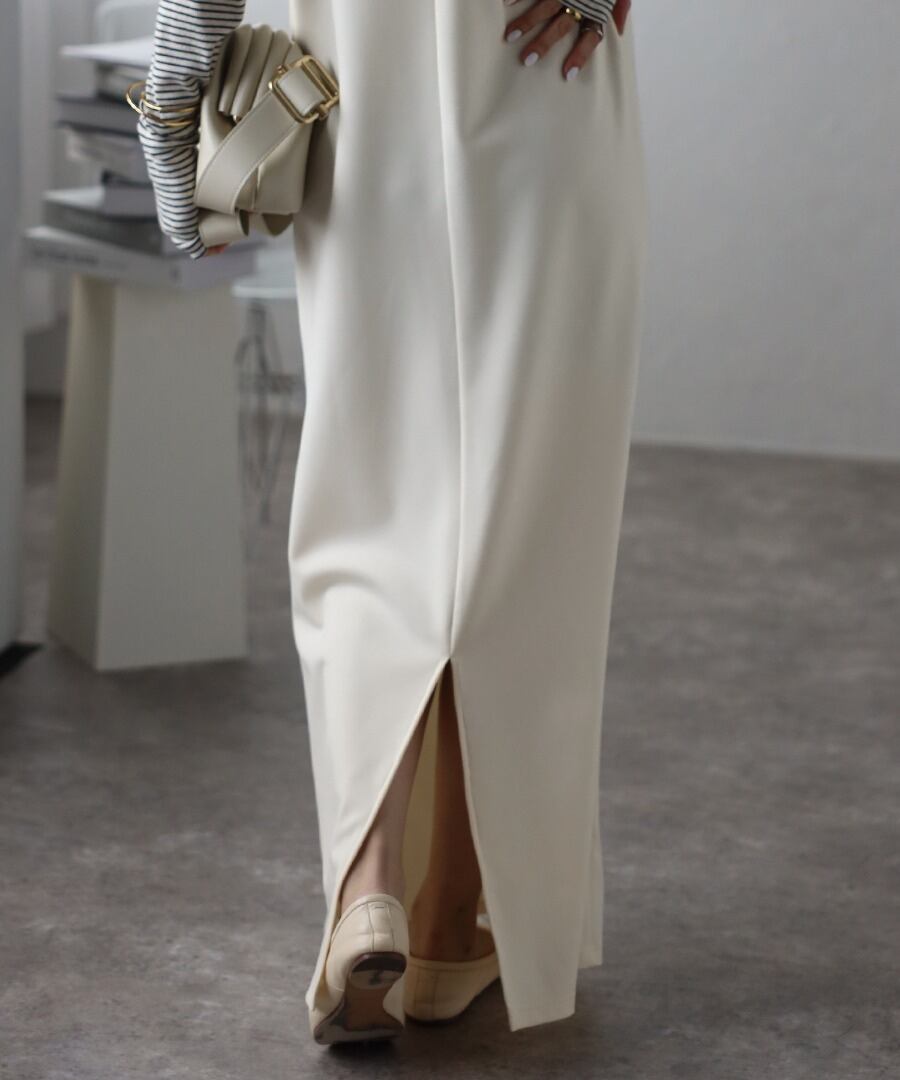 バックスリット入りで足捌きが良く、女性らしい印象の華奢な肩のストラップは長さ調節が可能。