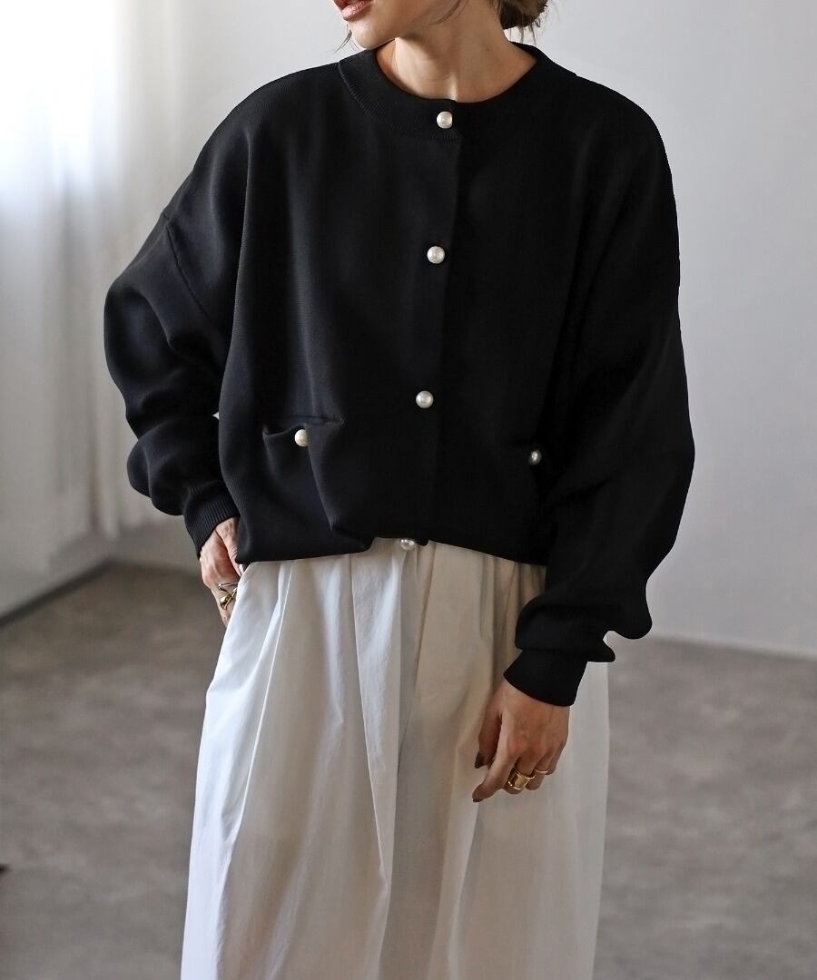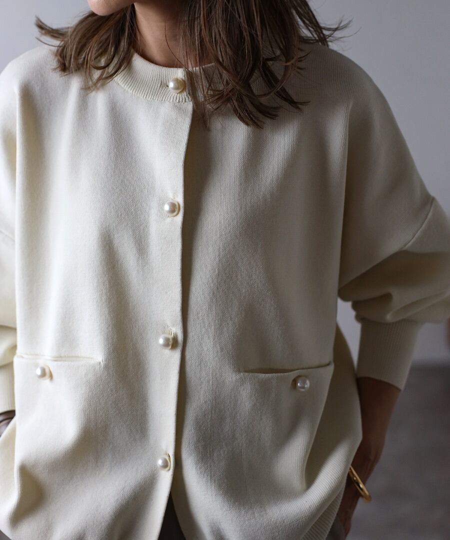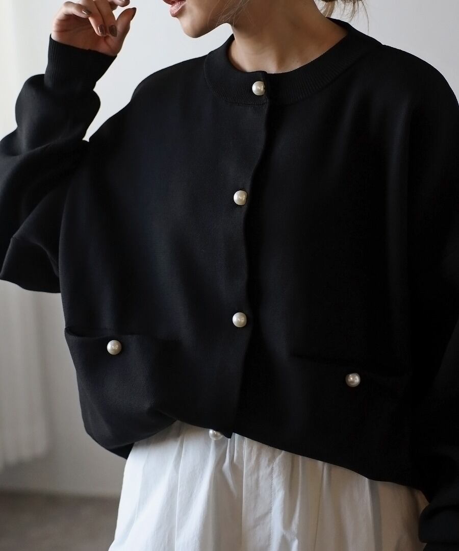 オーバーサイズのゆるっとしたシルエットに、パールボタンで上品見えする一枚です。