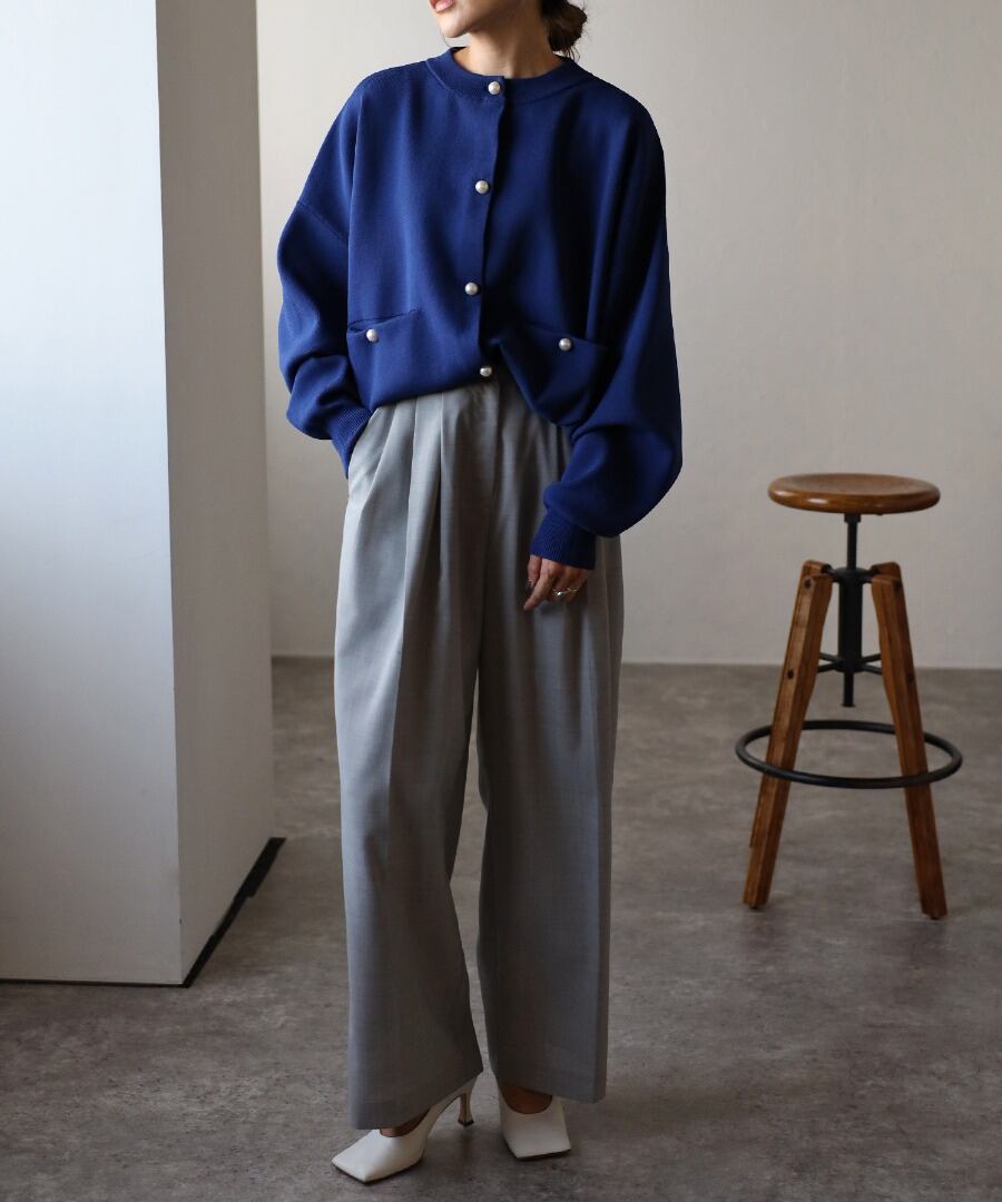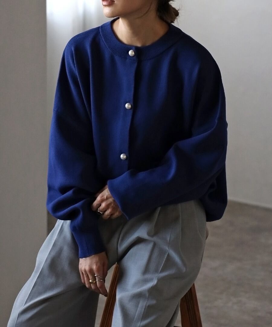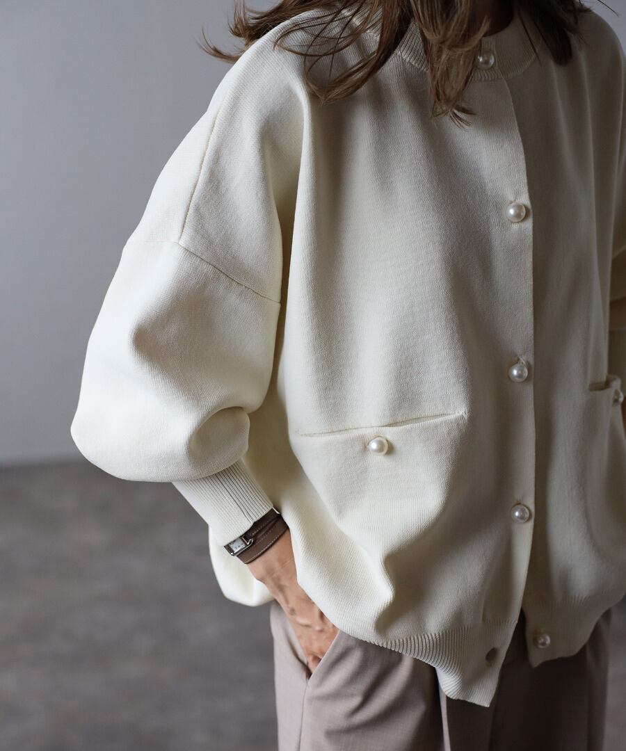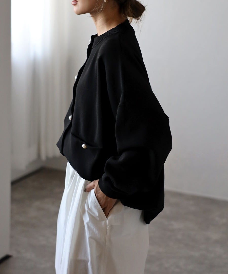 オーバーサイズのゆるっとしたシルエットに、パールボタンで上品見えする一枚です。