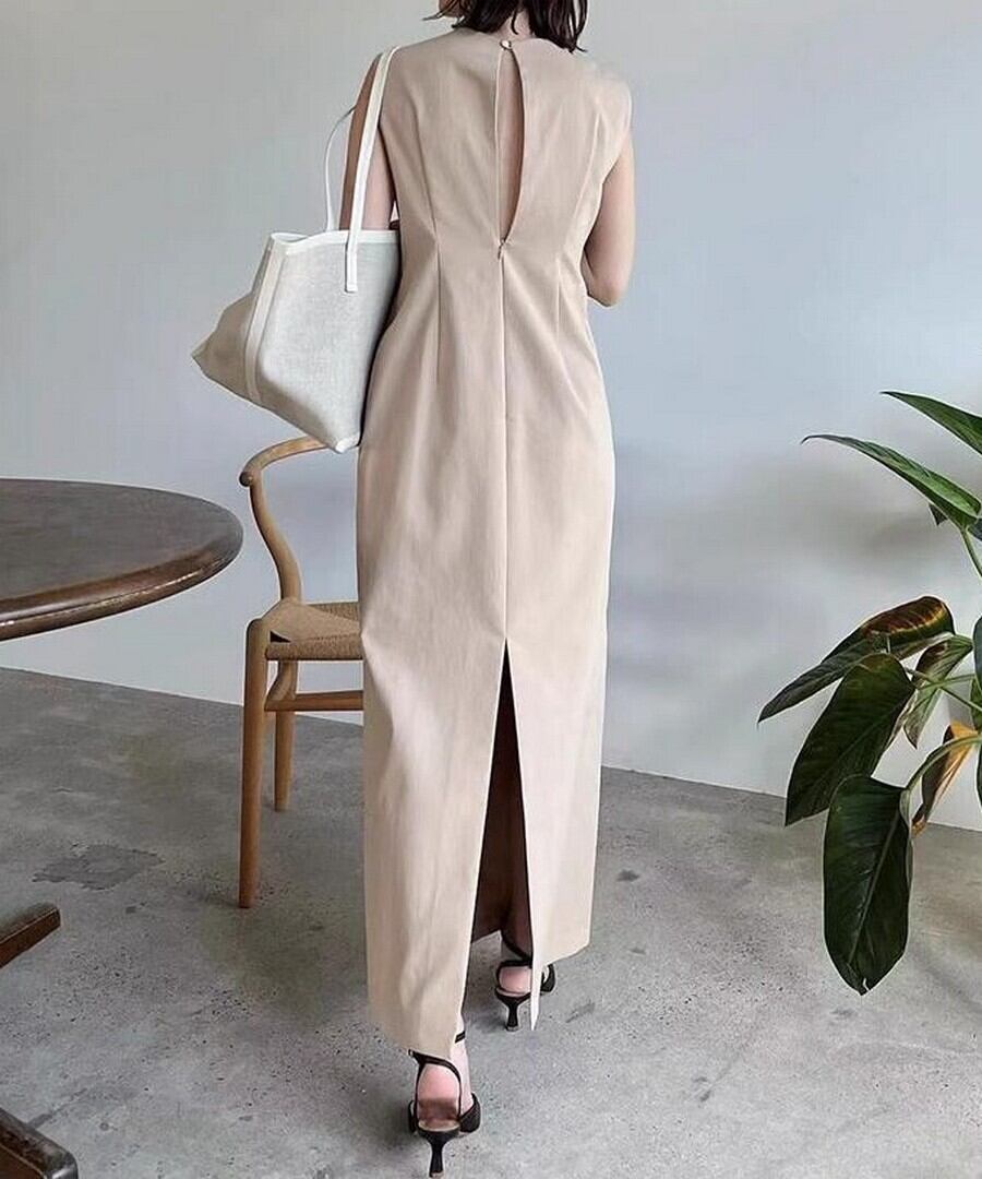 背中が大きく開いたノースリーブデザインとスリット入りのスタイルが、春夏の装いを一層華やかに演出します。