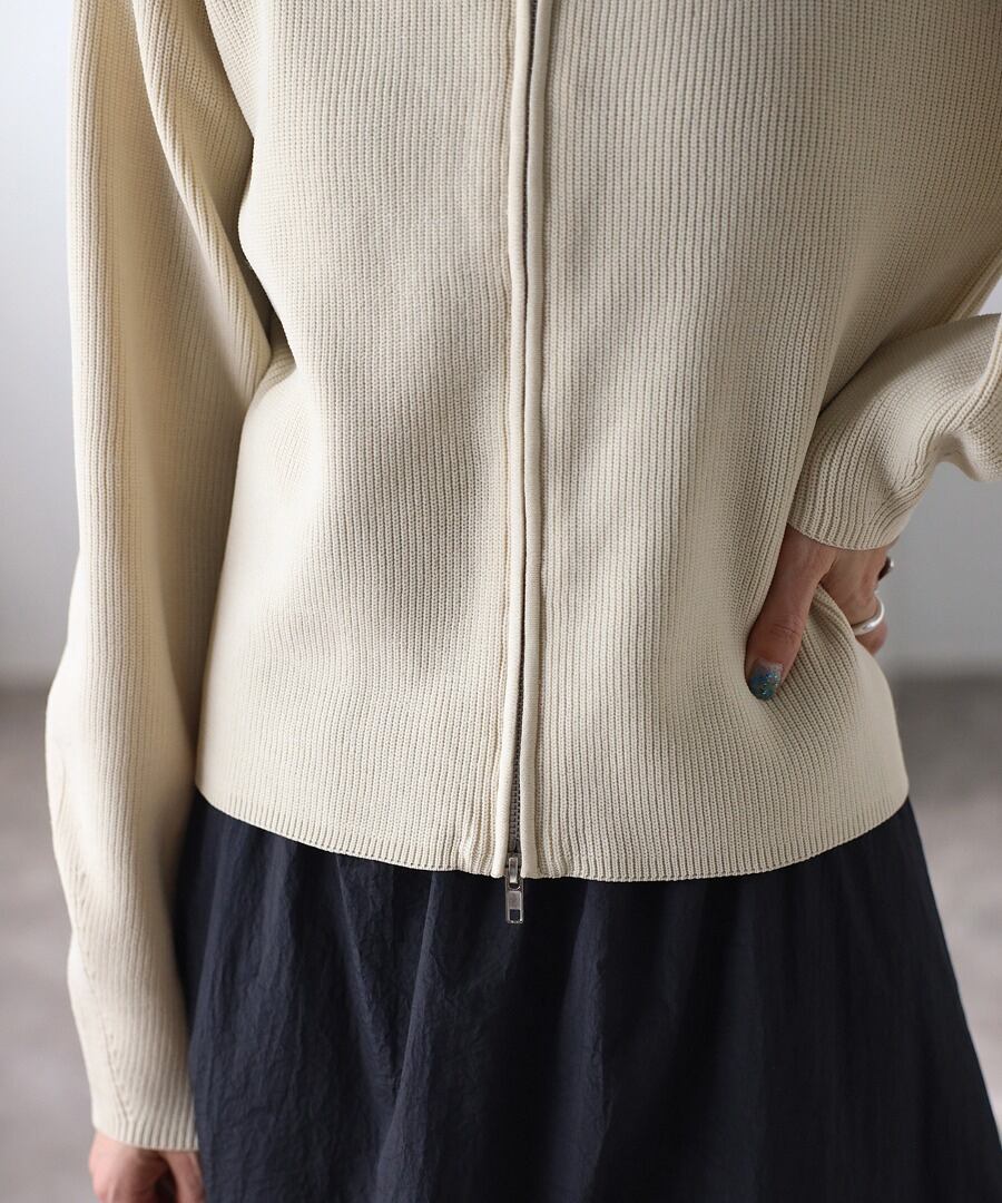 フロントのダブルジップがトレンド感のあるコンパクトカーディガン。