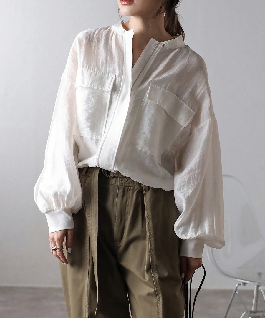 フラップ付きの大きな胸ポケットがポイントで、ワークテイストがトレンド感のあるデザイン。