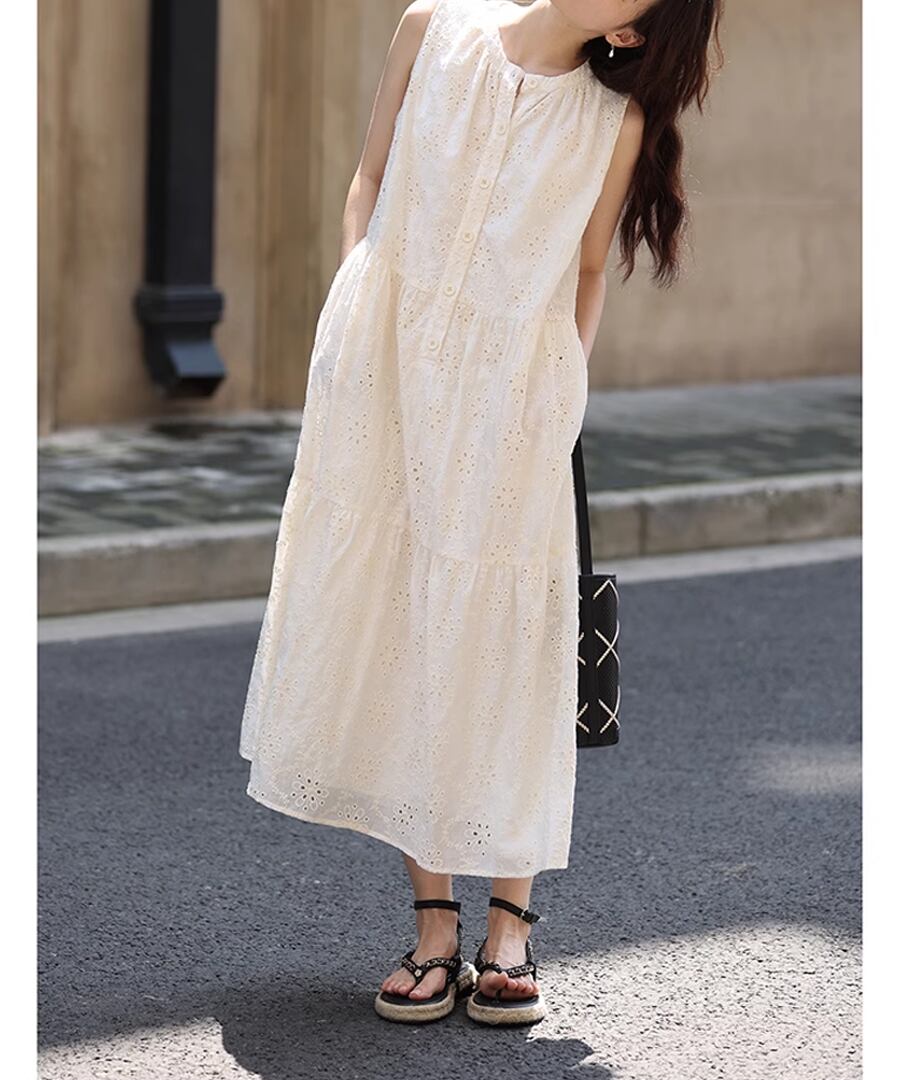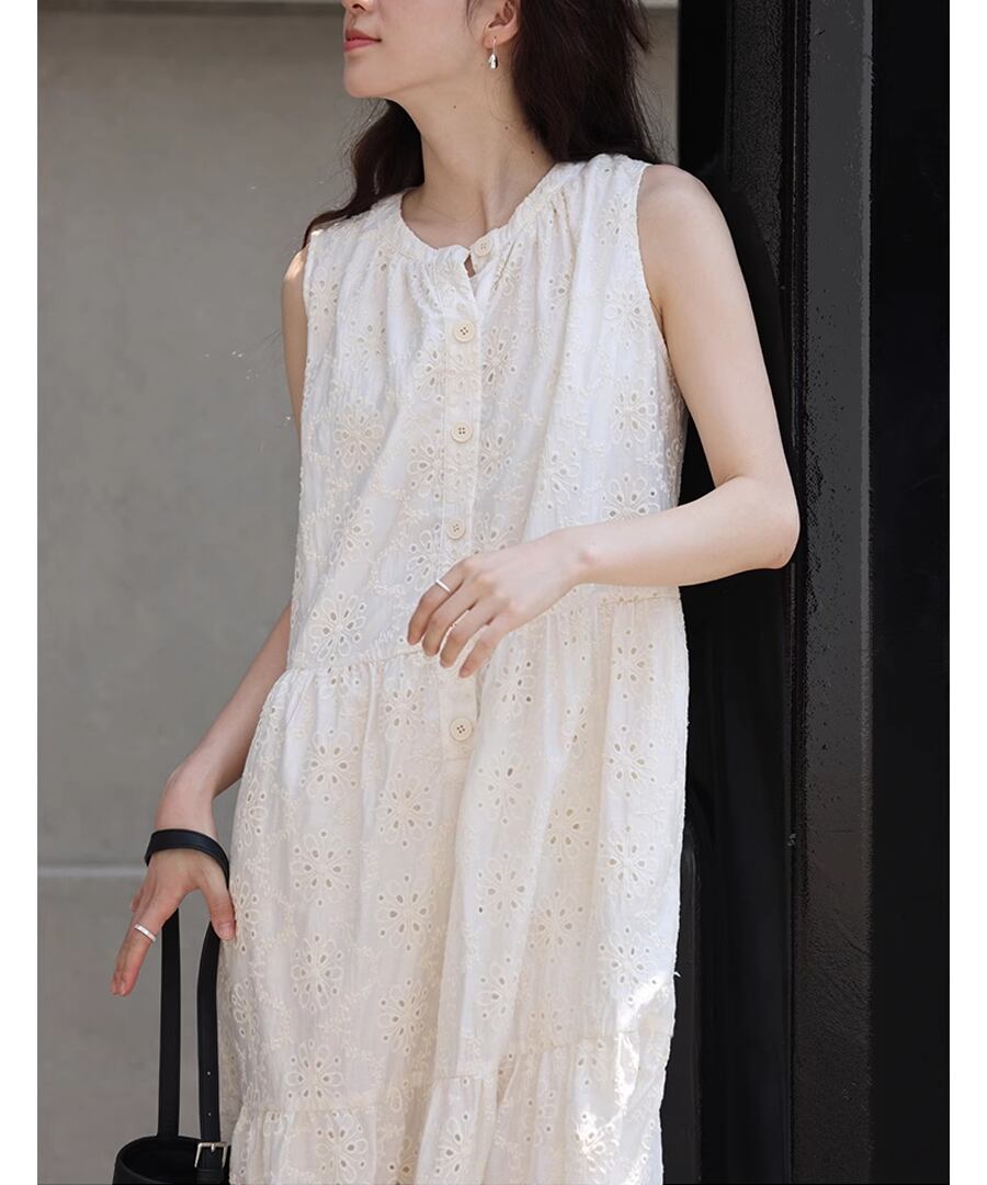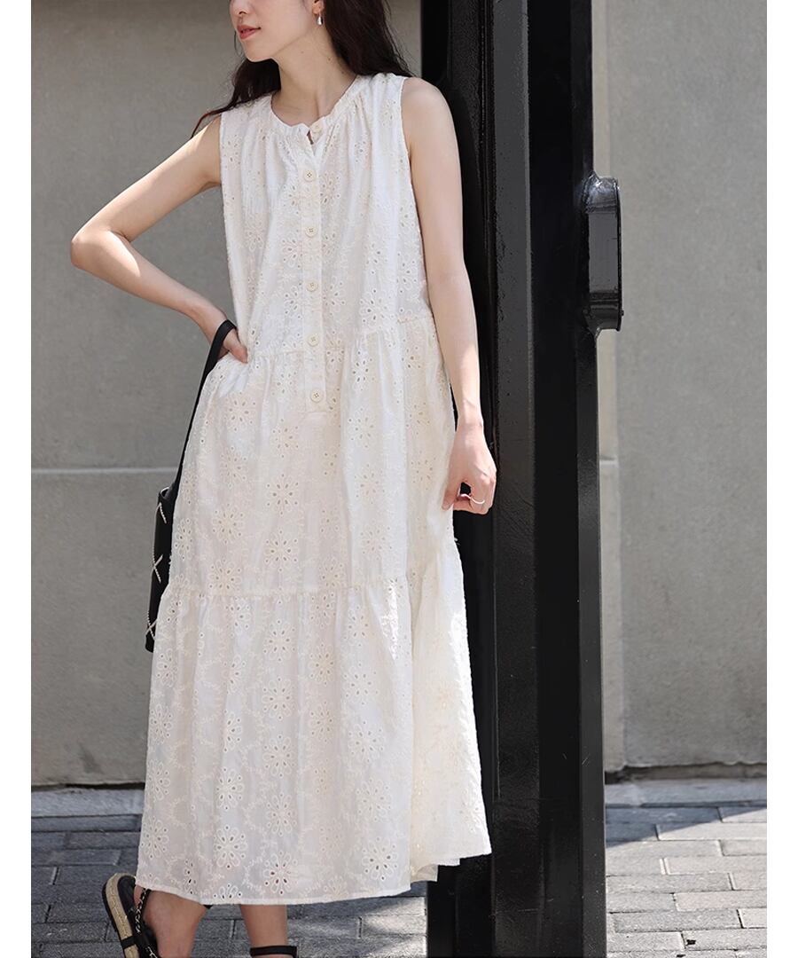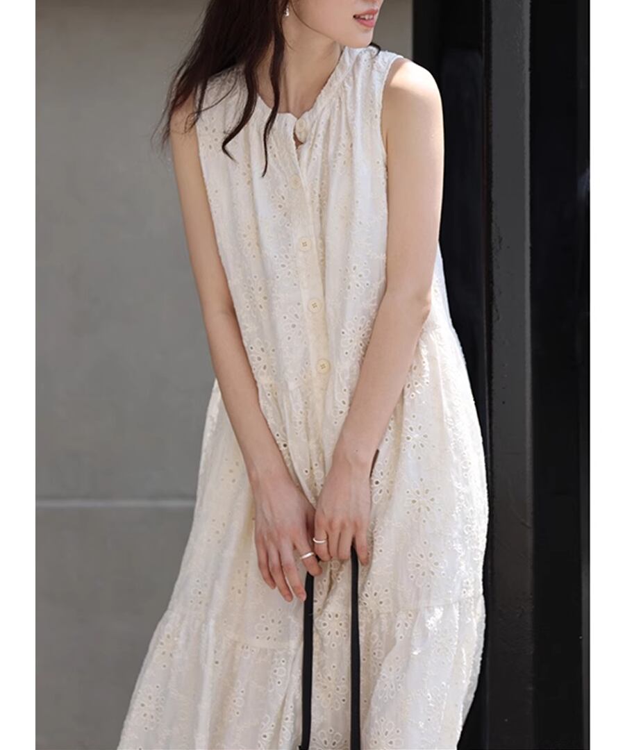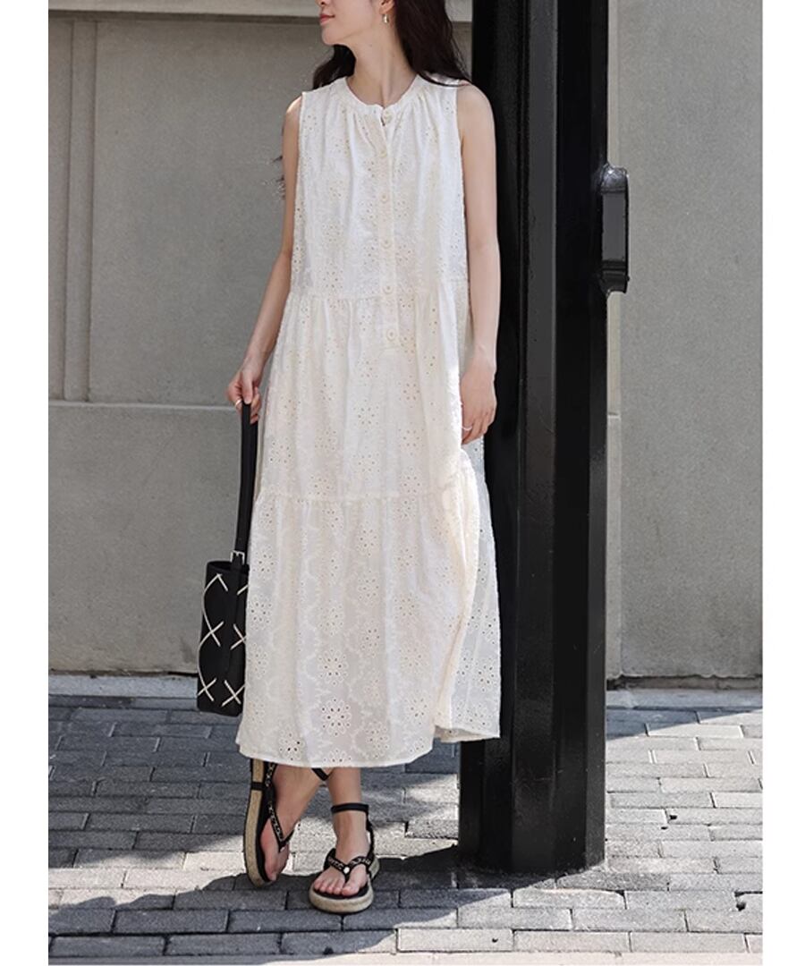 フレンチスタイルのクロシェ編みノースリーブデザインが、上品ながらもリラックスした雰囲気を演出します。