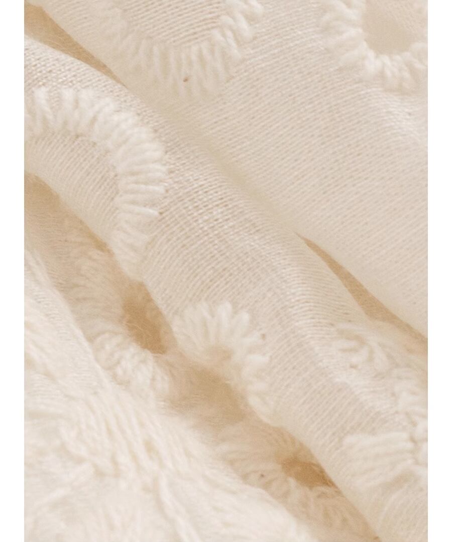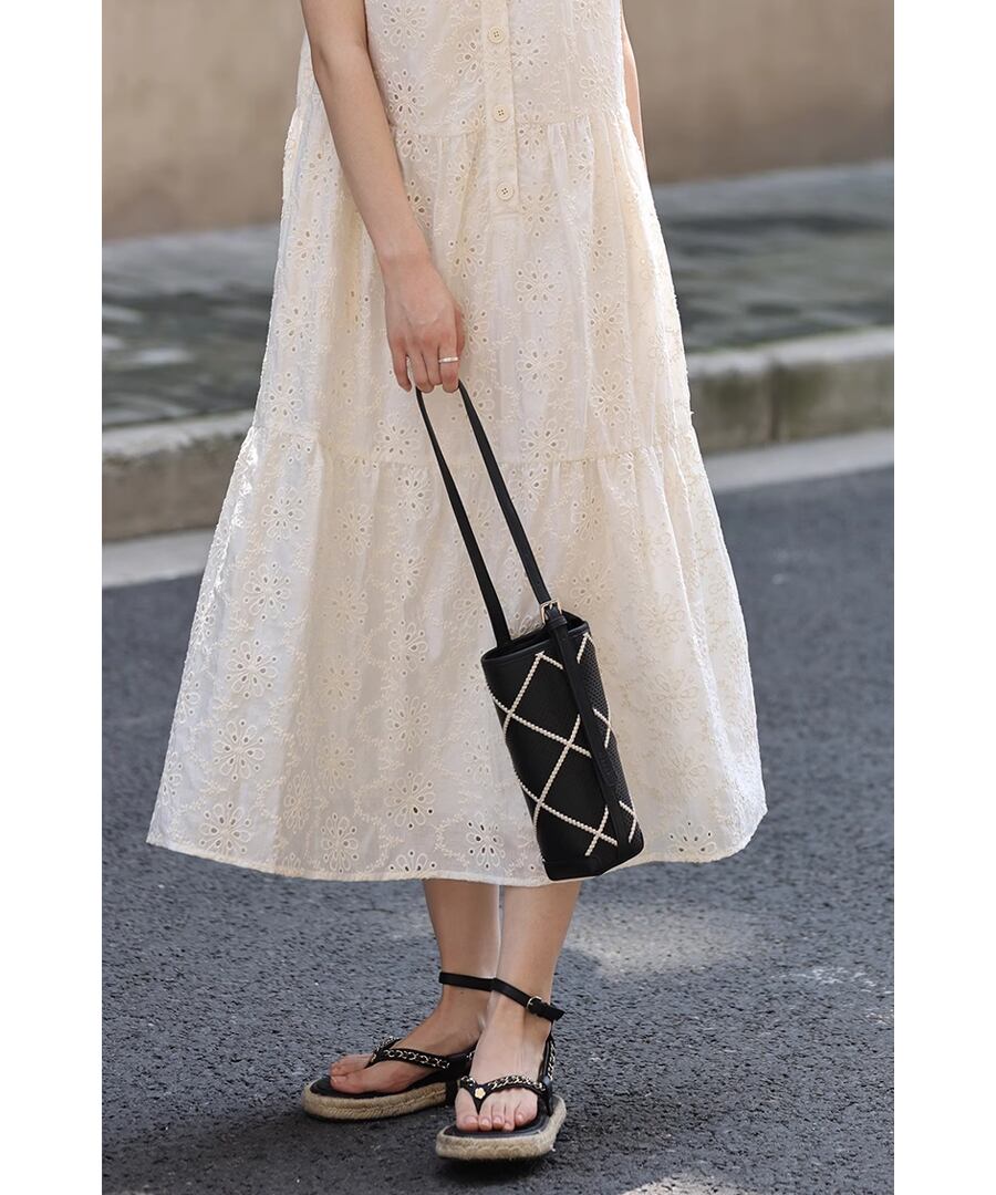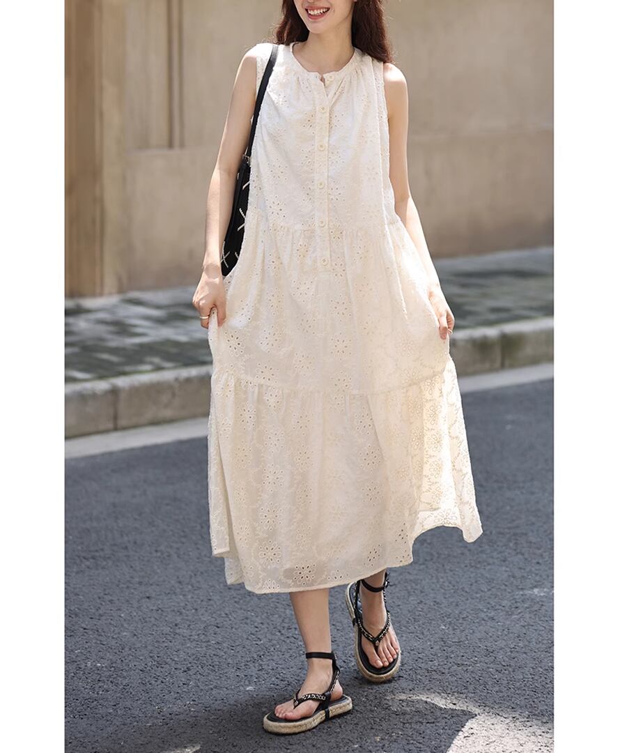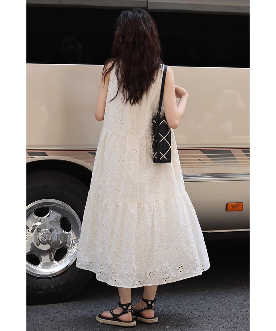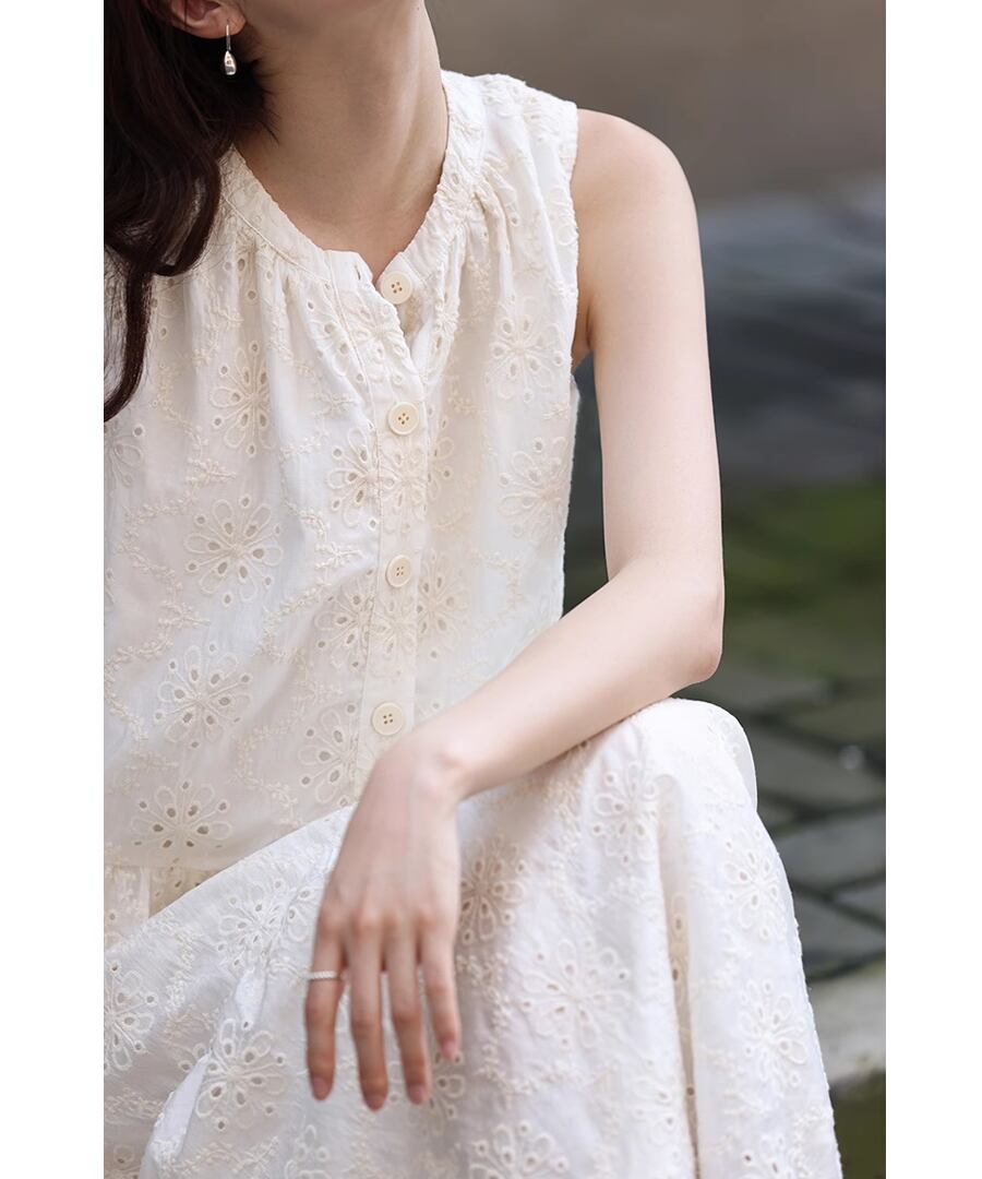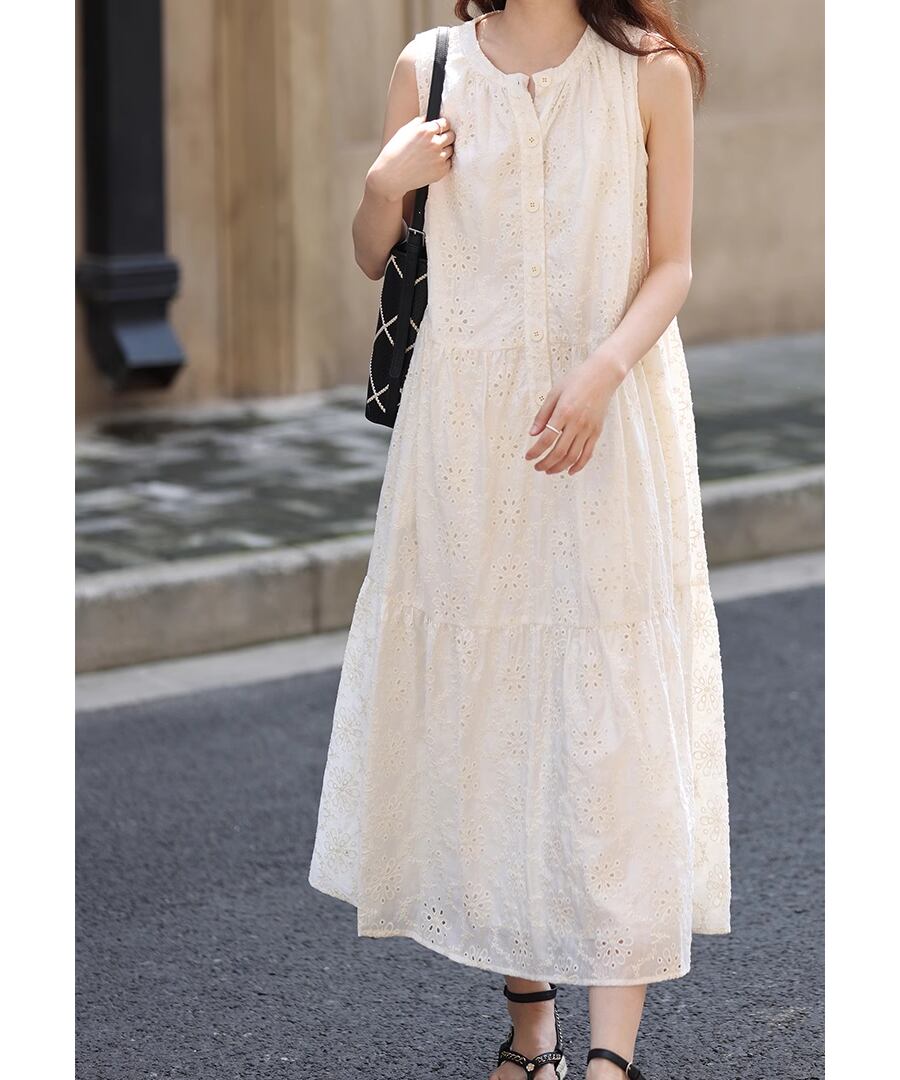 フレンチスタイルのクロシェ編みノースリーブデザインが、上品ながらもリラックスした雰囲気を演出します。