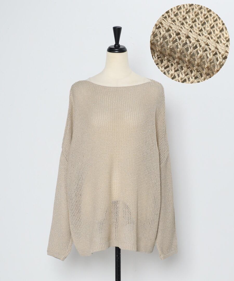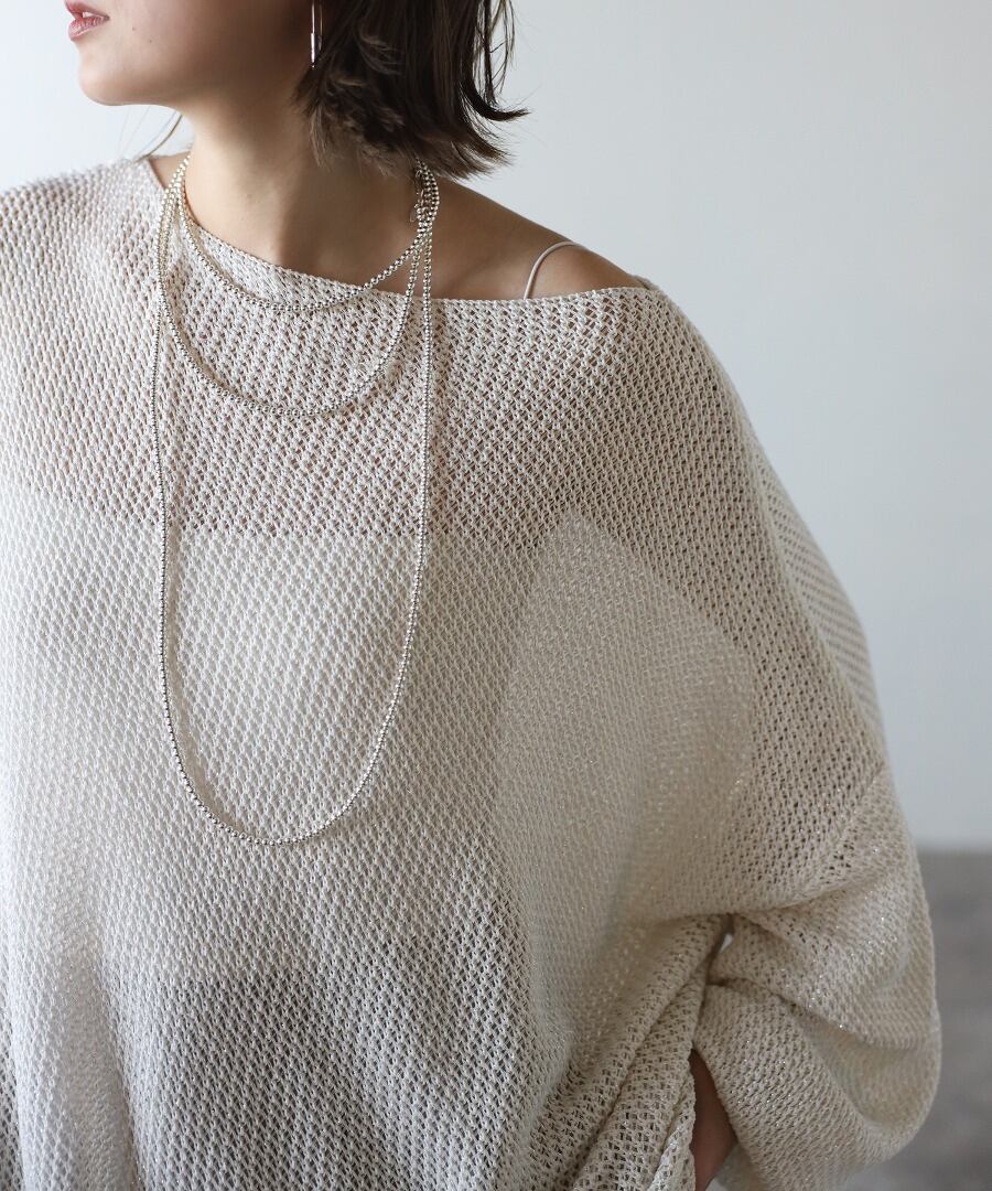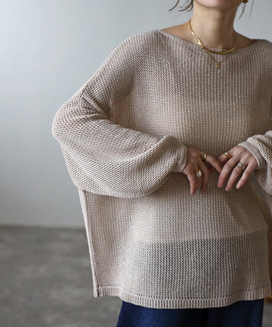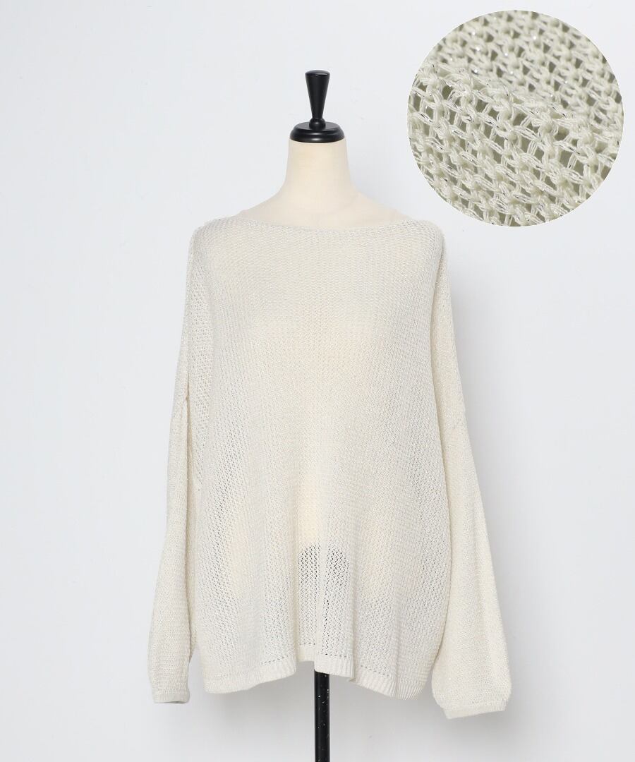 上品なシルバーのラメ糸が編み込まれたメッシュニットプルオーバー。