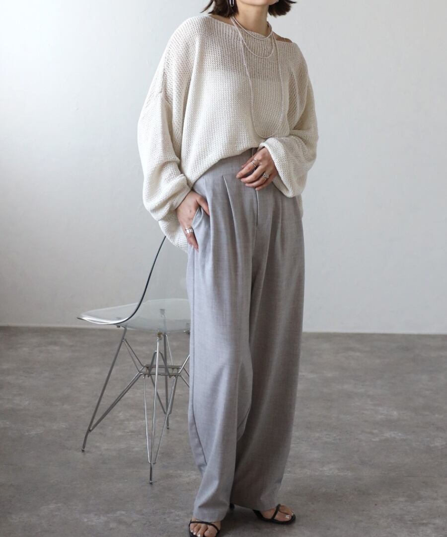 ゆったりシルエットに絶妙な広さのボートネックが、リラクシーでヘルシーなデザイン。