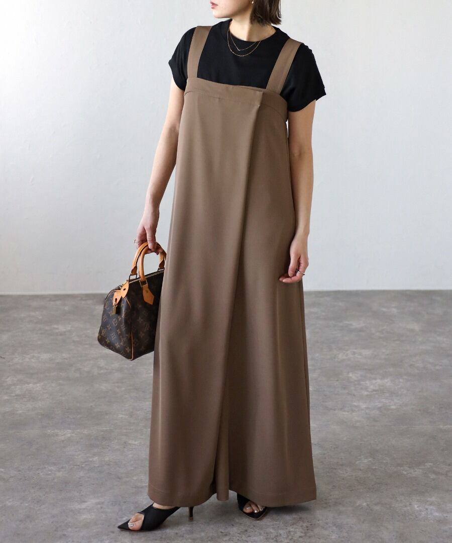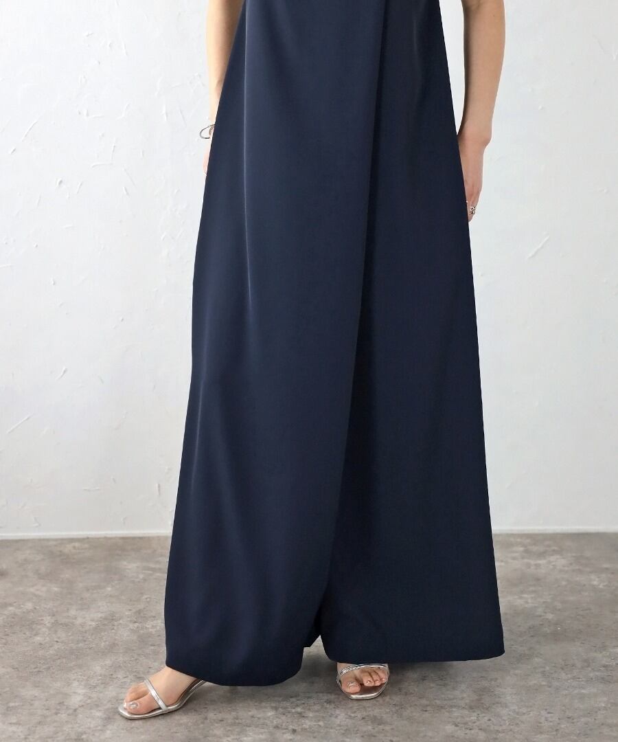 アシンメトリーデザインが上品でリュクスな印象に。大人女子のオールインワン