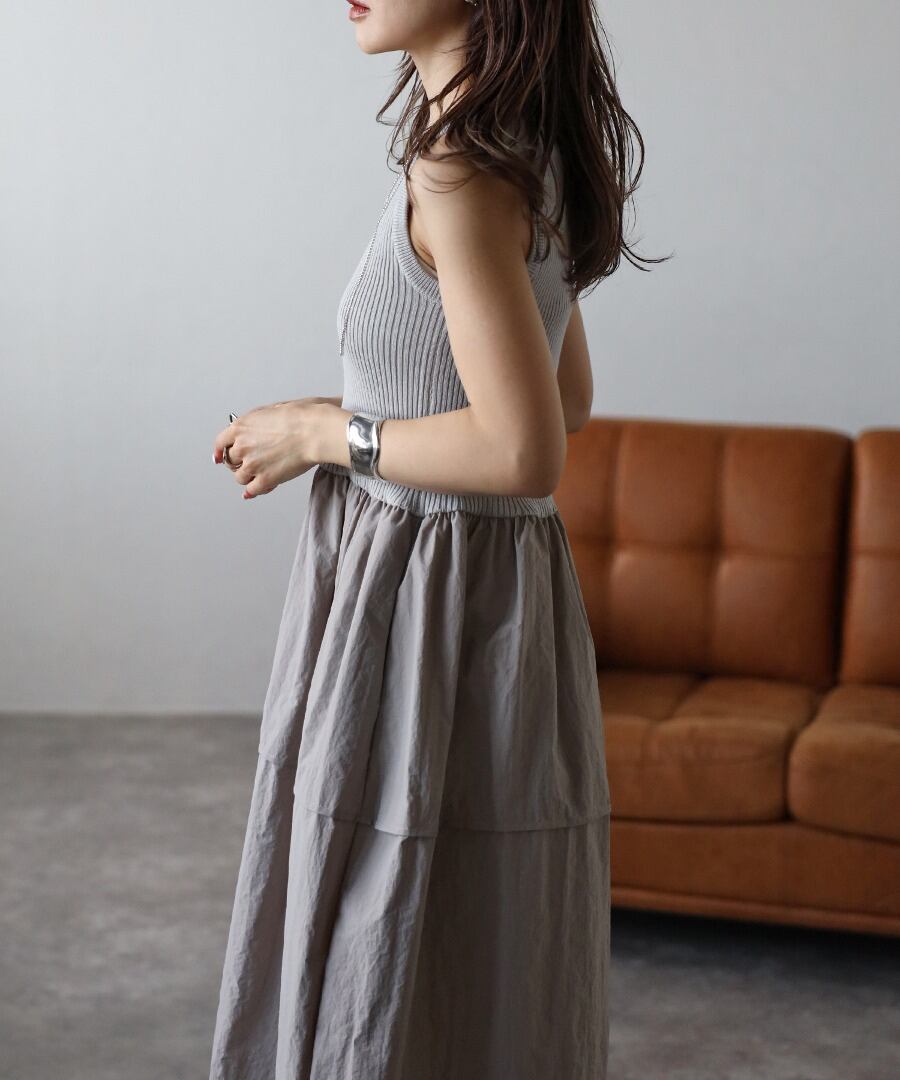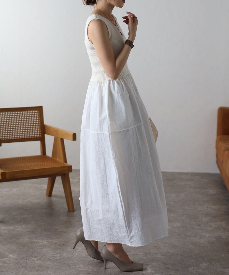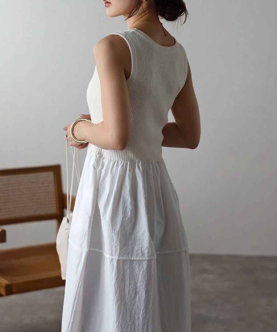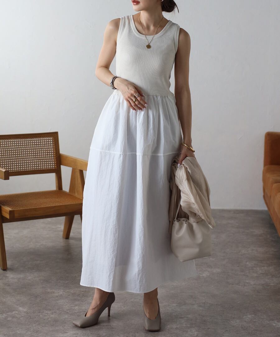 トップスとスカートを異素材のワントーンで組み合わせた女性らしいノースリーブワンピース。