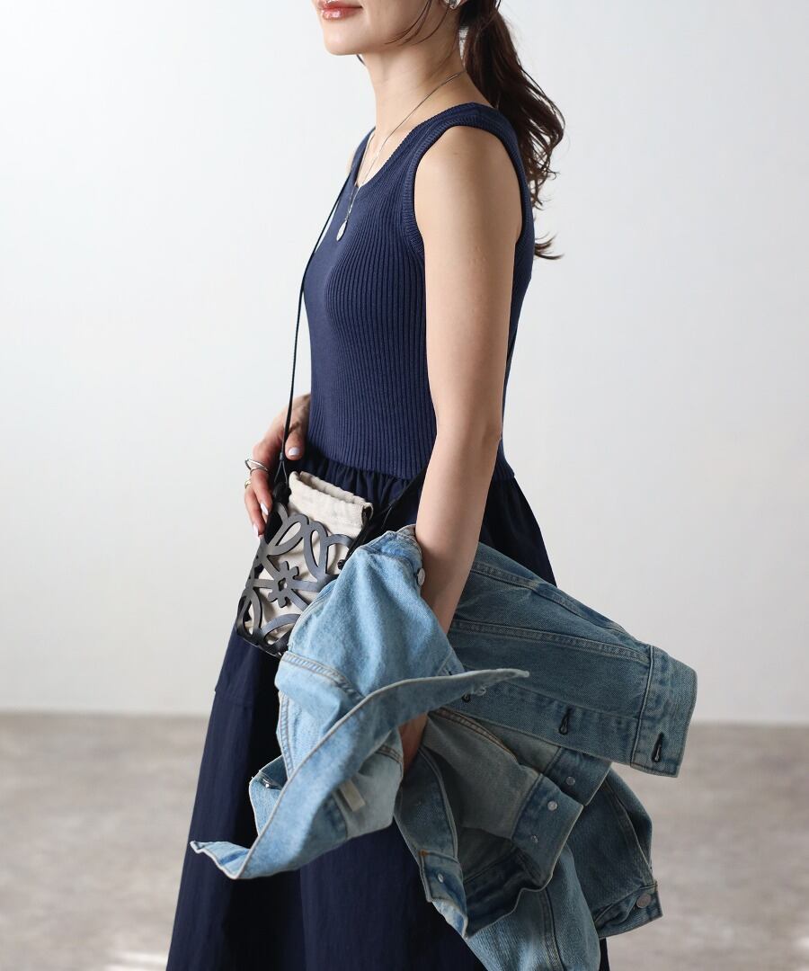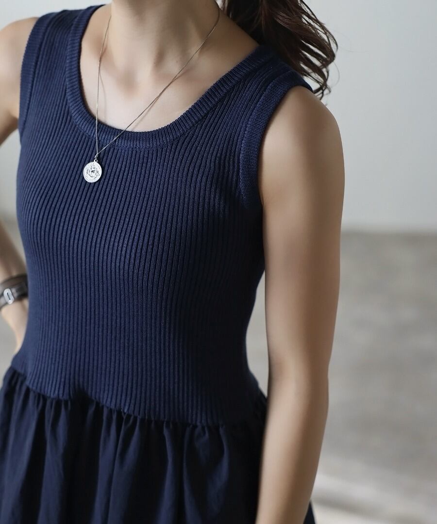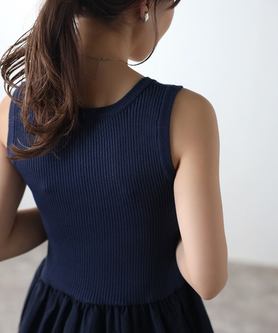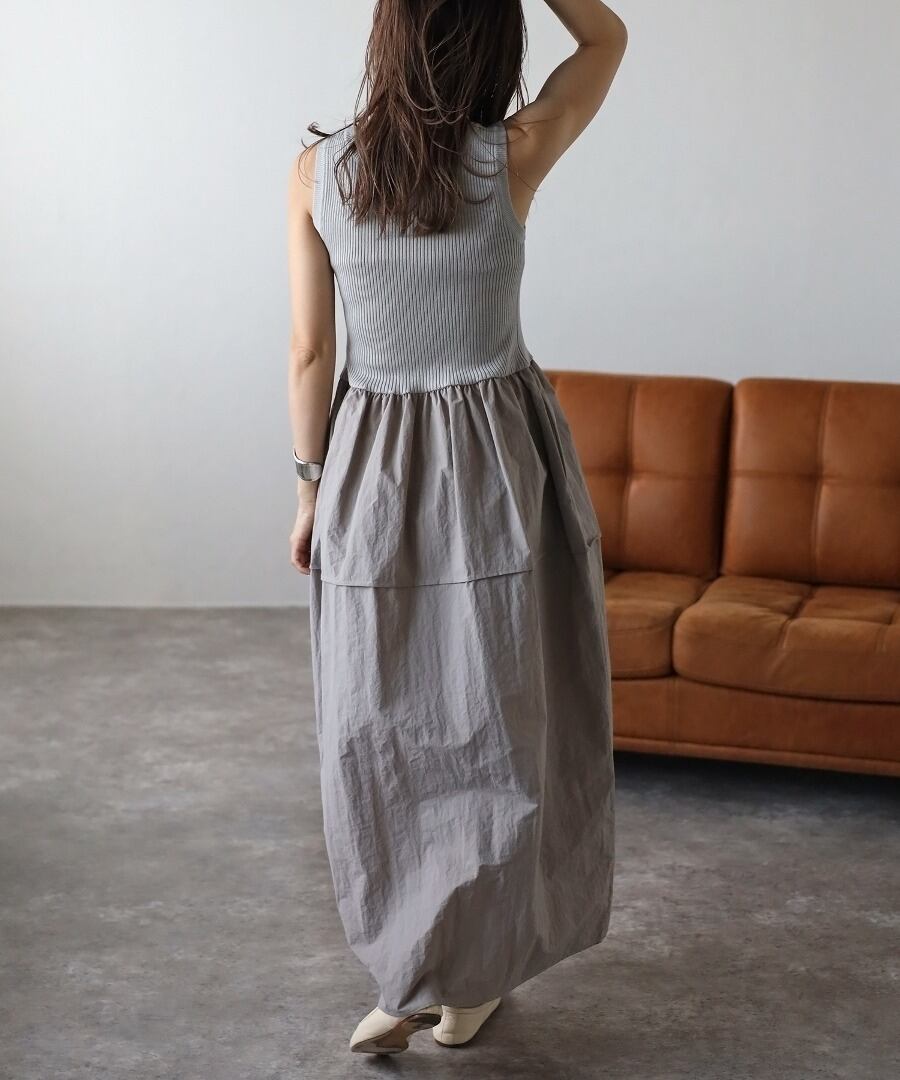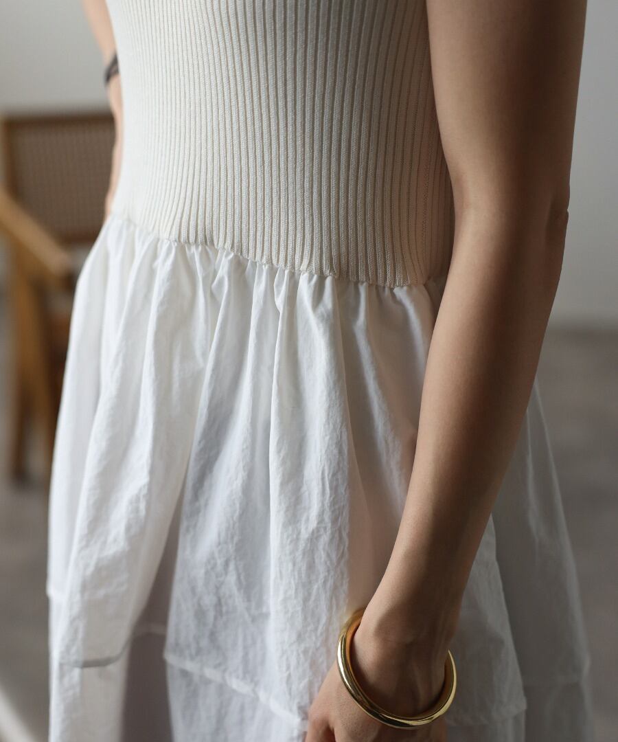 トップスとスカートを異素材のワントーンで組み合わせた女性らしいノースリーブワンピース。