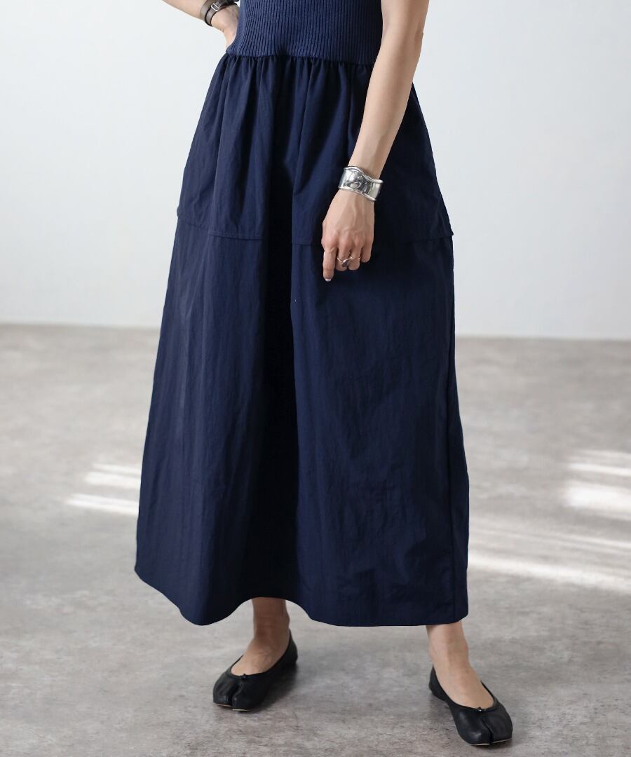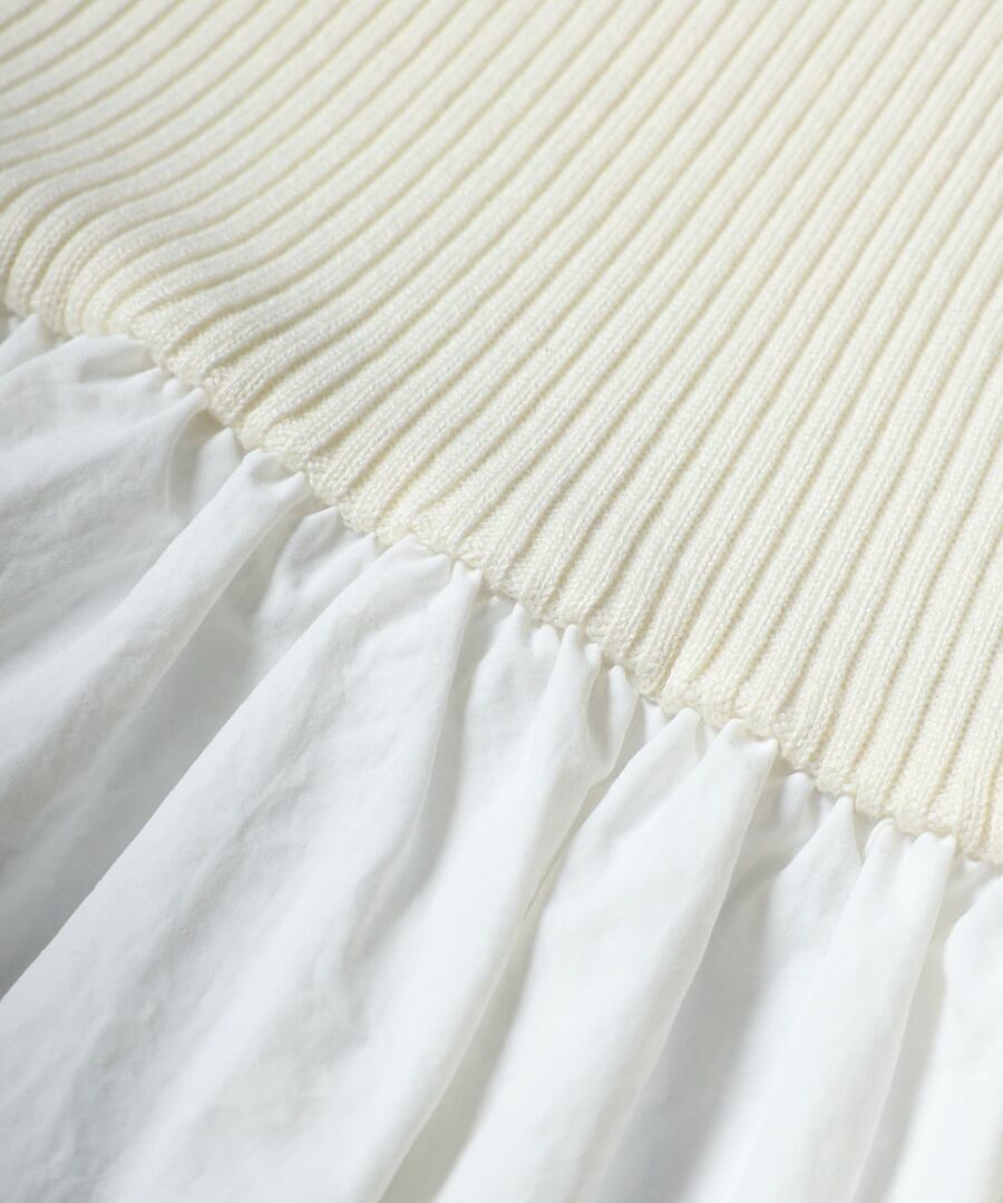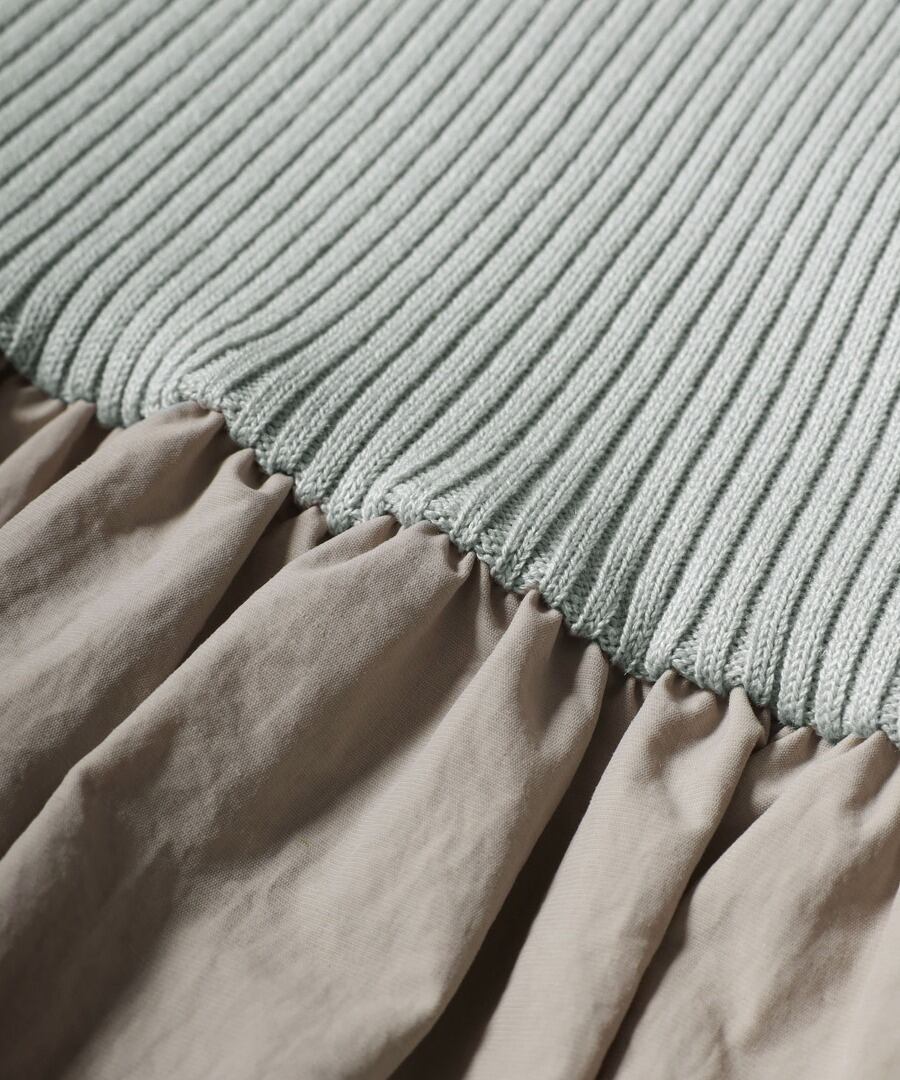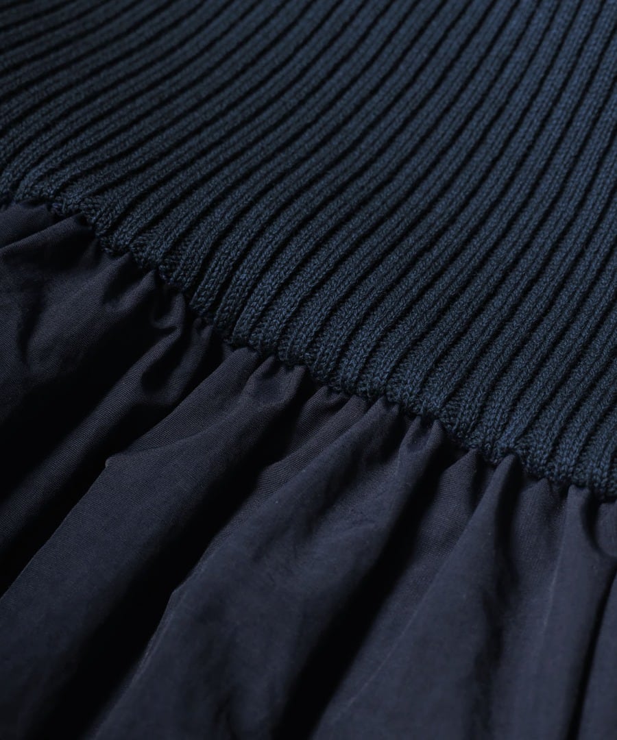 ニット素材のミニマルなトップスに、ナイロン素材のコクーンスカートをドッキングしたデザインです。