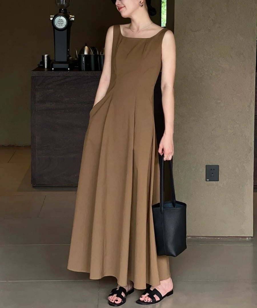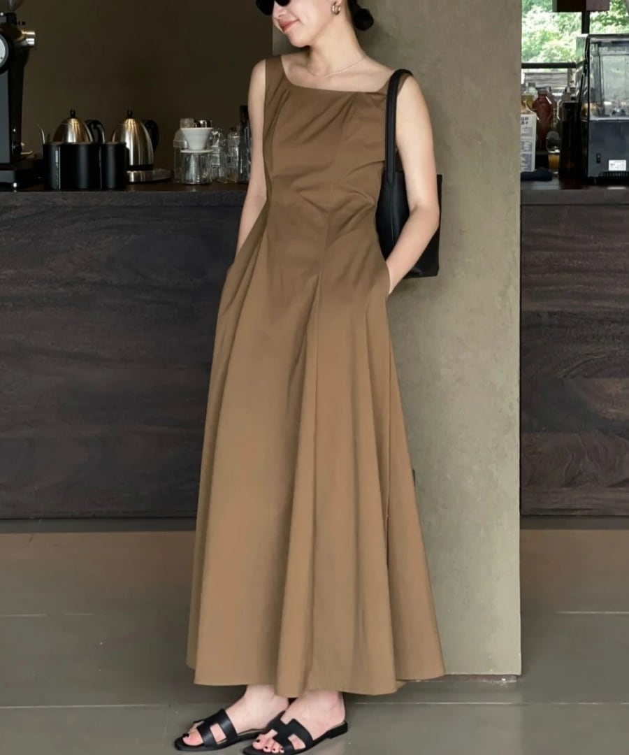 シンプルな中にも、フレンチレトロの魅力と女性らしさが詰まったスクエアネックノースリーブワンピース。