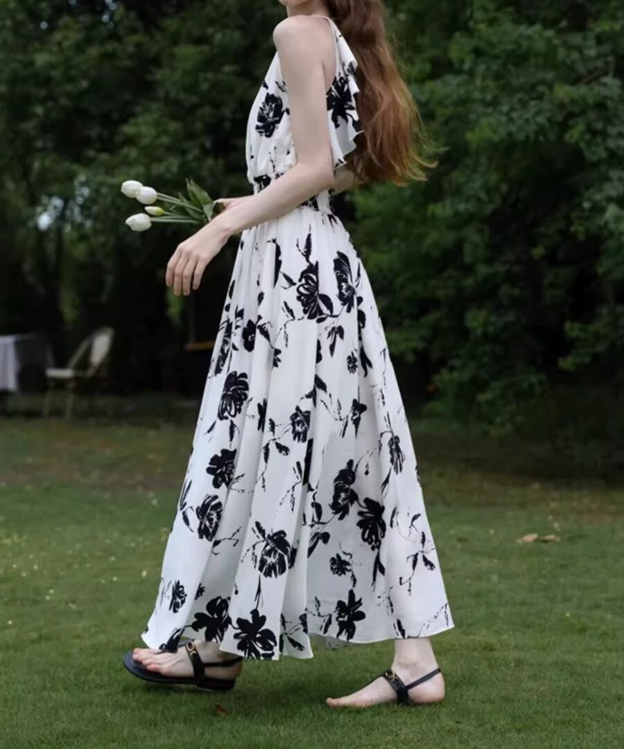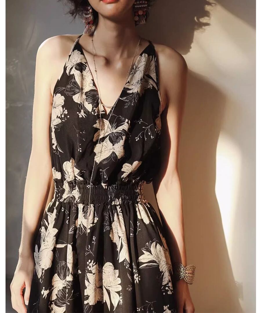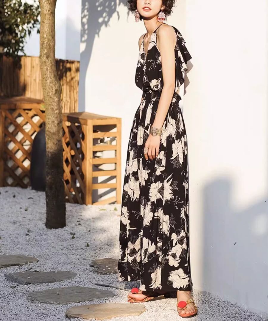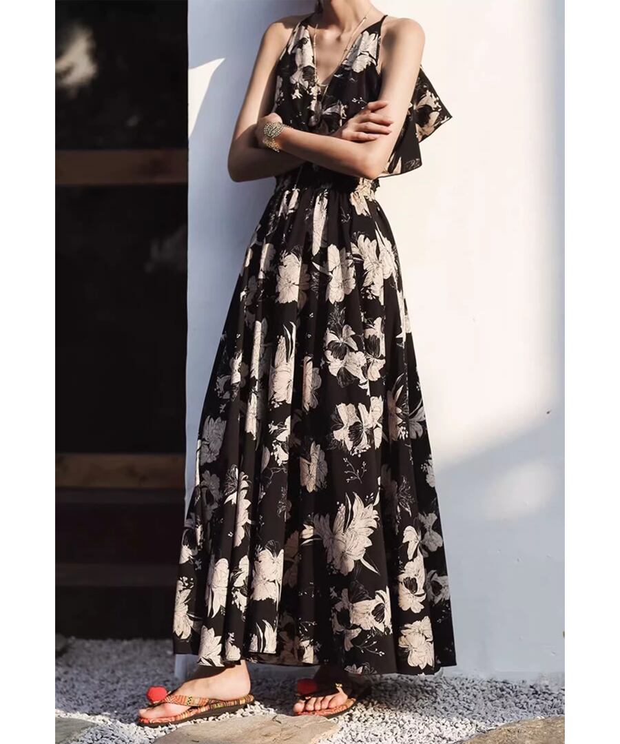 背中が開いたスタイルとリゾート感あふれるロング丈が、あなたの魅力を引き立て、海辺のひとときを特別なものにします。