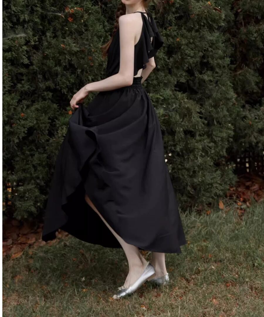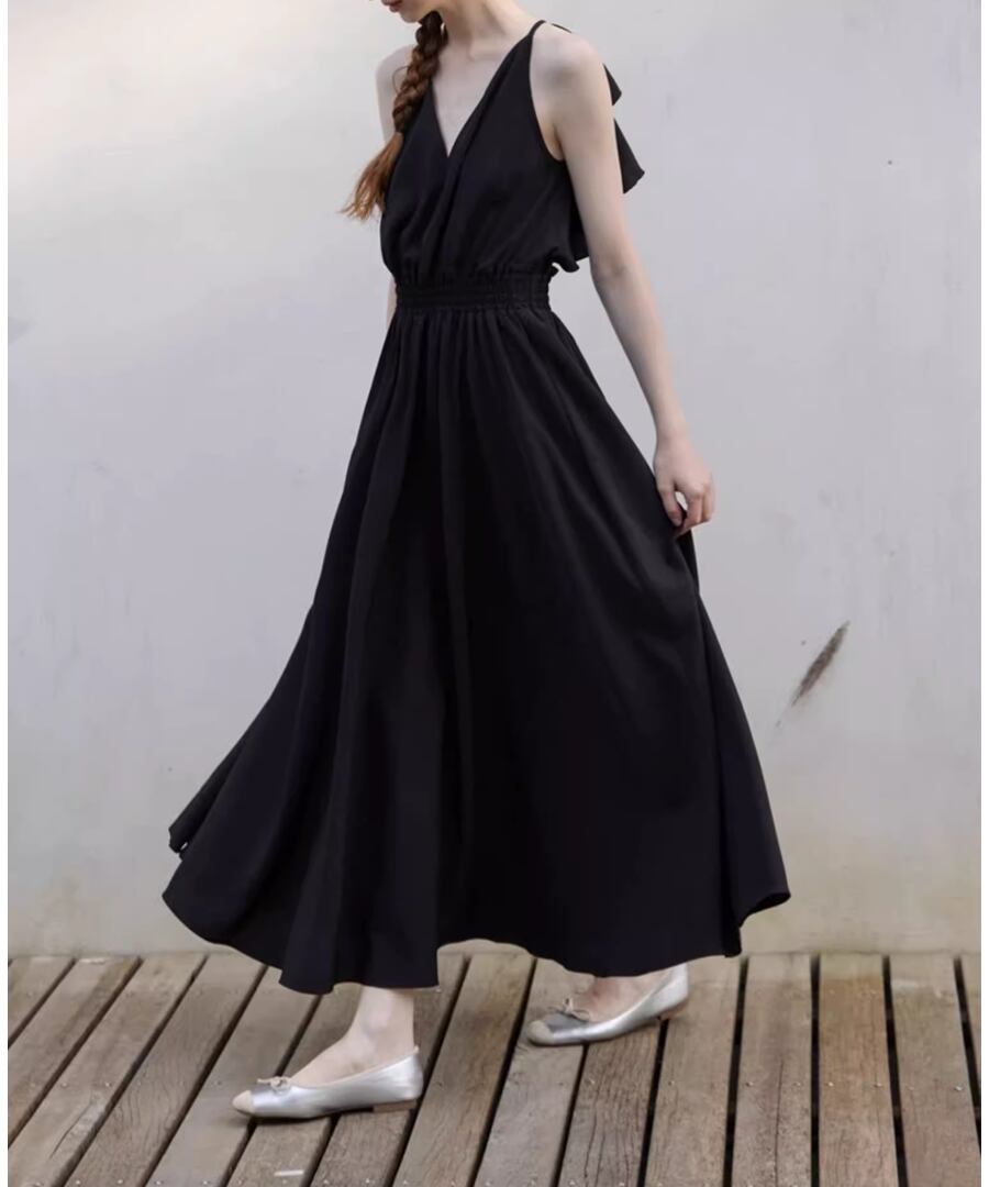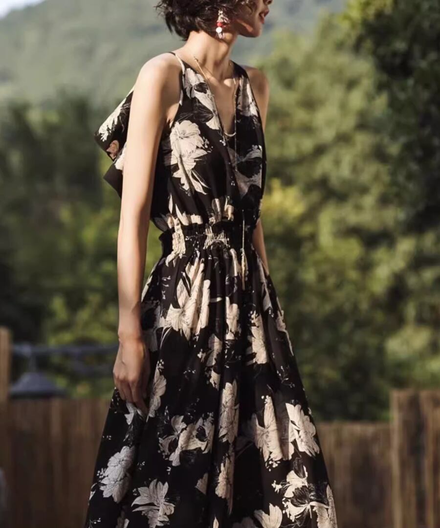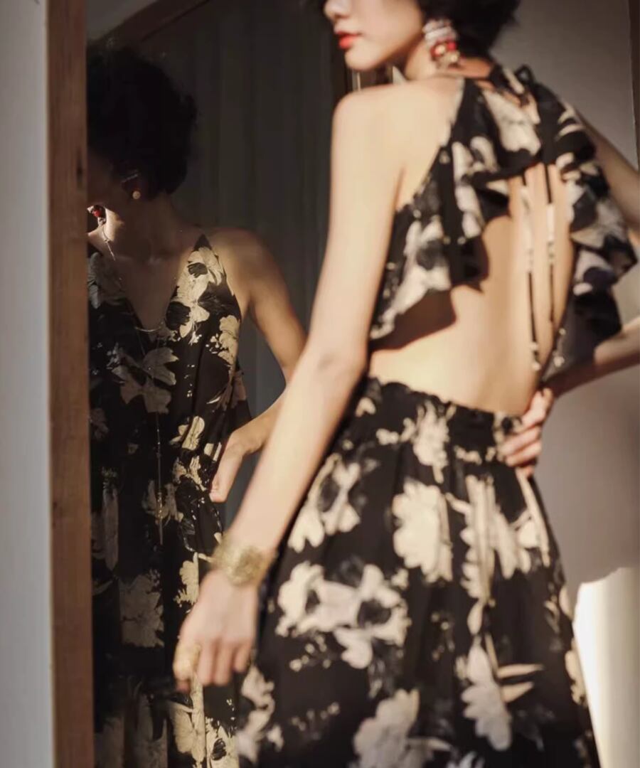 背中が開いたスタイルとリゾート感あふれるロング丈が、あなたの魅力を引き立て、海辺のひとときを特別なものにします。