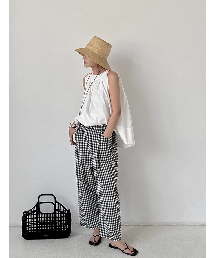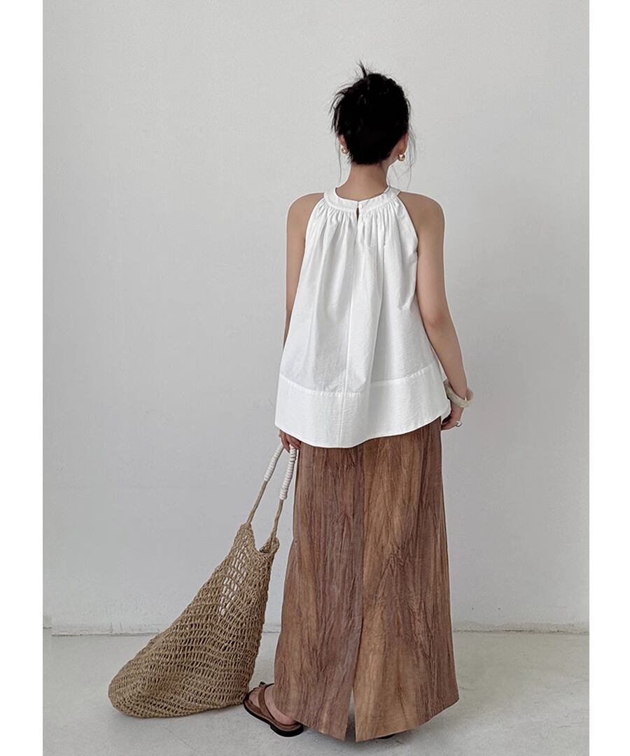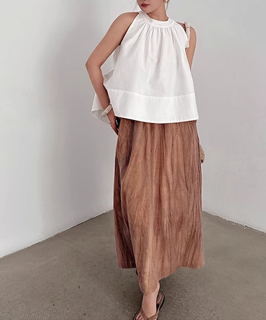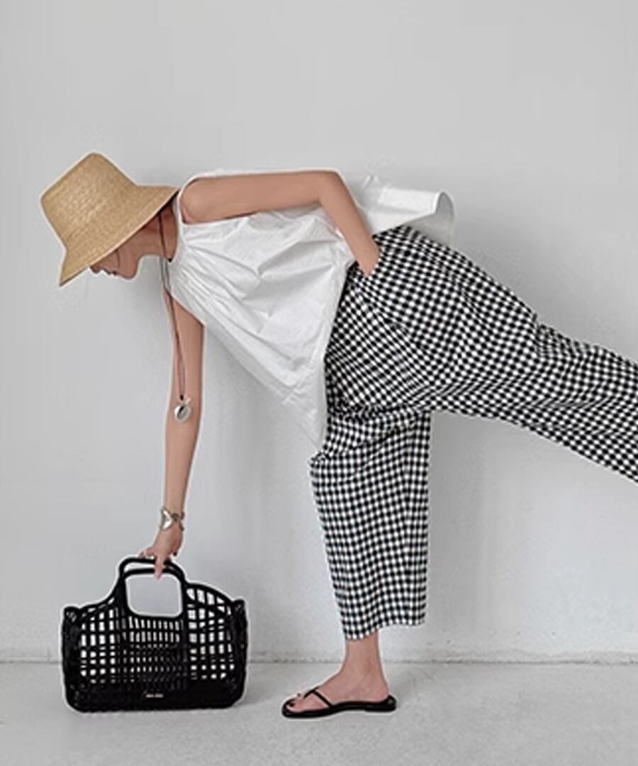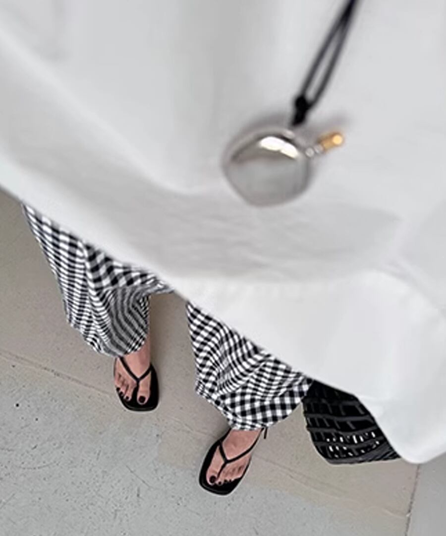 ワイドレッグパンツやソリッドカラーのミディスカートと合わせると