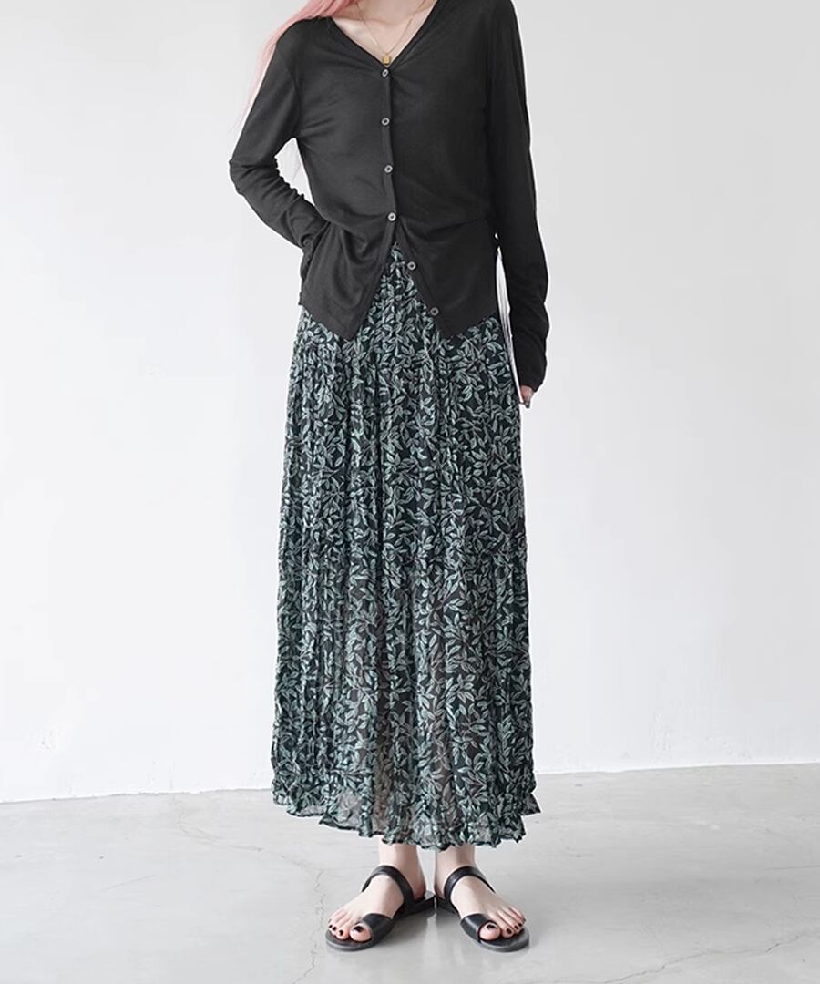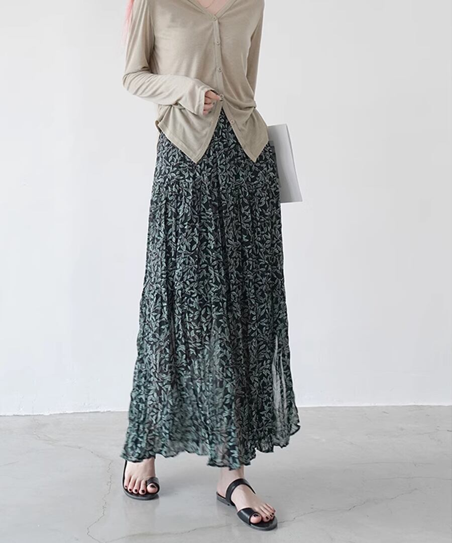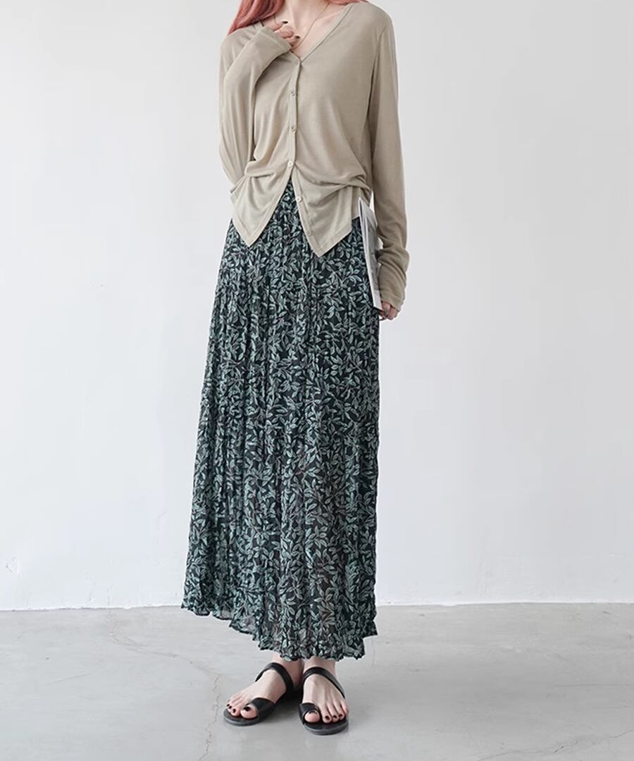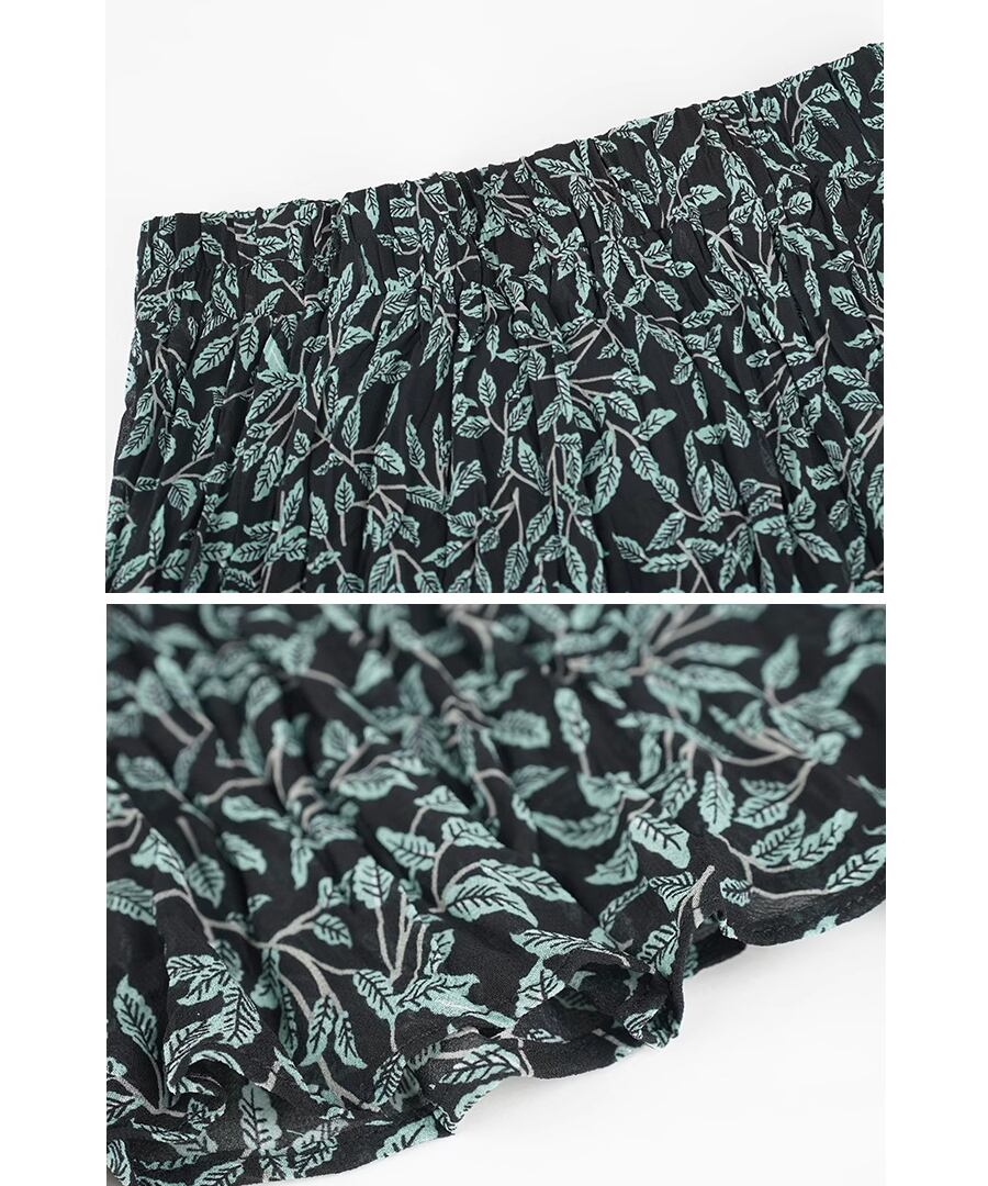 リーフ柄とプリーツの組み合わせは大人の女性にぴったり。