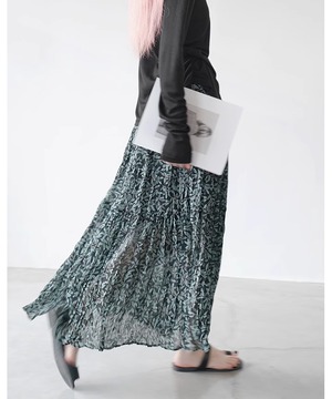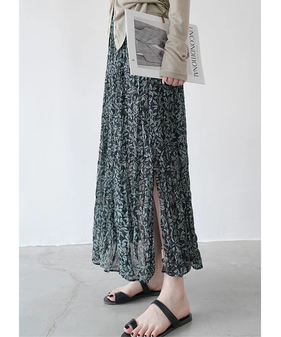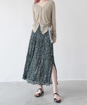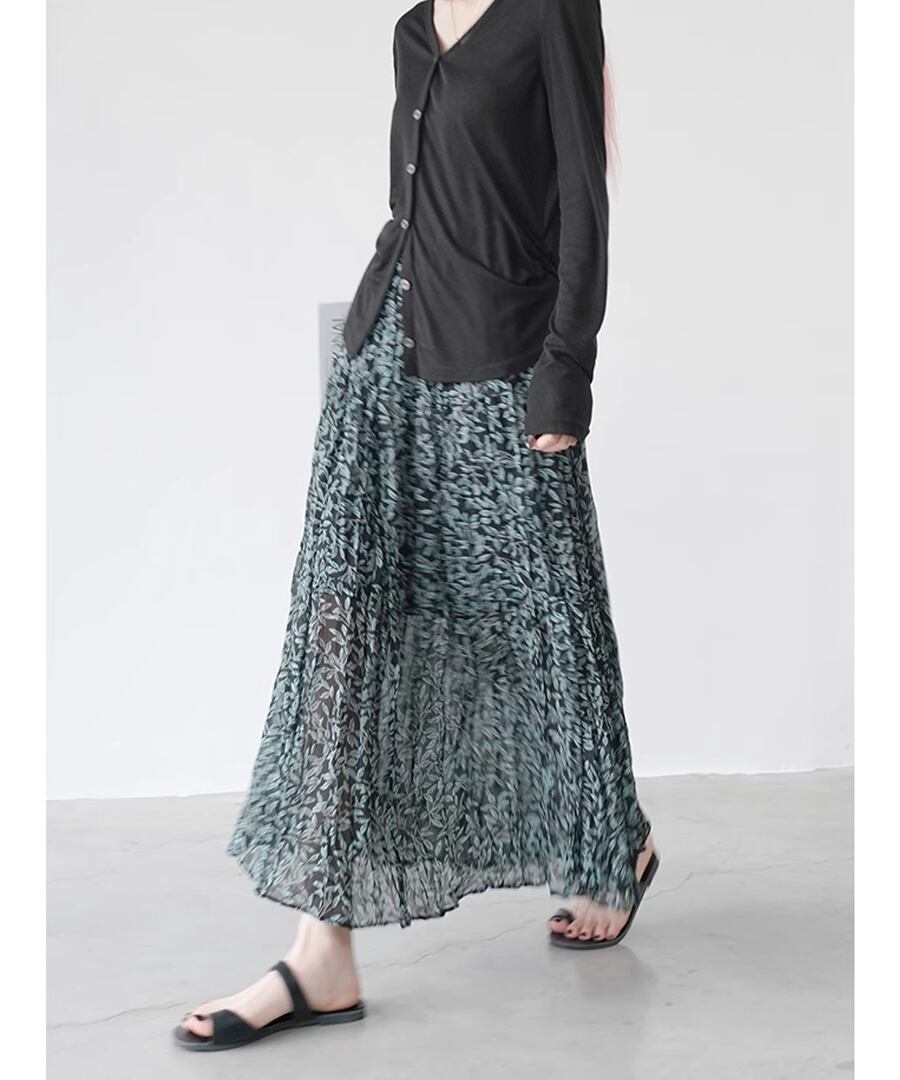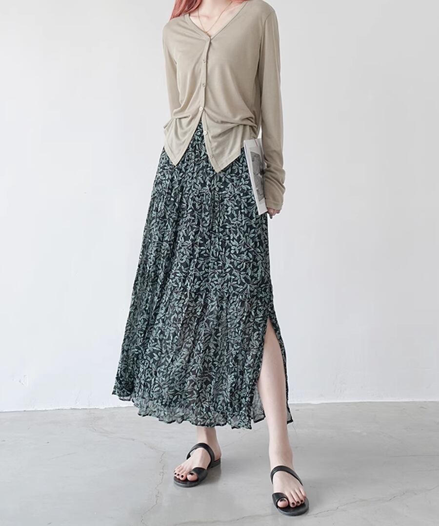 リーフ柄とプリーツの組み合わせは大人の女性にぴったり。