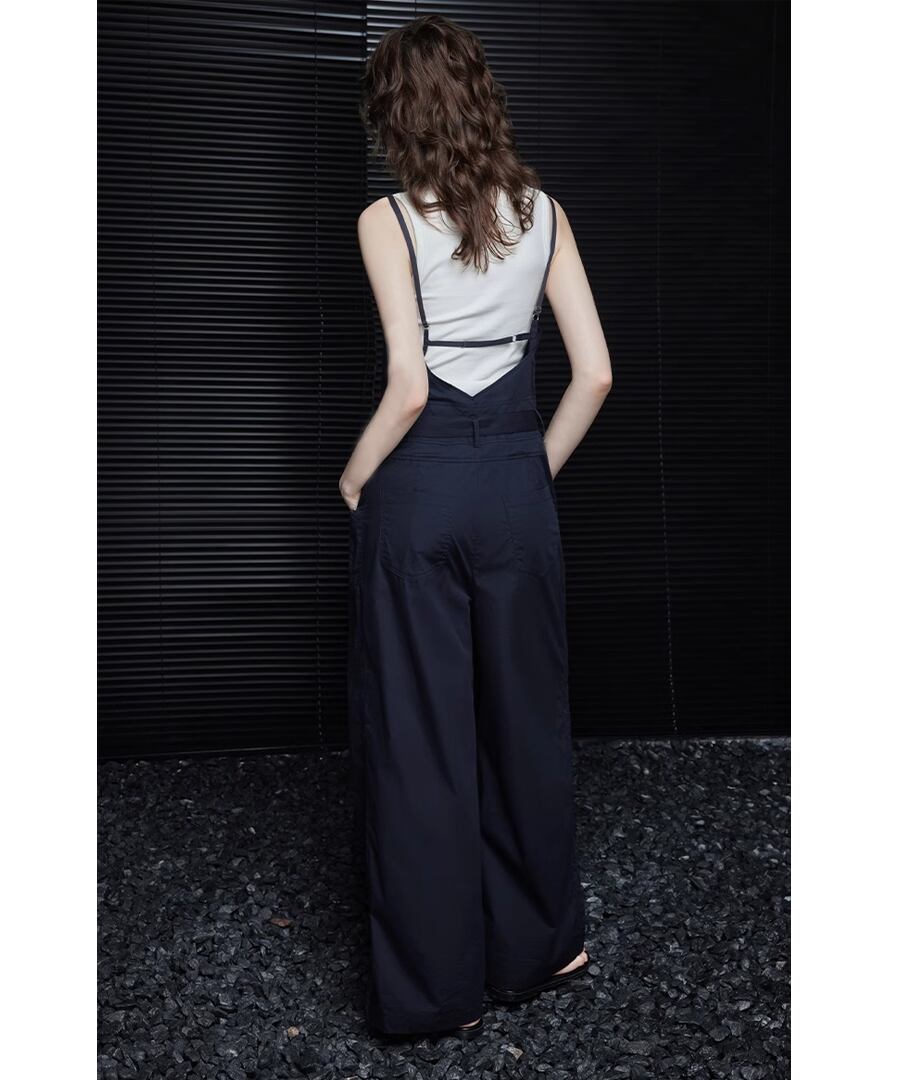 ボーイッシュになりがちなジャンプスーツを華奢なストラップで女性らしさを演出。