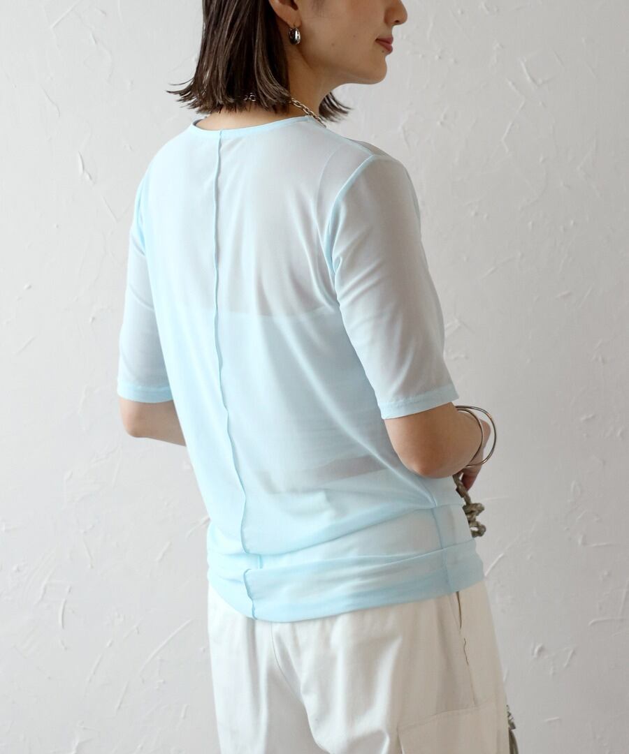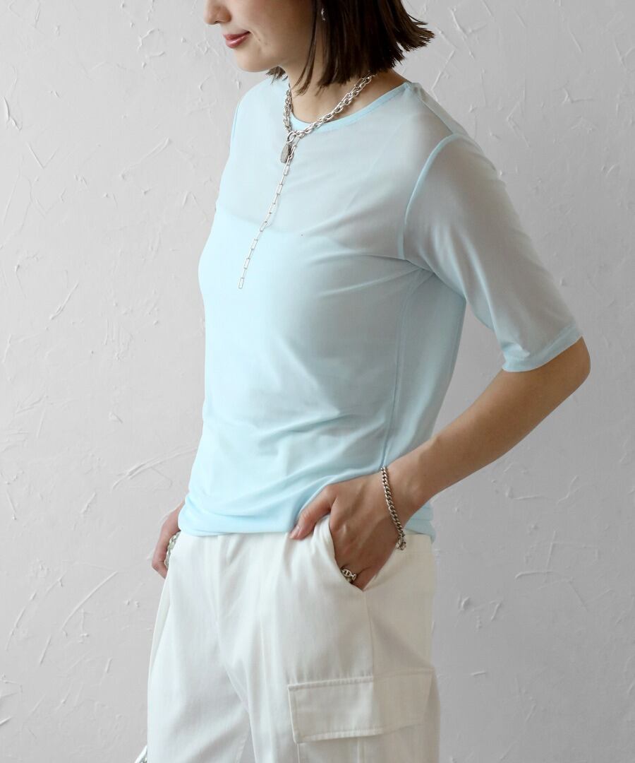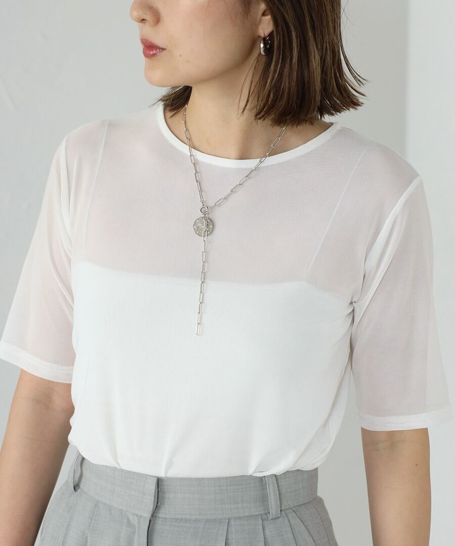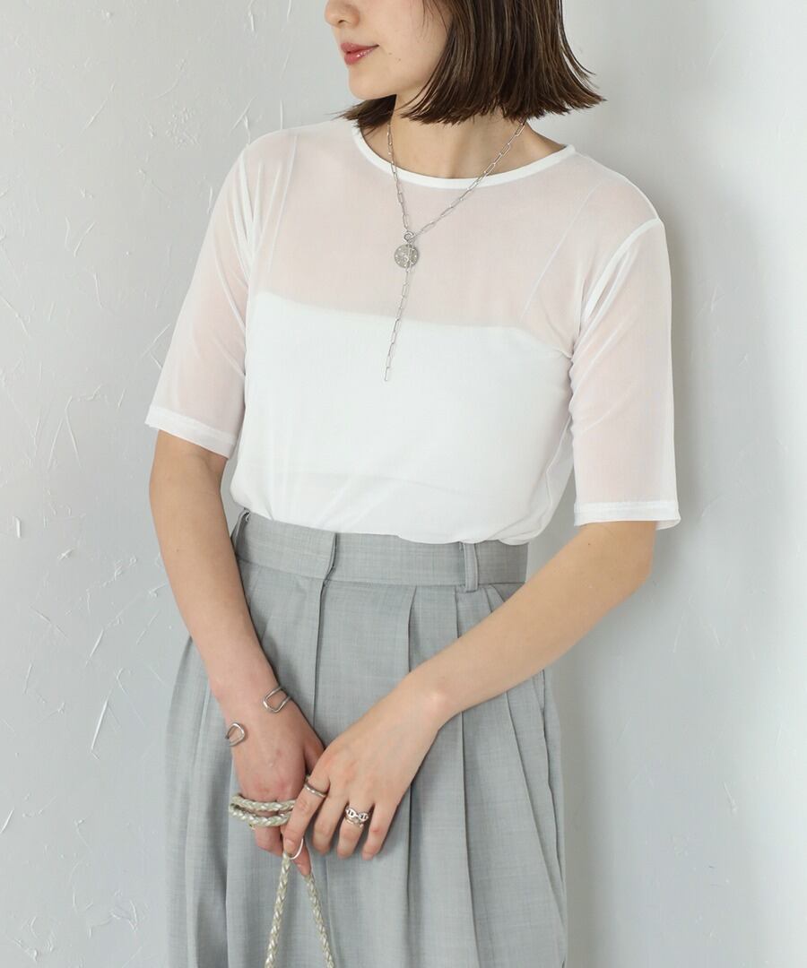 旬なレイヤードスタイルに重宝するクルーネックのシアーTシャツ。