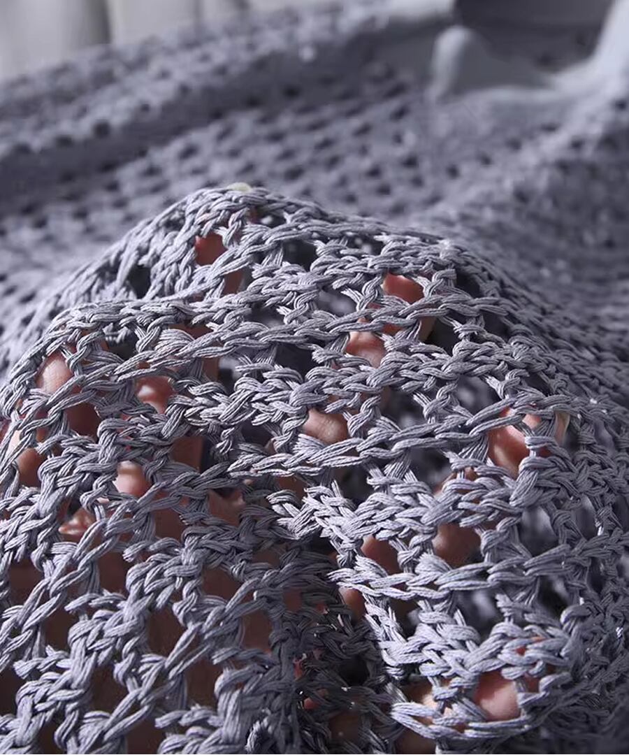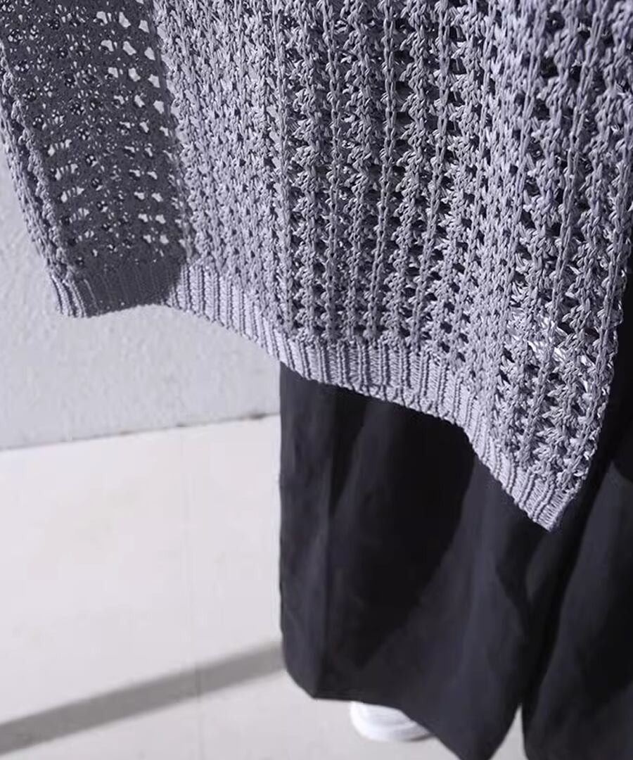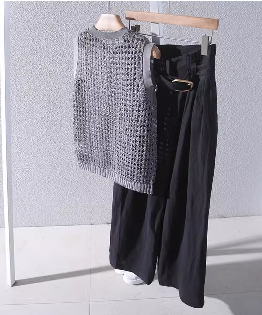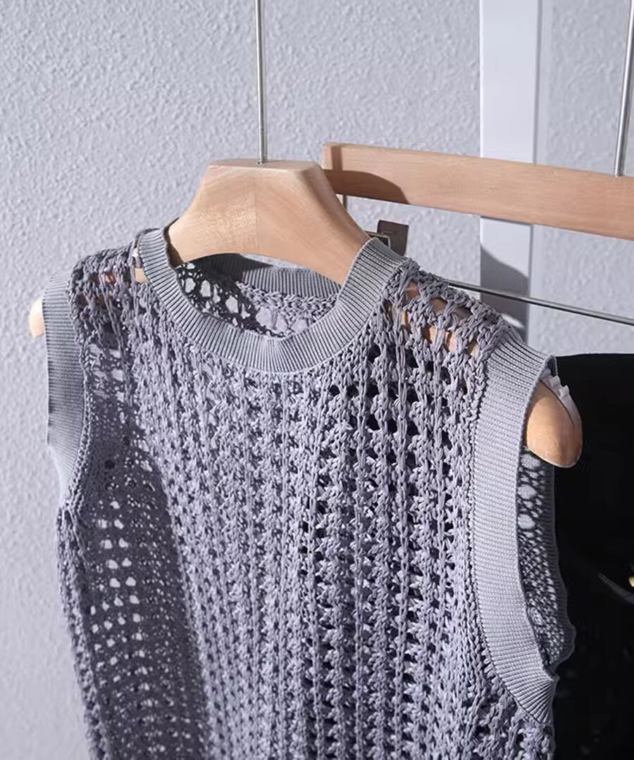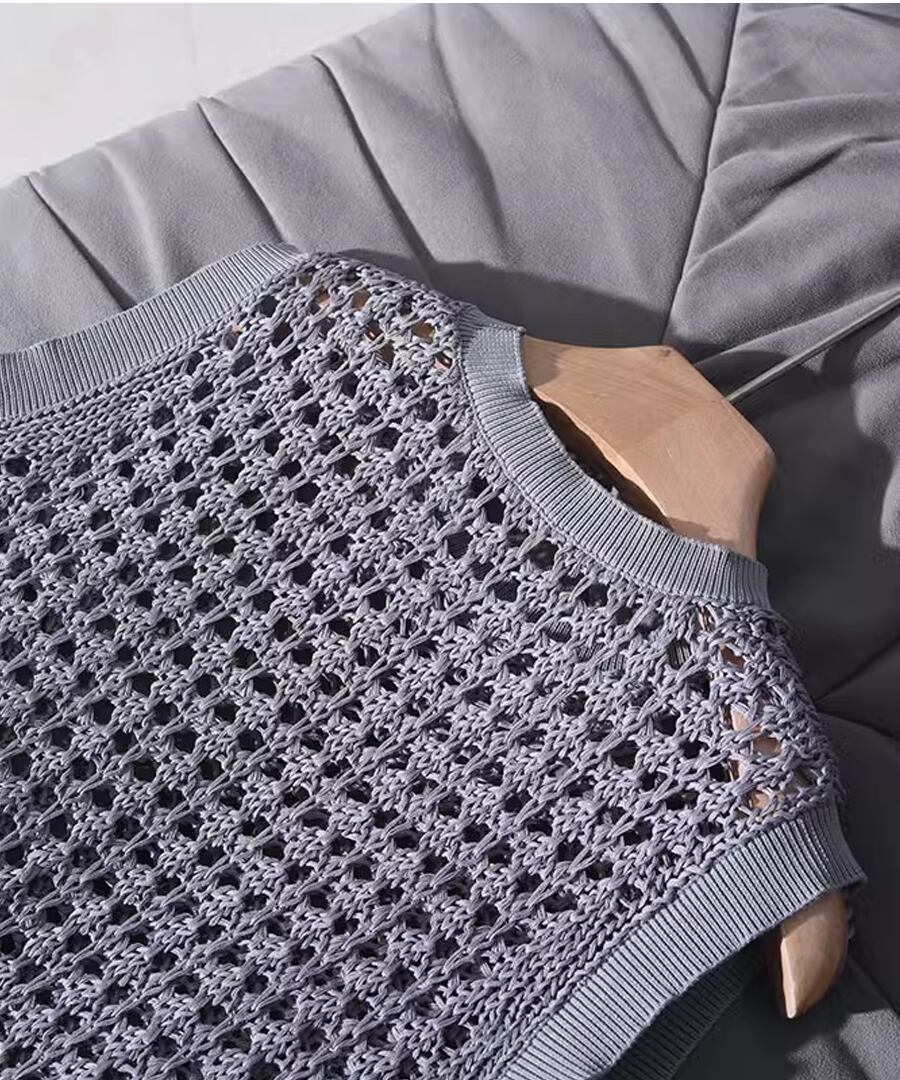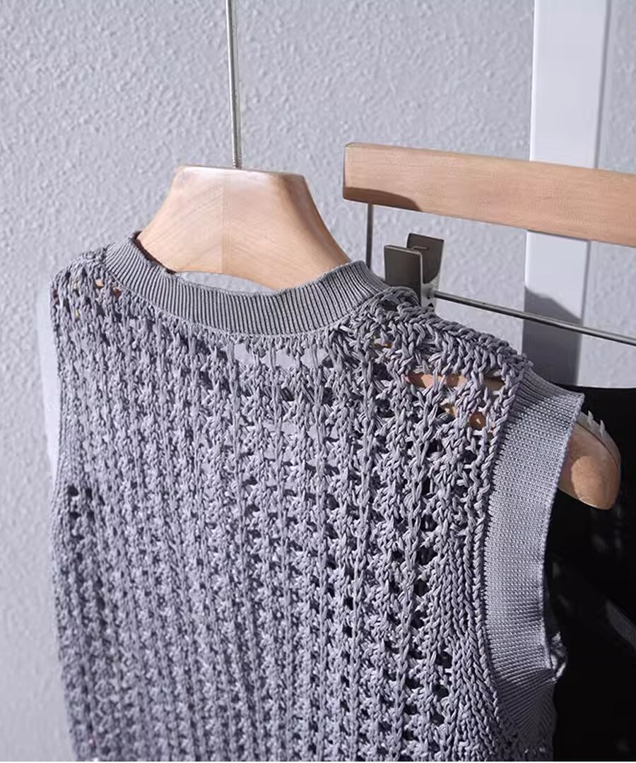 ピュアコットンの麦わら糸を使用した、丈夫で透かし編みのメッシュニットベスト。