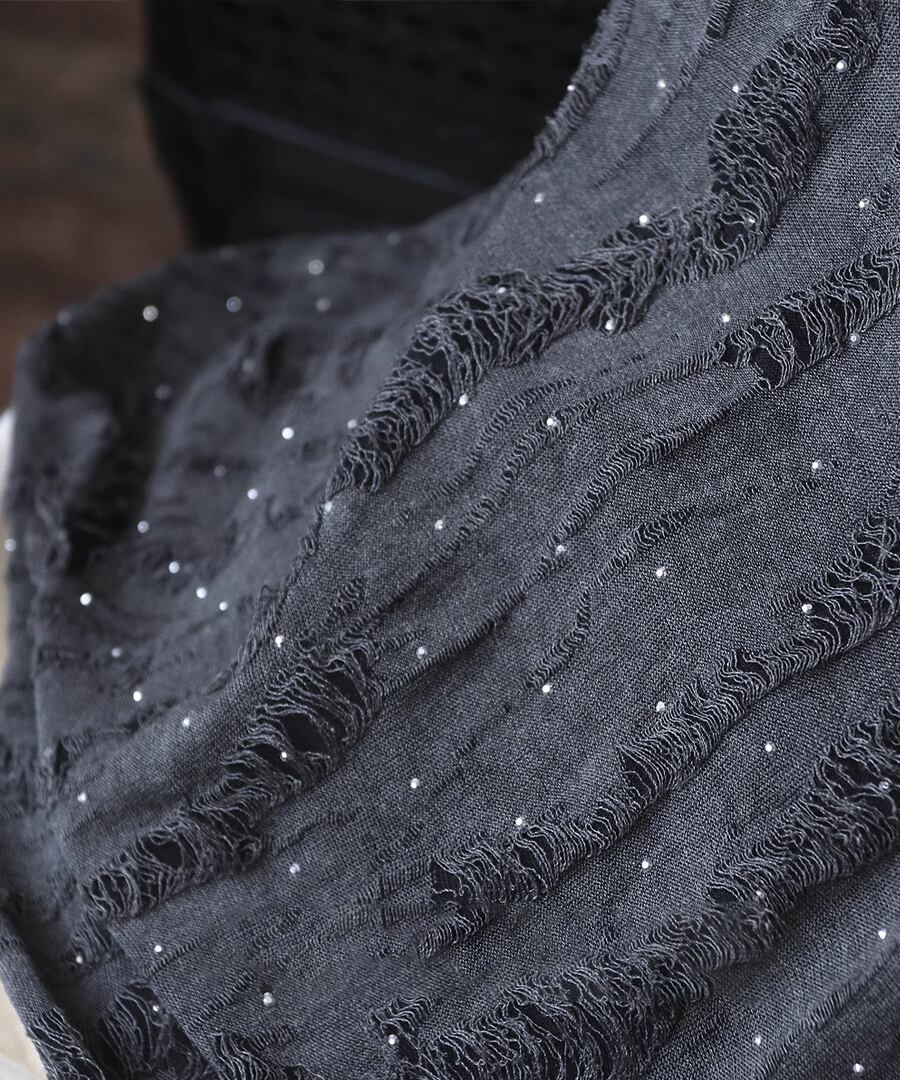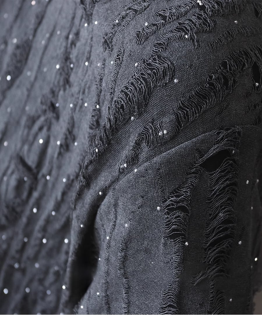 ラインストーンがキラキラ輝く、ラウンドネックトップス。