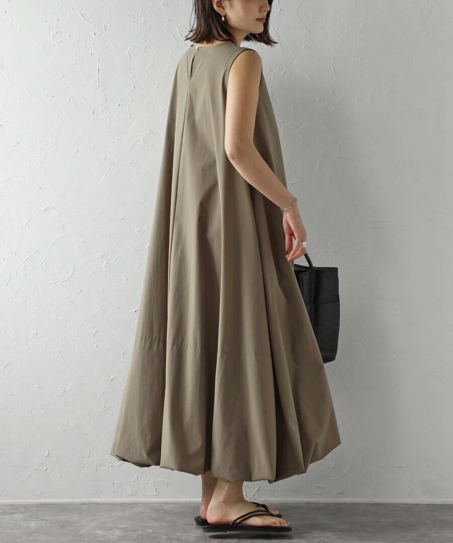 シンプルなノースリーブにAラインのふんわりバルーンシルエットが大人可愛いロングワンピース。