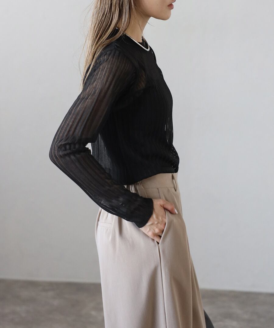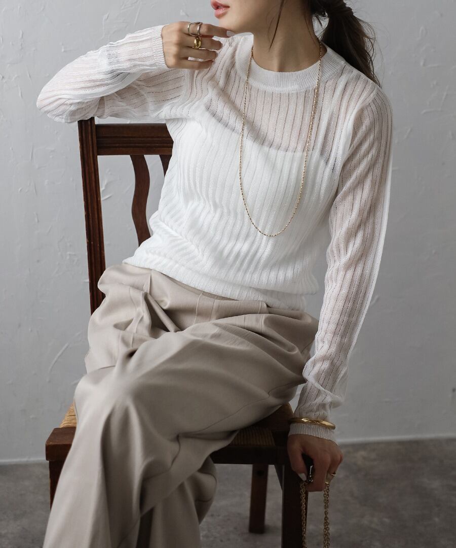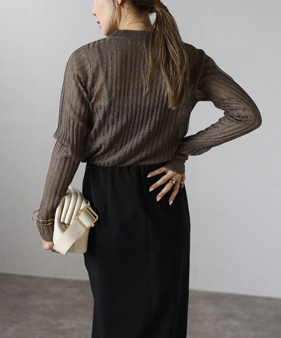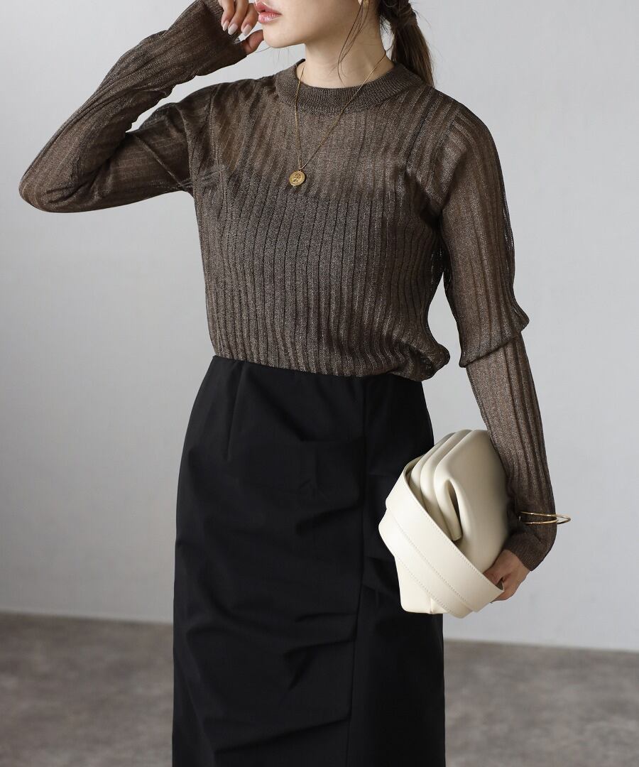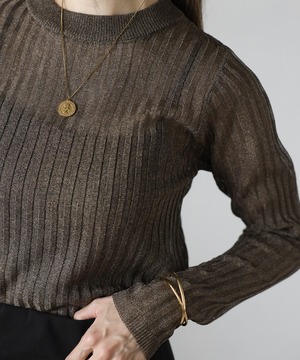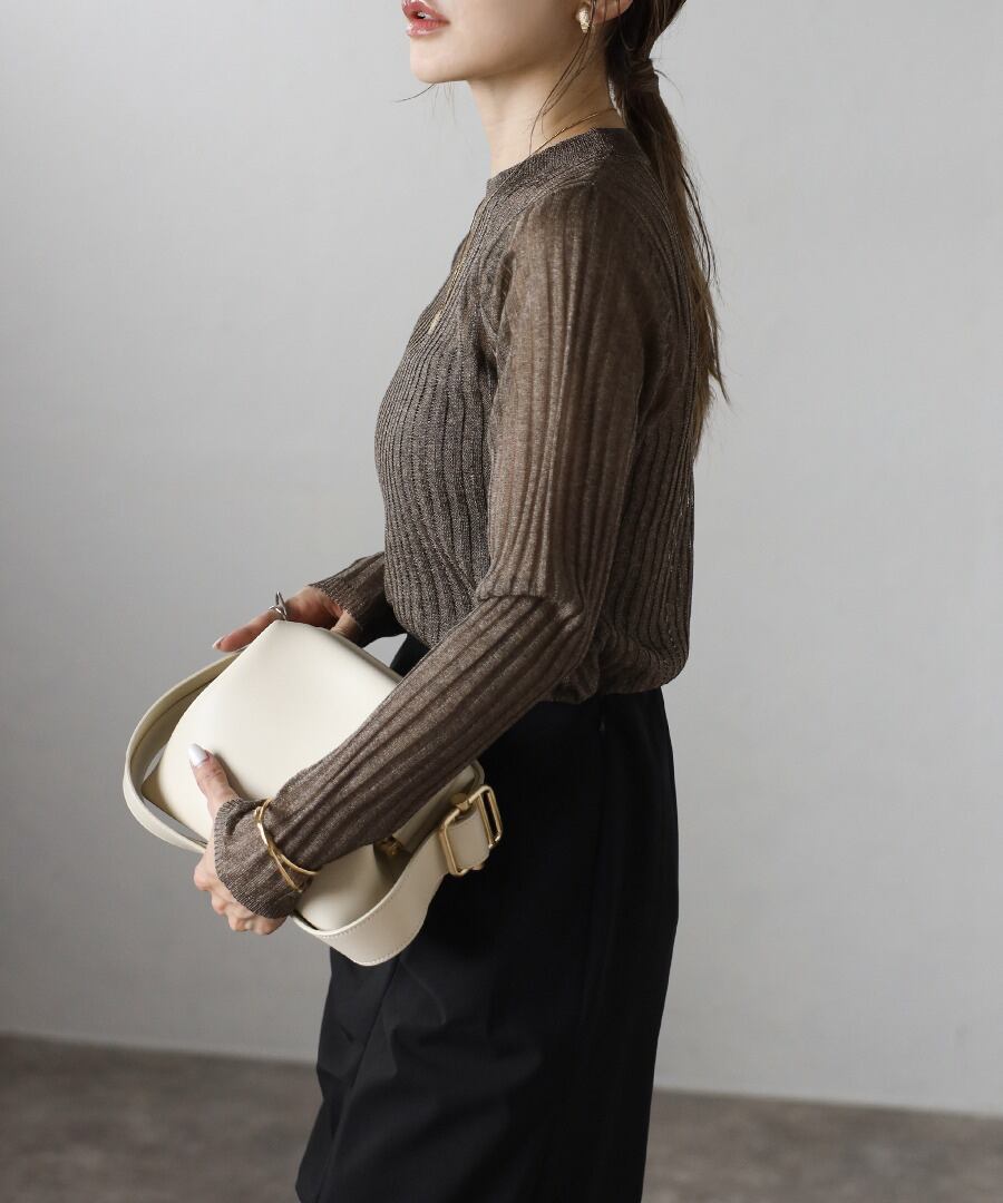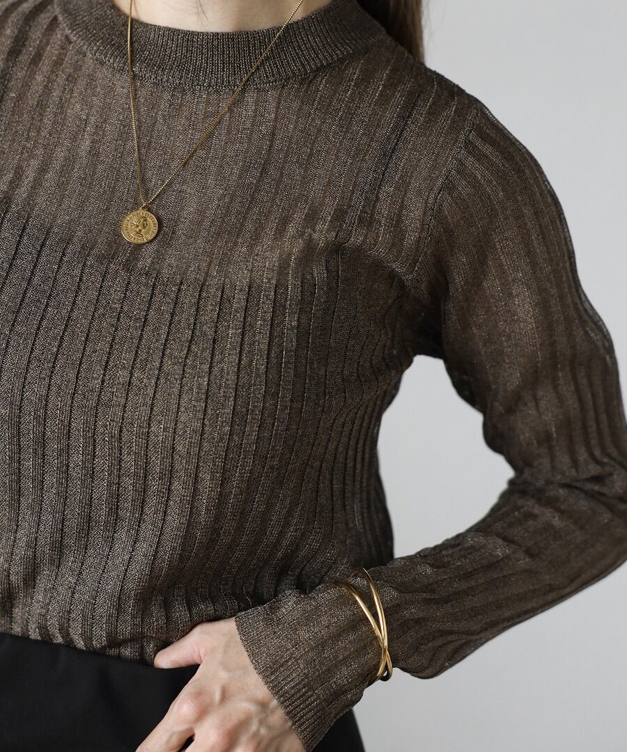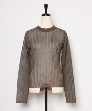 メタリックな輝きが美しいシアー素材のロングスリーブニットT。