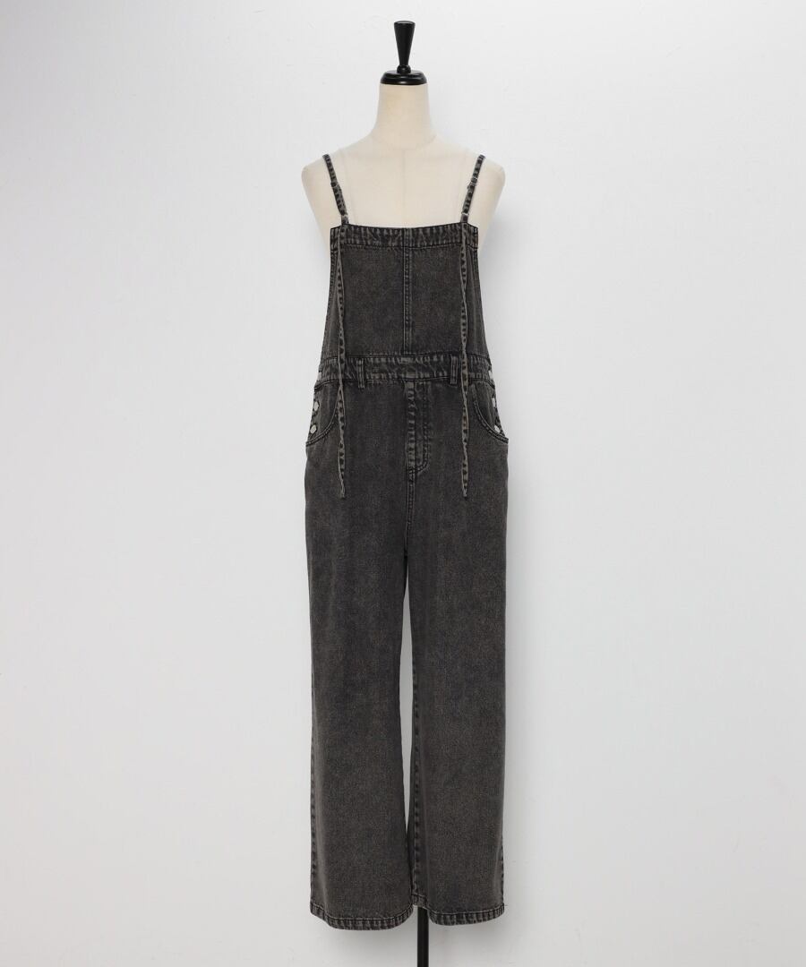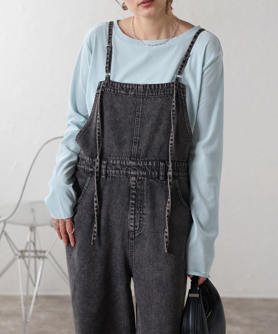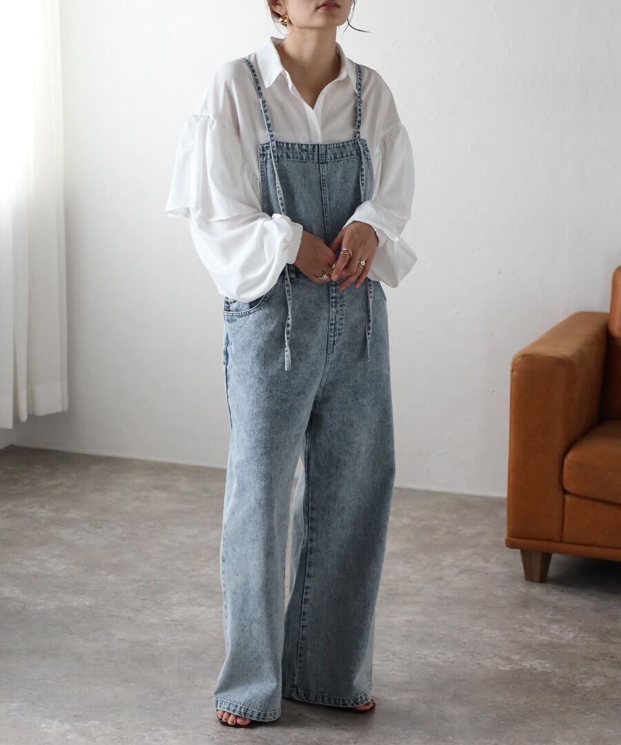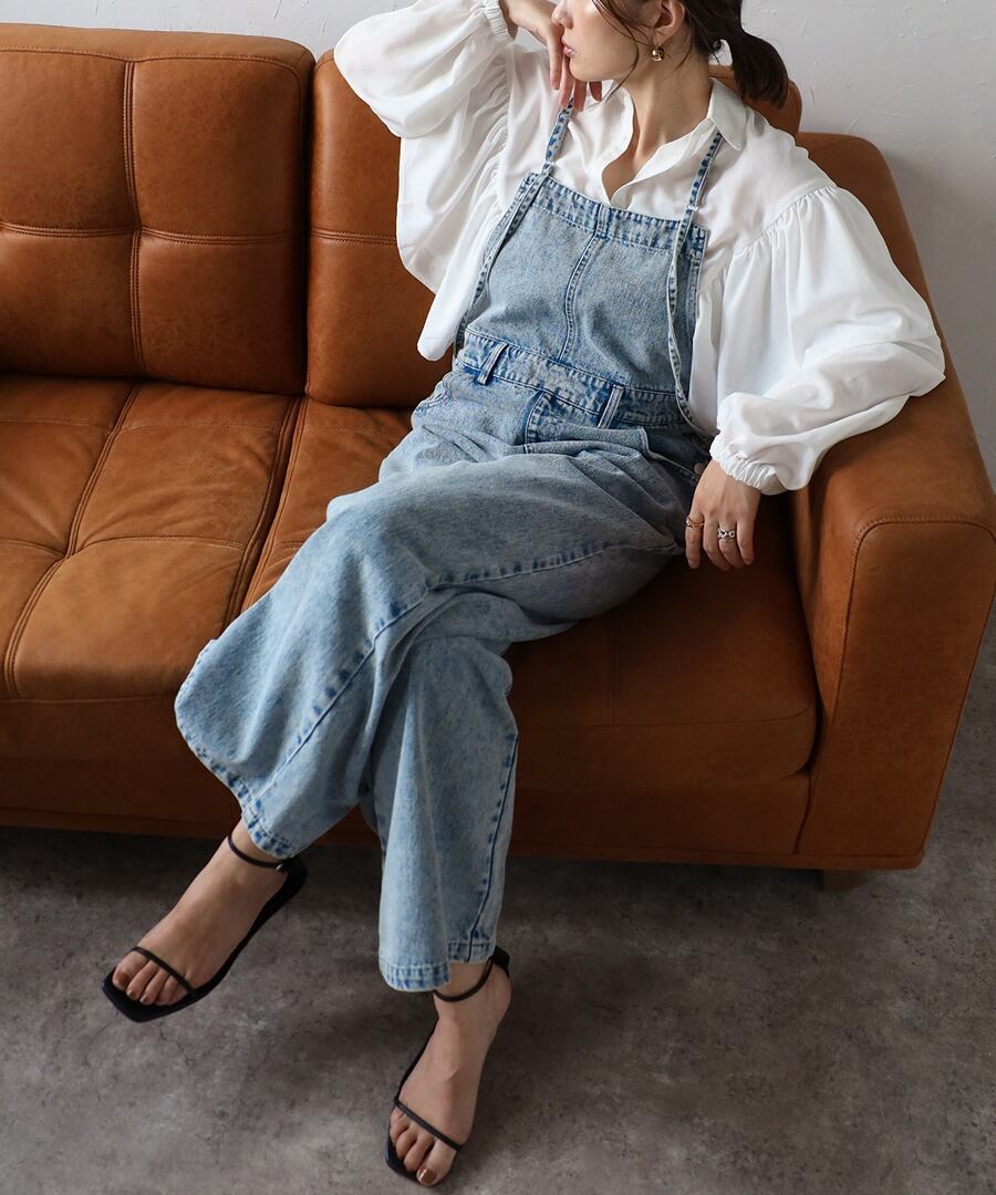 デニム素材を使用したオーバーオールは、カジュアルな装いにぴったり。