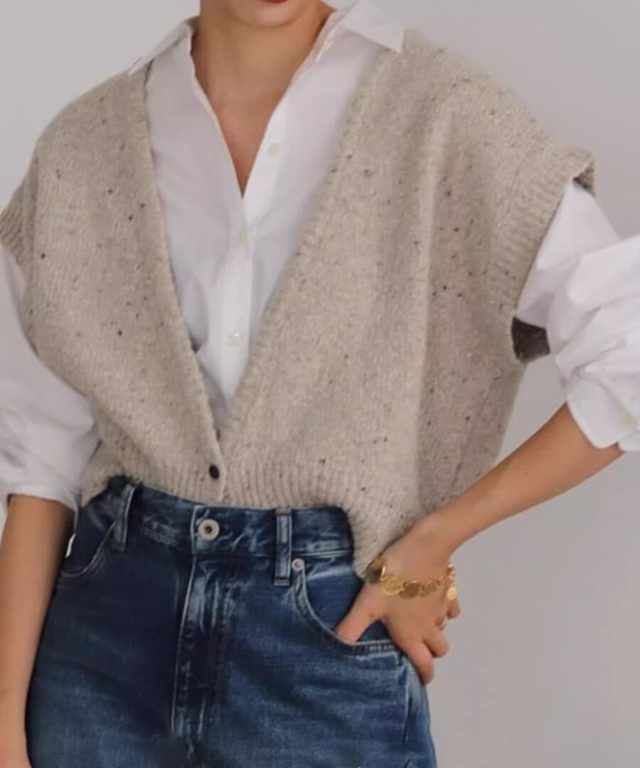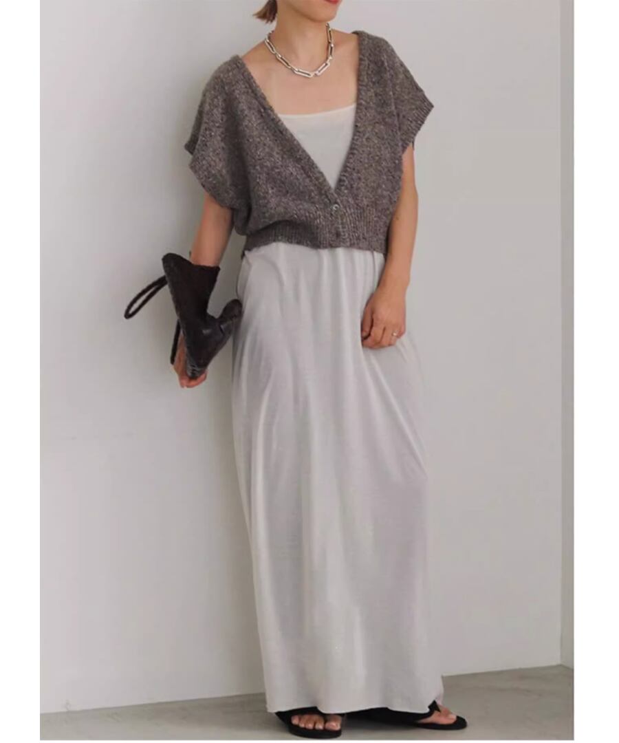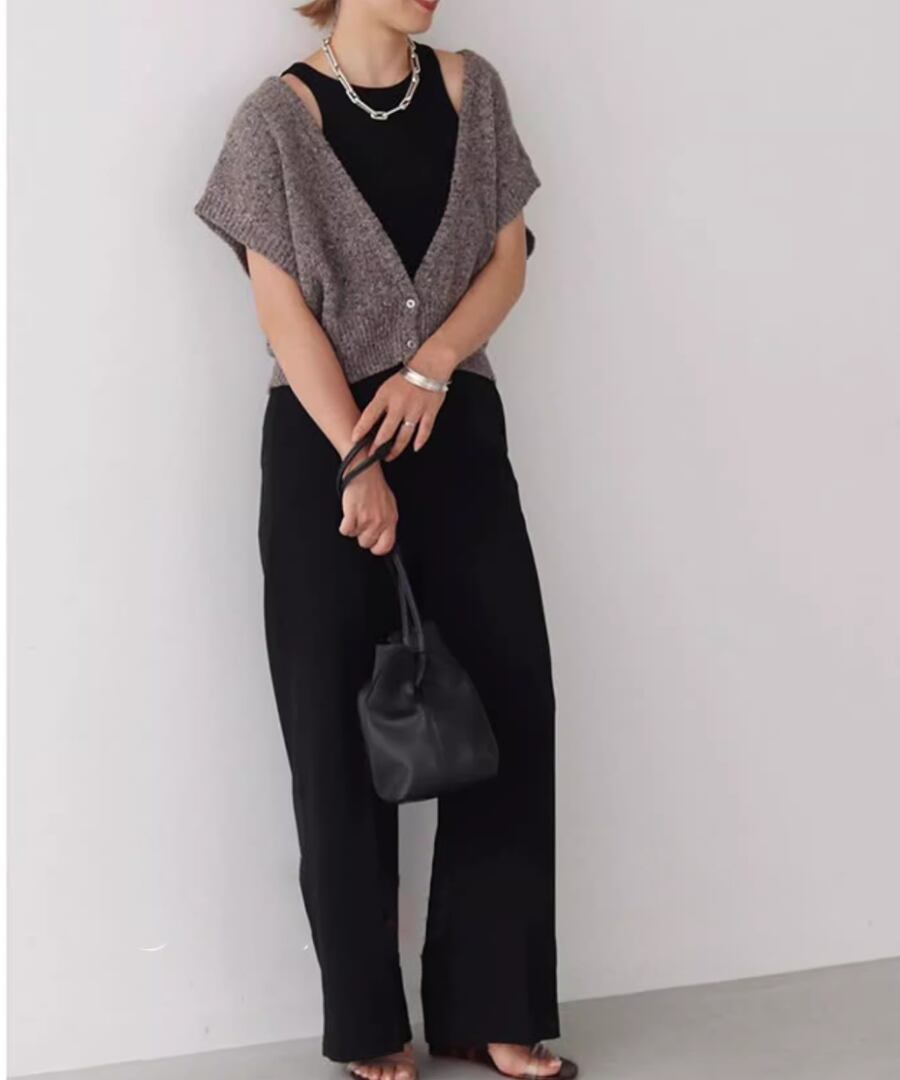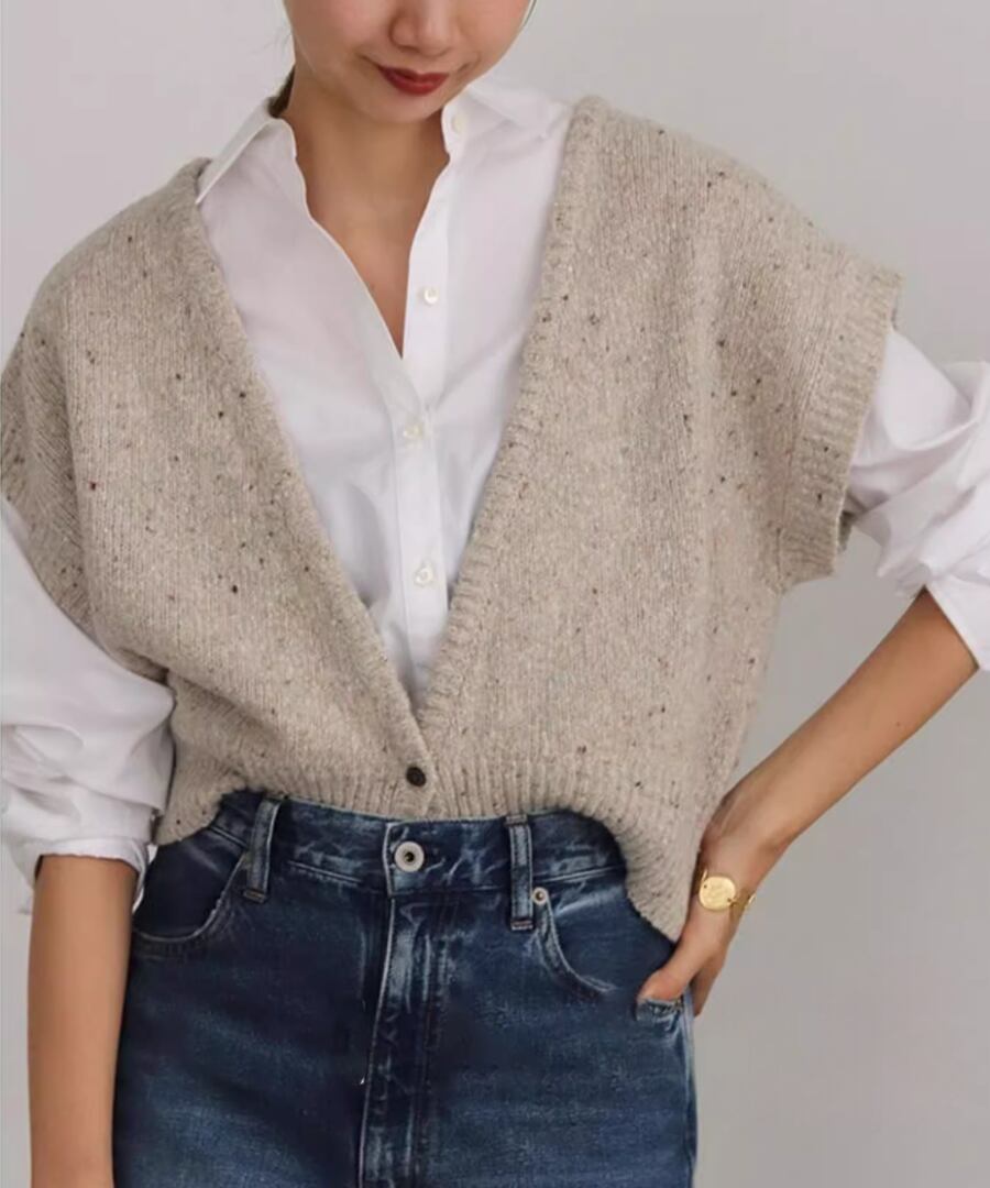 深Vネックニットベストは、トレンド感満載のアイテム。