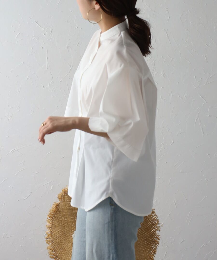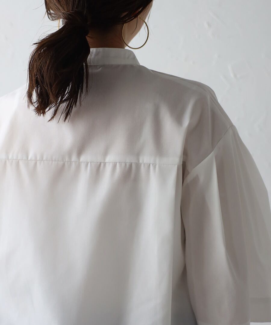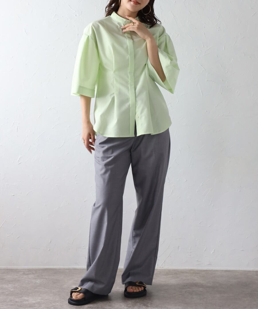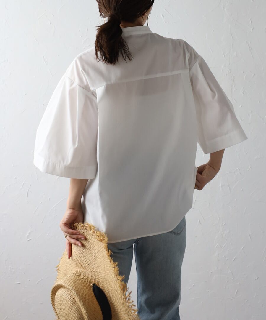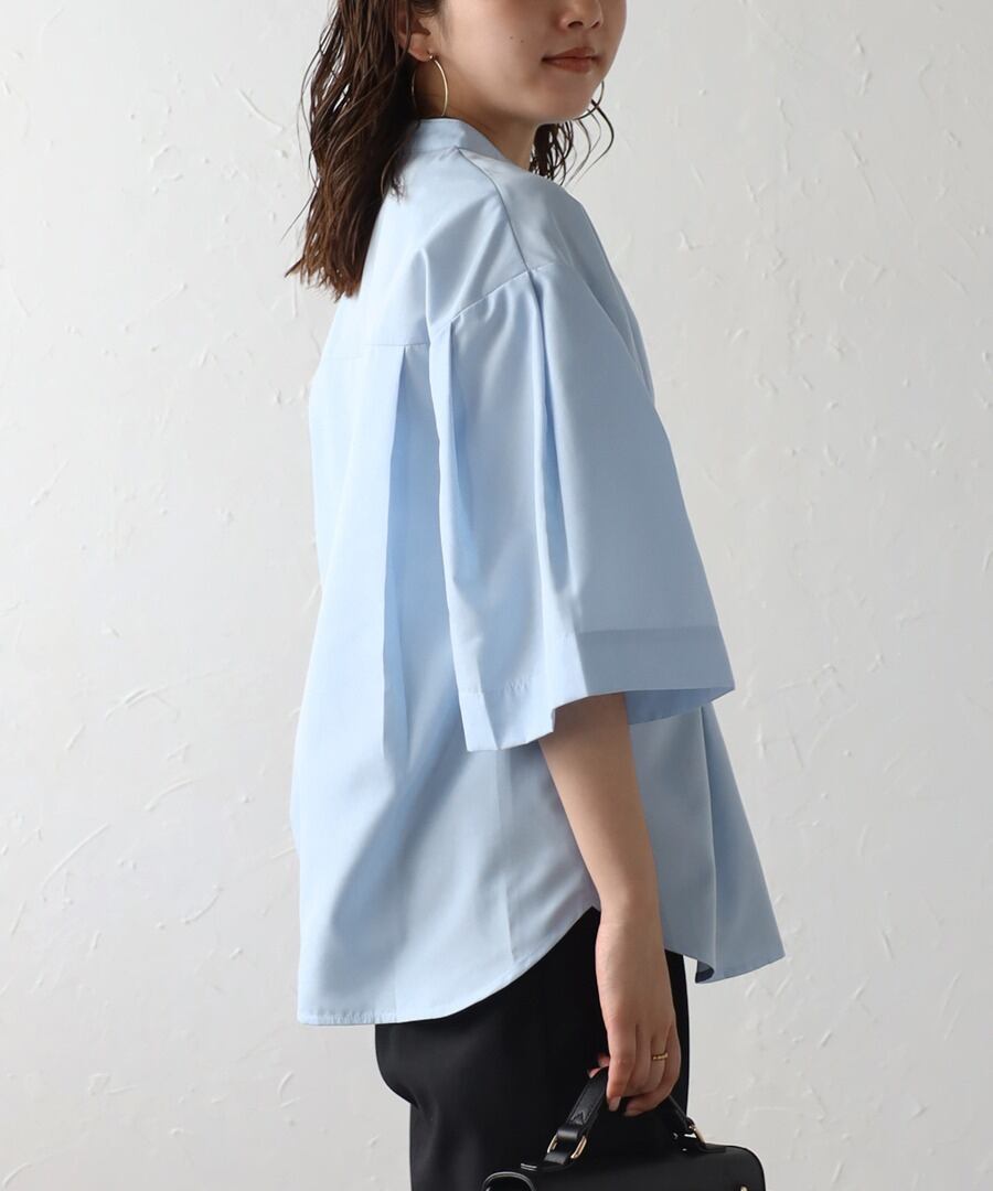 ややフレアのハーフスリーブが女性らしい、上品スタイルに最適なノーカラーシャツ。