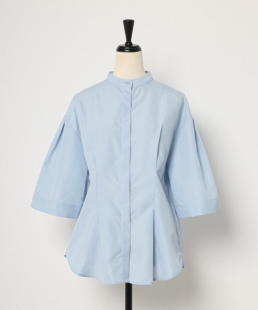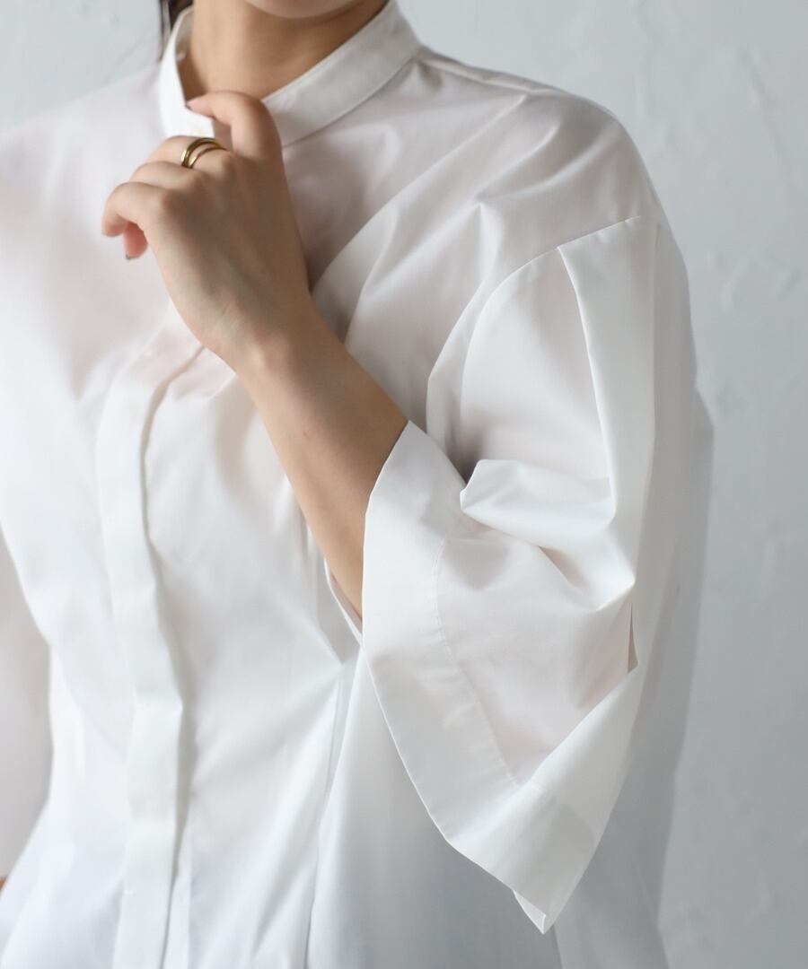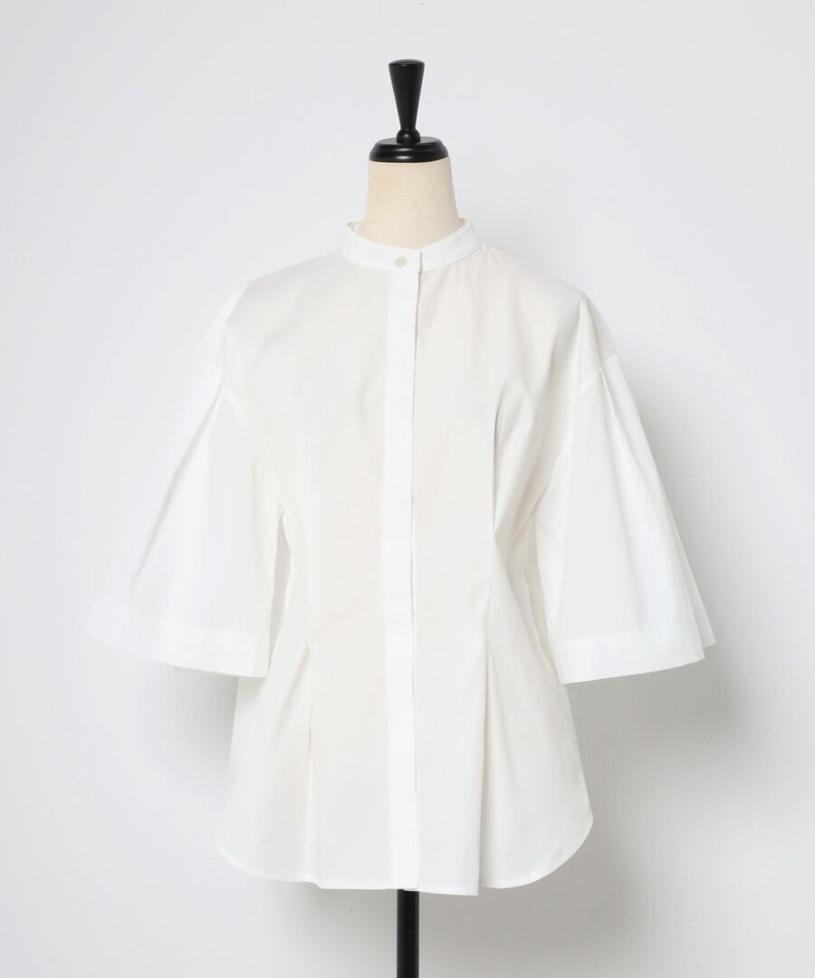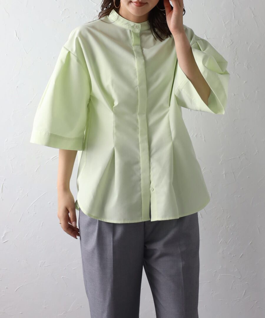 ややフレアのハーフスリーブが女性らしい、上品スタイルに最適なノーカラーシャツ。