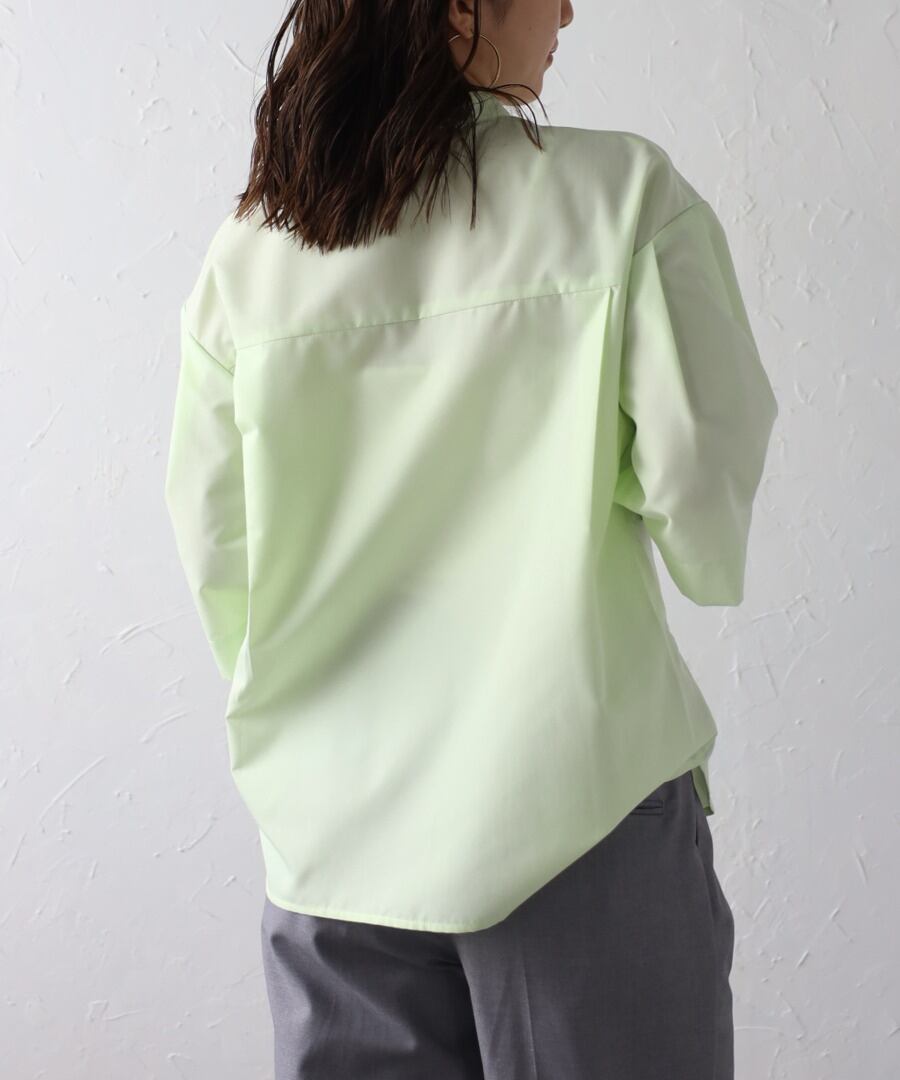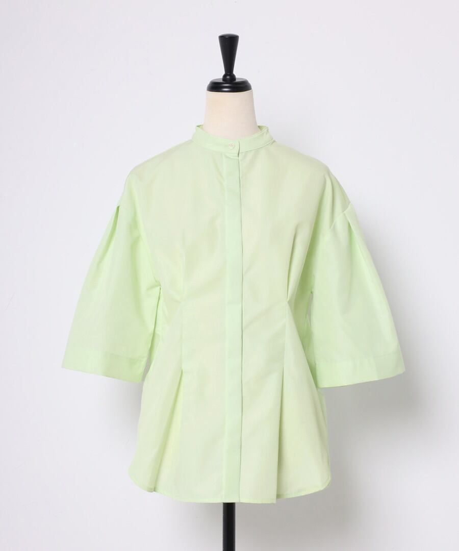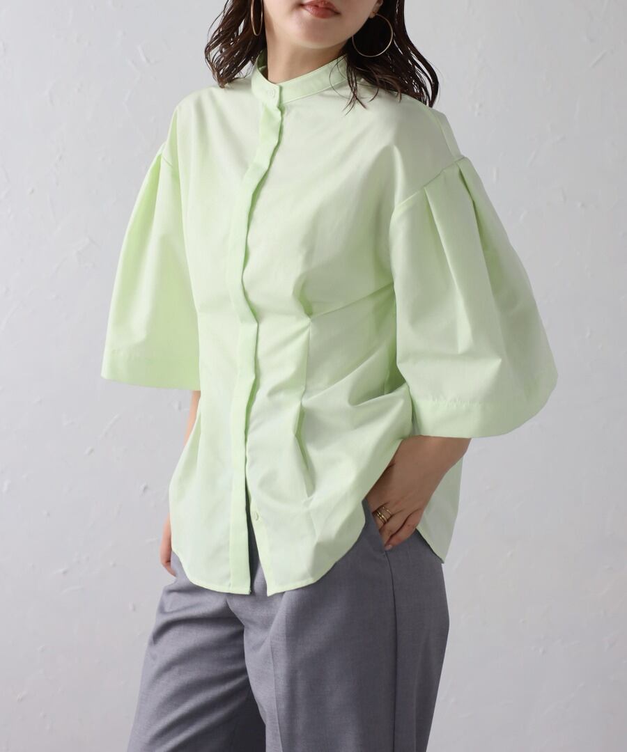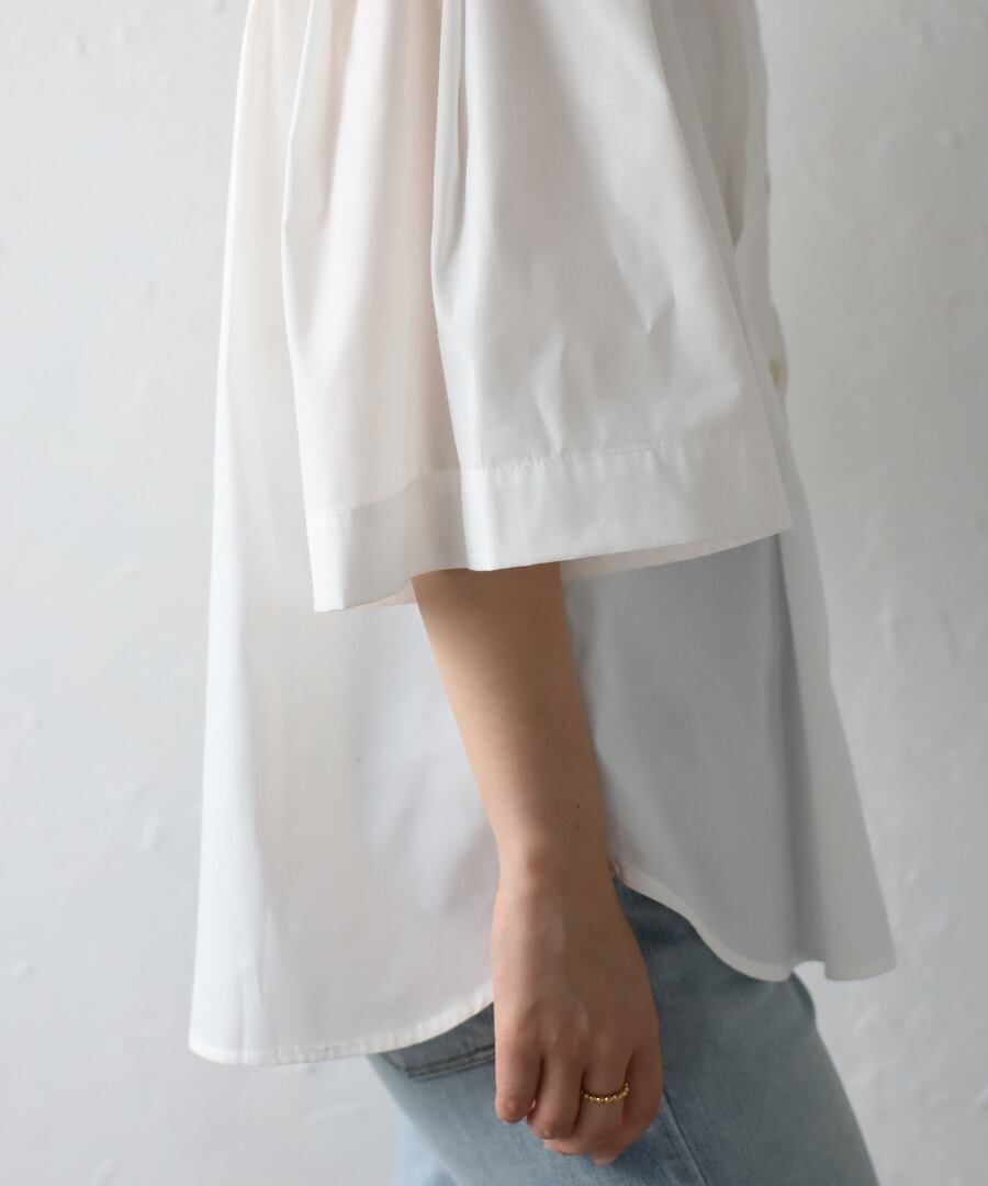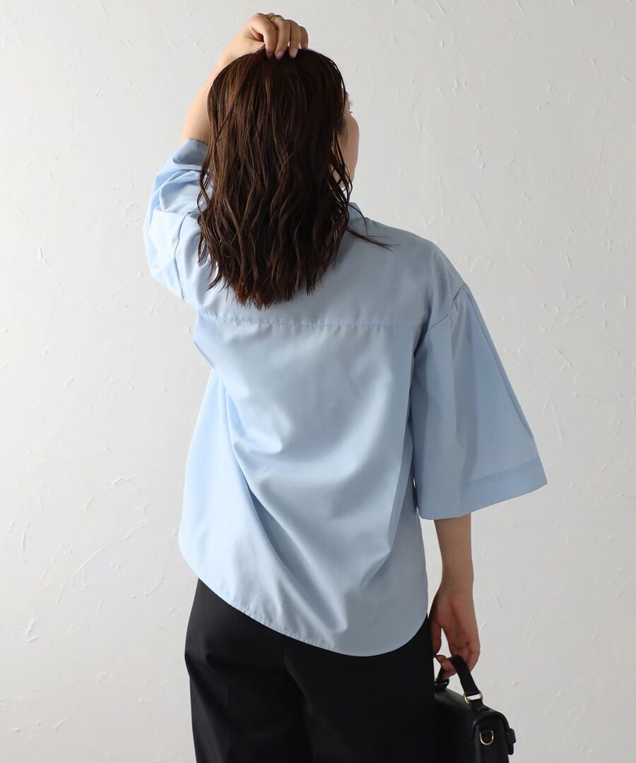 ややフレアのハーフスリーブが女性らしい、上品スタイルに最適なノーカラーシャツ。