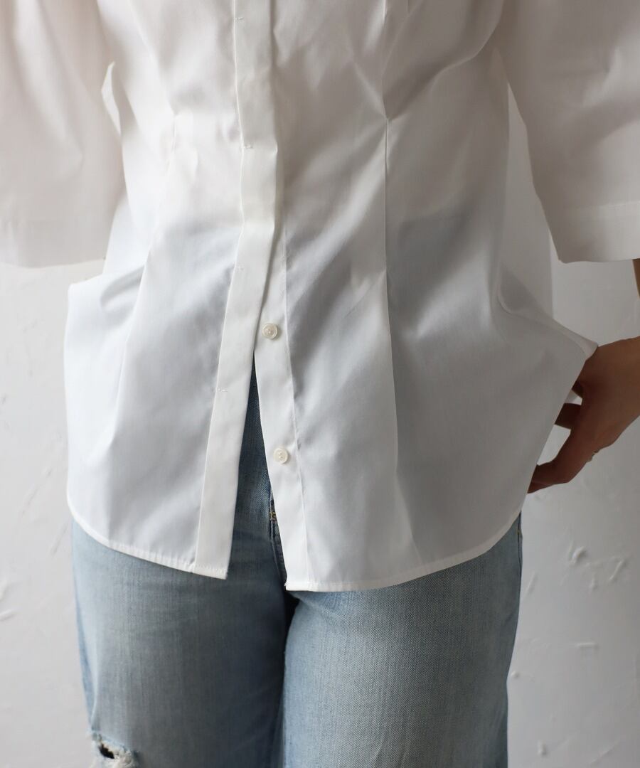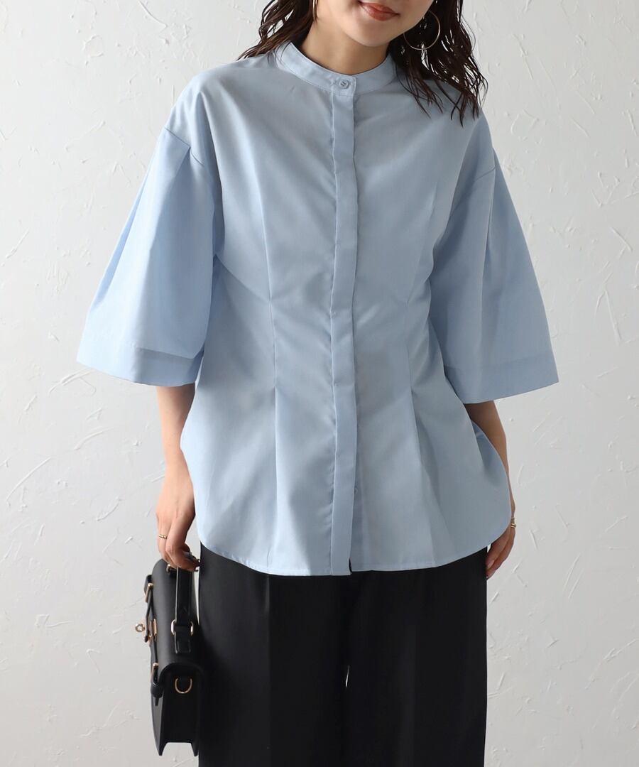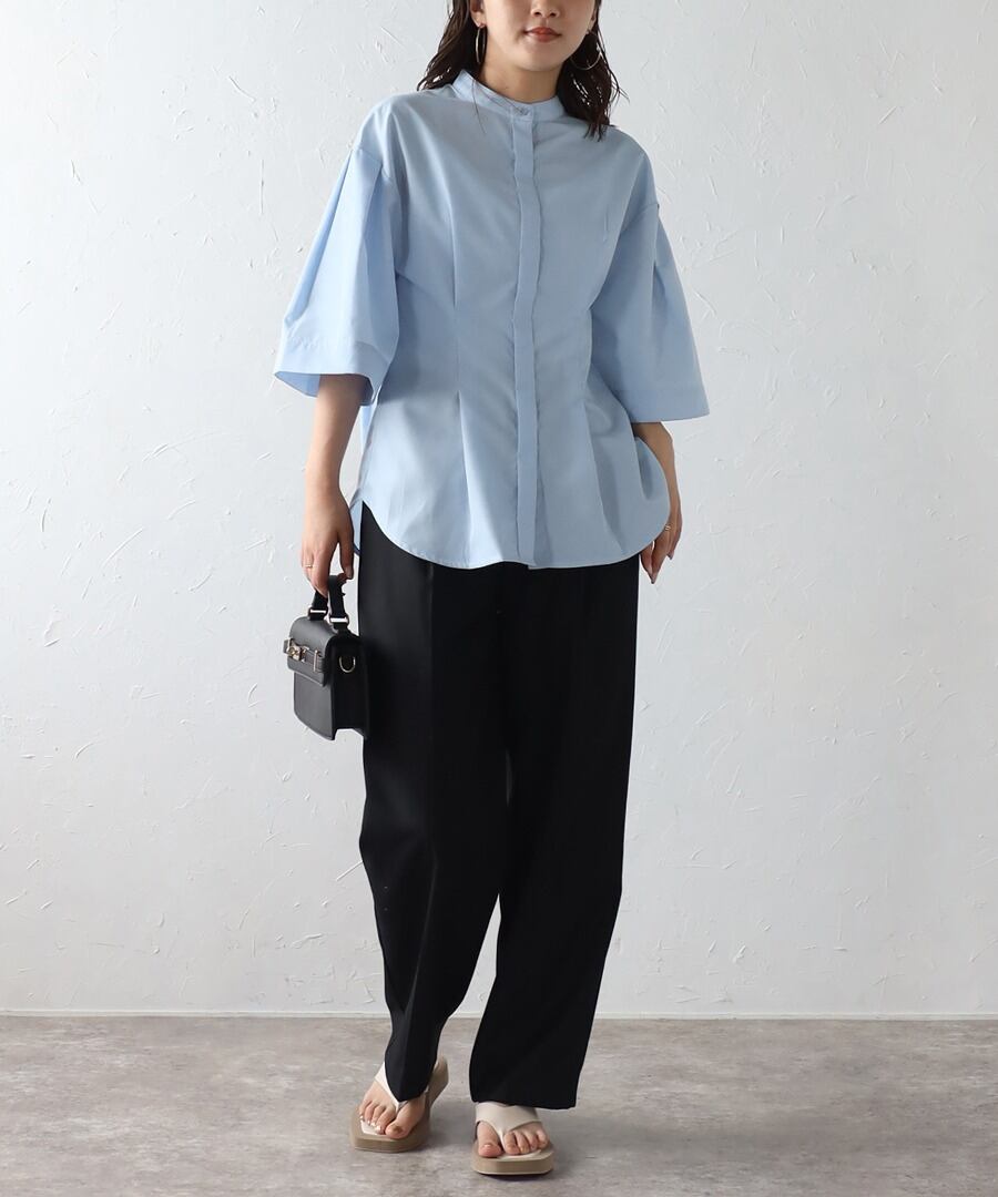 洗練されたシンプルスタイル。リラクシーなバンドカラーウエストタックシャツ