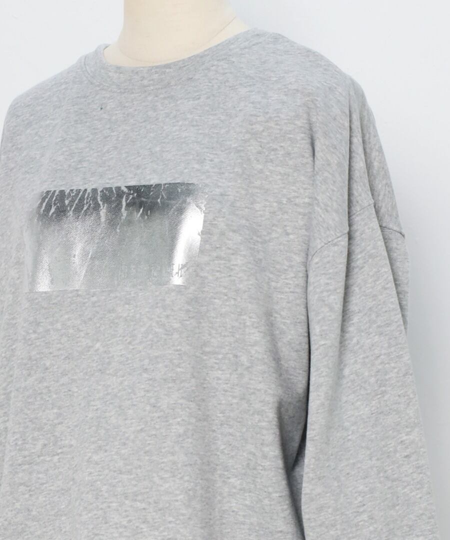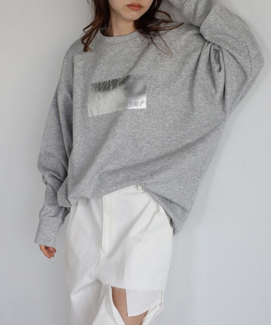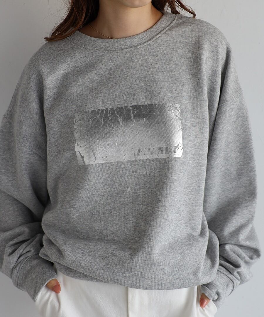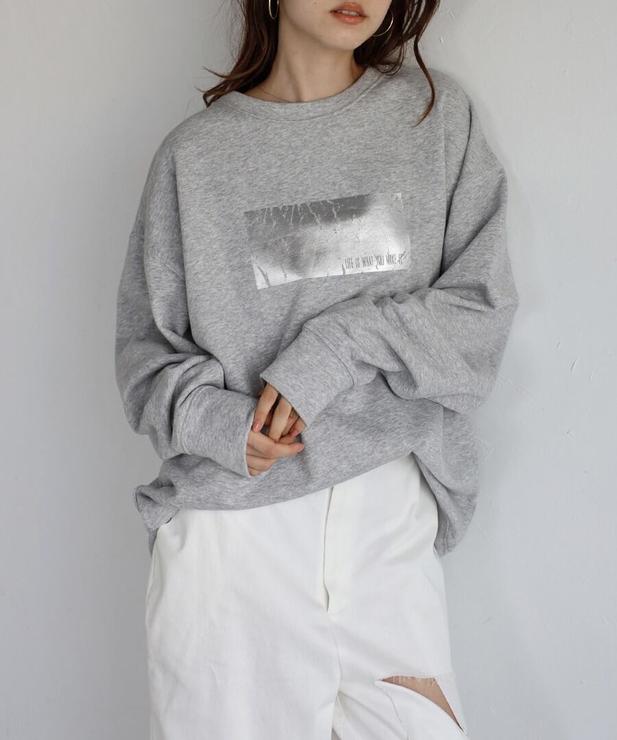 トレンド感溢れるオーバーサイズのスウェットに、箔プリントがアクセントとして施された一着。